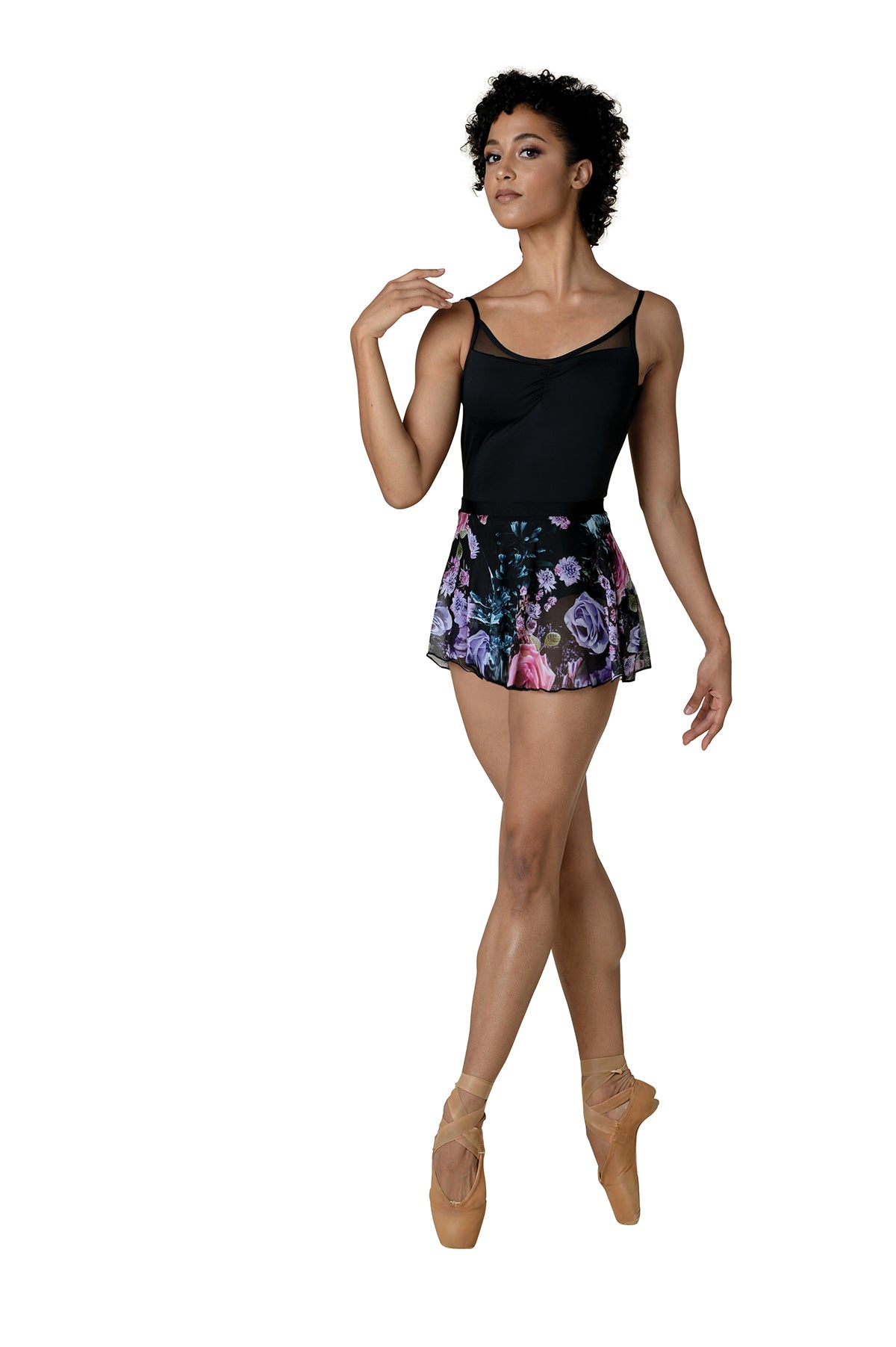 Add color to any leotard with our beautiful floral circle pull-on mini skirts. Skirts are made from soft mesh and have no elastic in waist for a smooth finish. Sides of skirt are slightly higher than front/back, to elongate legs and the edge of skirt is surged. Coordinates beautifully with the matching leotards. Polyester/Spandex