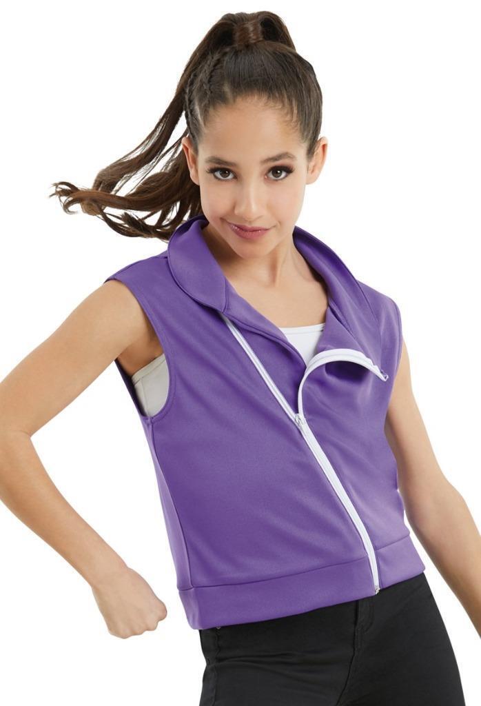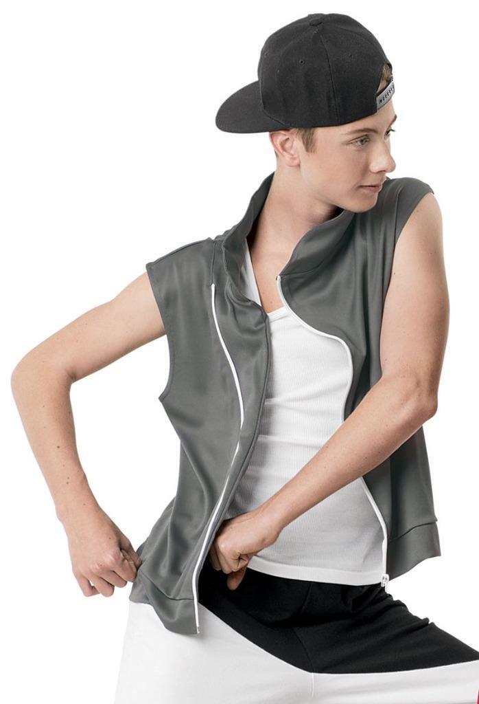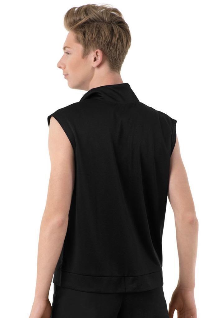 Sleeveless vest with a stand-up asymmetric collar and zipper. Unisex. Imported.