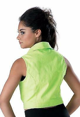 Top off any routine with this moto-style, cropped denim vest featuring front and back princess seams, zipper pocket details and snap detail on the notched collar. Front zipper closure allows for quick stage changes. Imported. Fabric : Denim: Cotton/Polyester/Spandex;