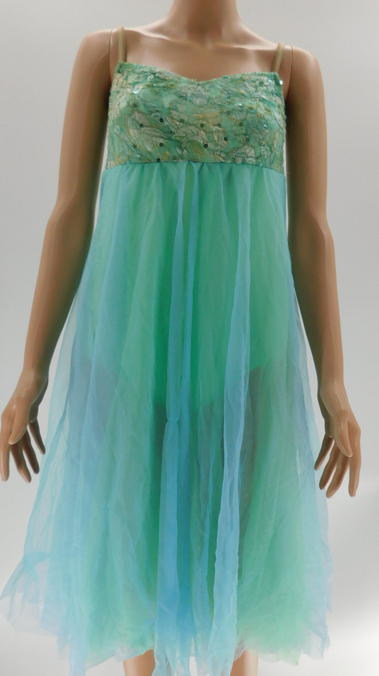 Camisole style leotard with lace and sequined bodice and attached long, flowy tulle skirt. Matching fabric accessories and floral hair accessories are included.