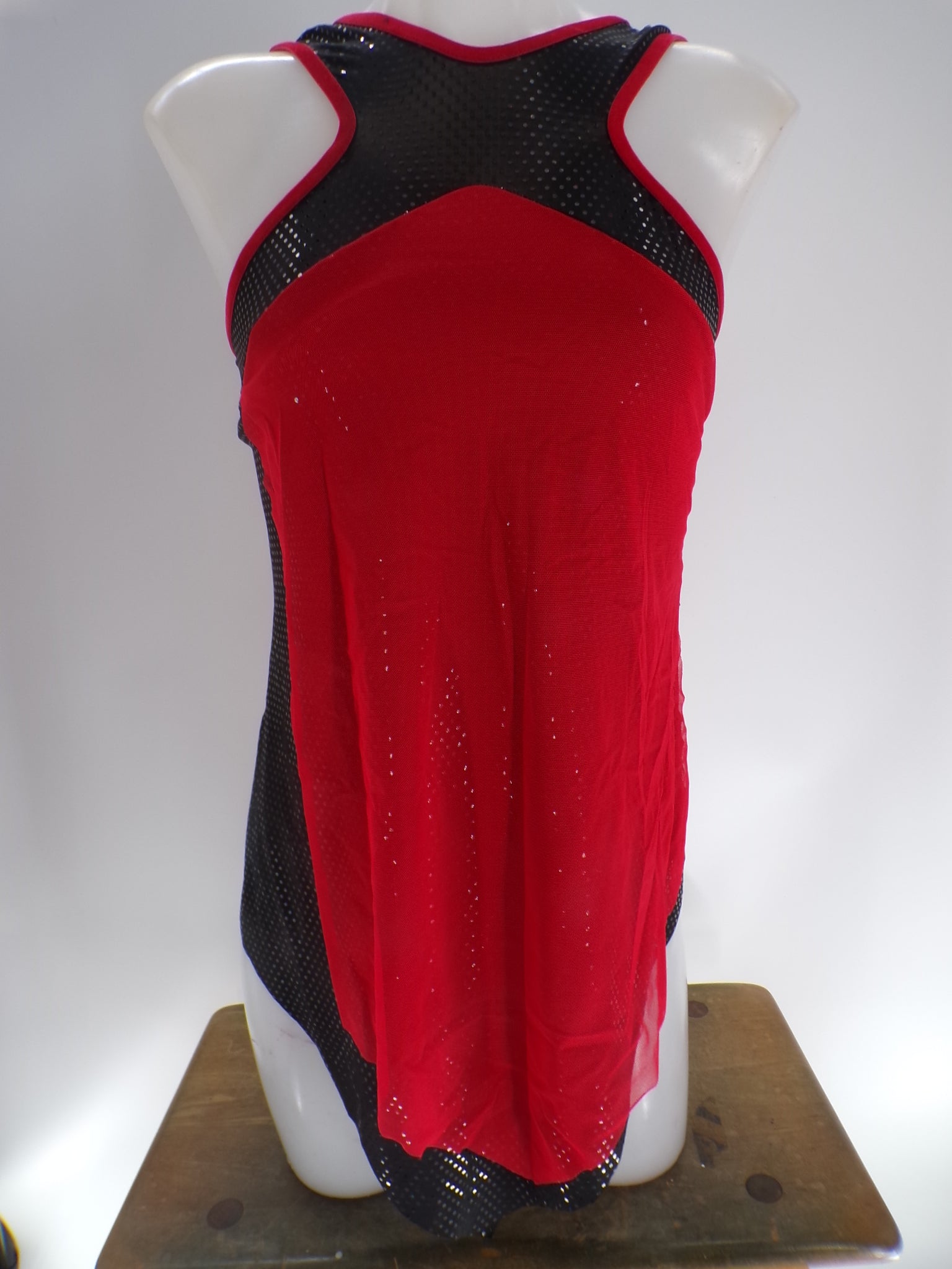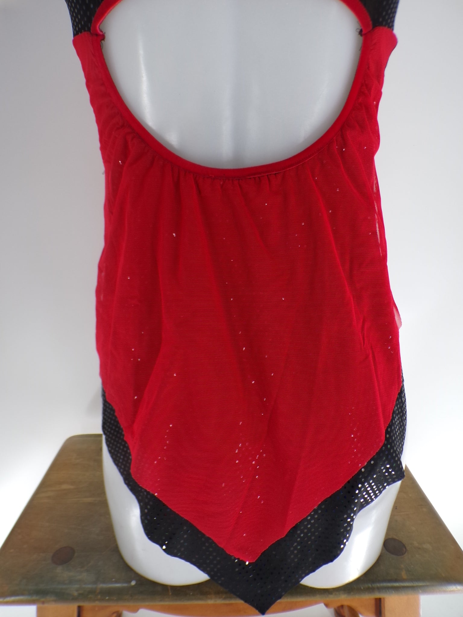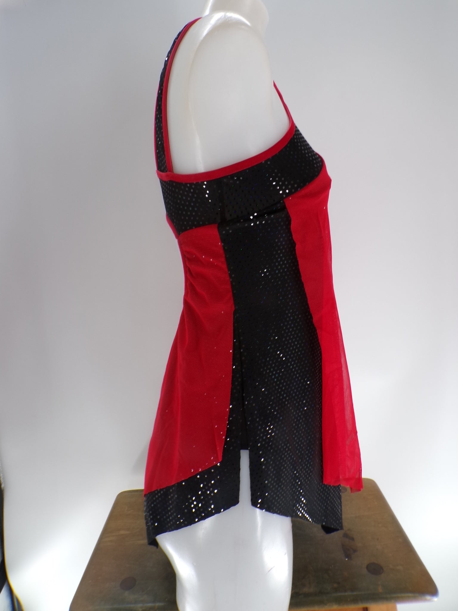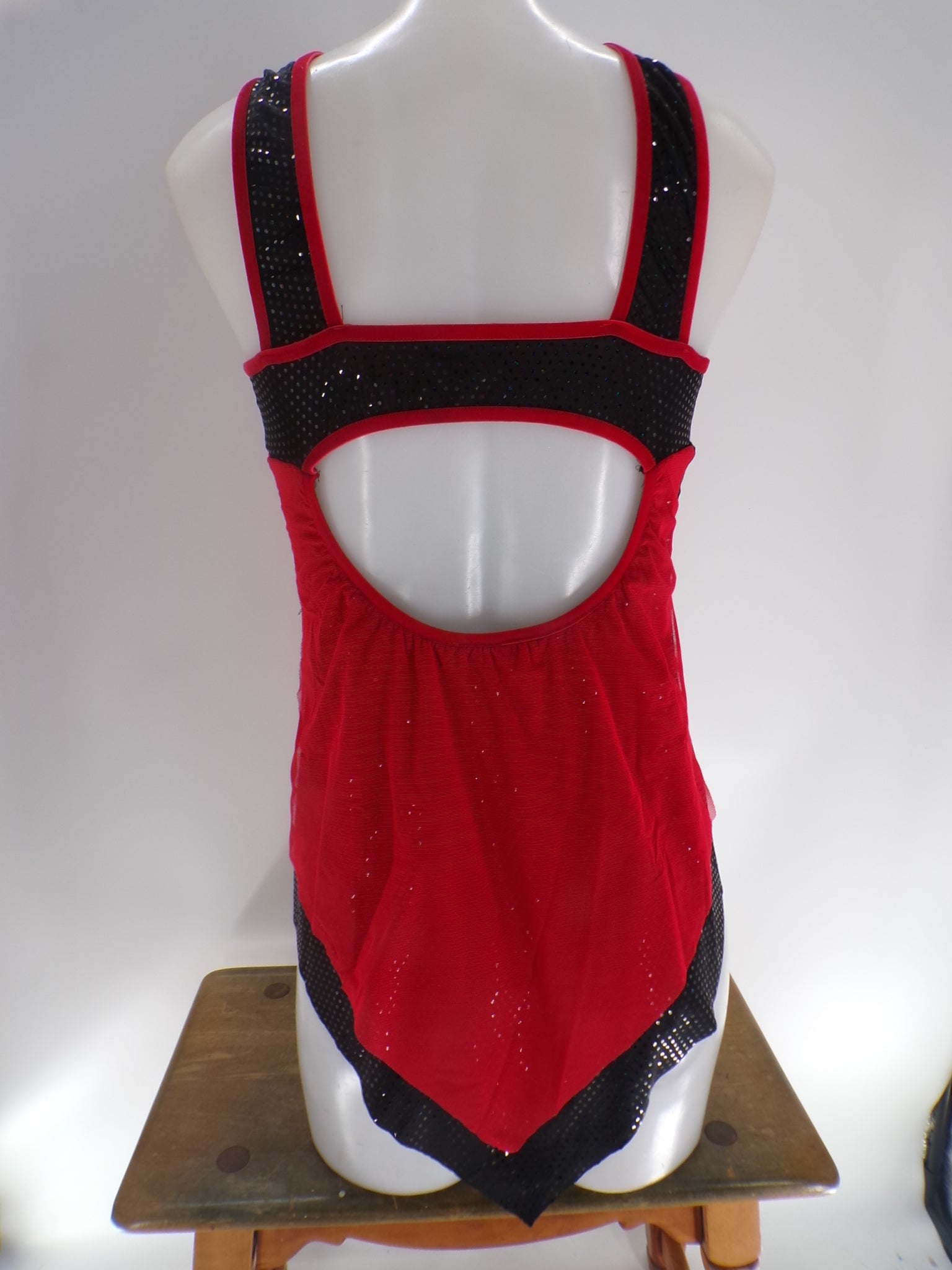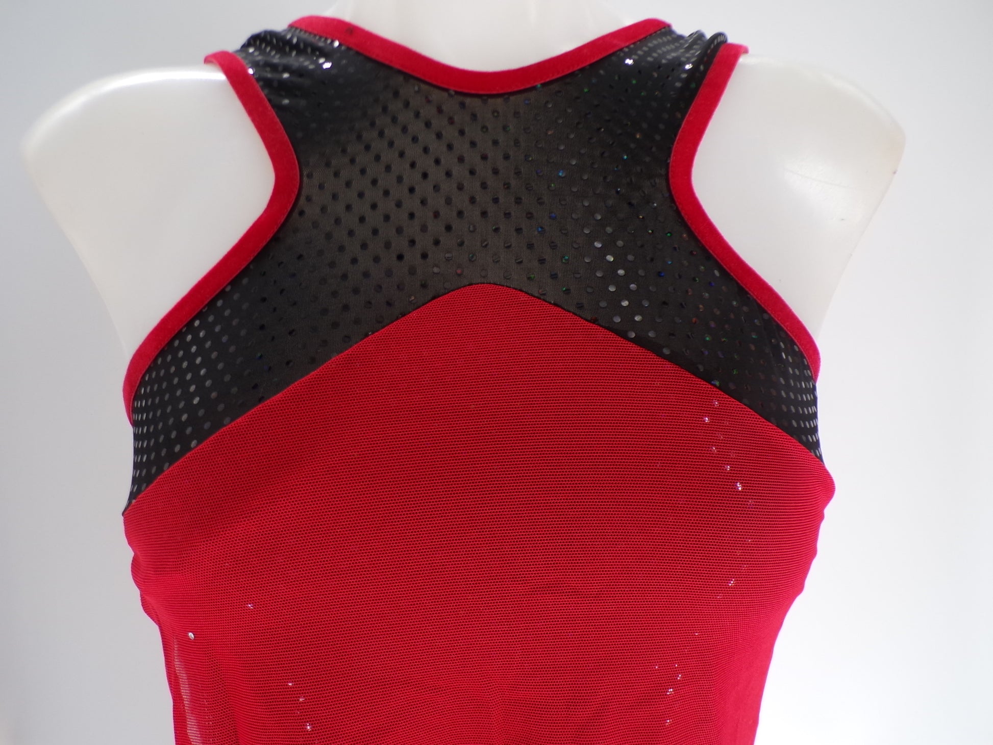 Spandex leotard with mesh and foil dot sequin dress overlay. Velvet trimmed. Open back,