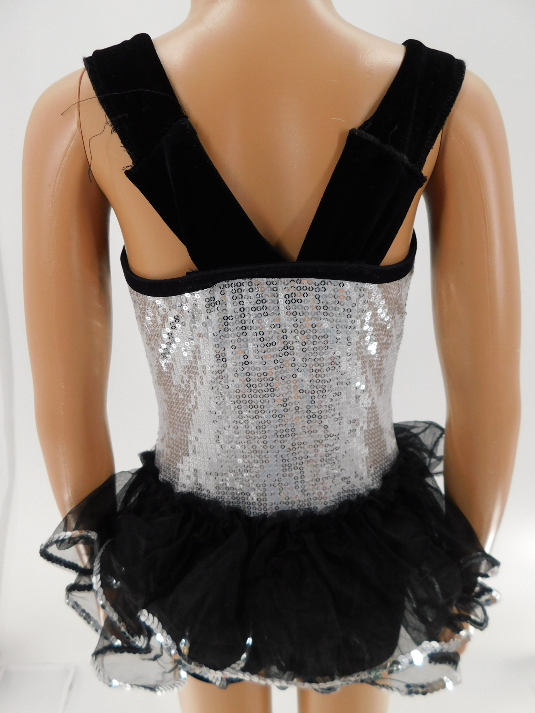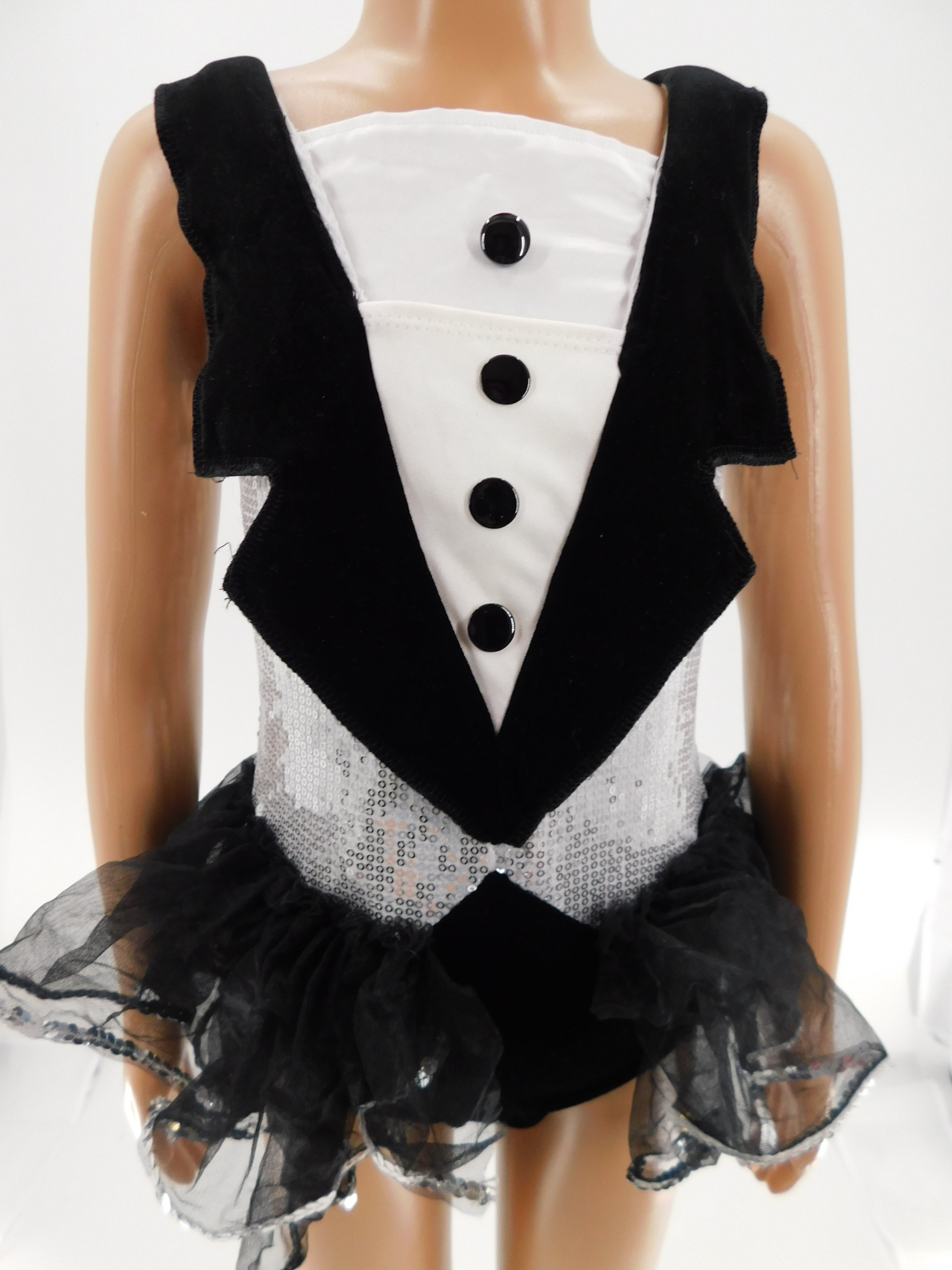 Black Velvet Leotard with Tuxedo styling - Bodice is silver Sequin, added extra white at the neckline to make it higher (Easily removeable) Black Velvet Lapel and Tulle 3/4 skirt with silver sequin trim