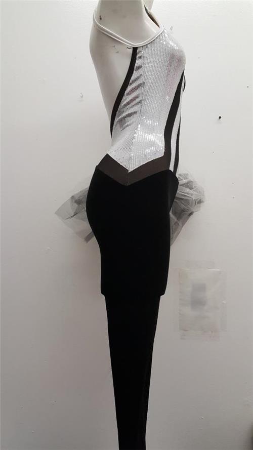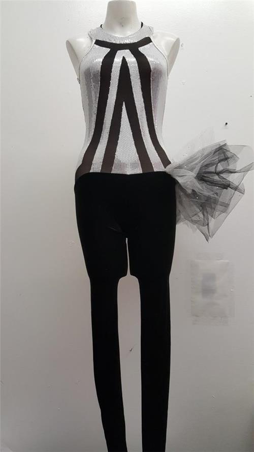 Stunning Black Velvet Unitard with Sequin bodice, halter/camisole neck with White and Black Glitter Tulle bustle on the side. Includes piece of silver sequin fabric to wear as hair accessory.
