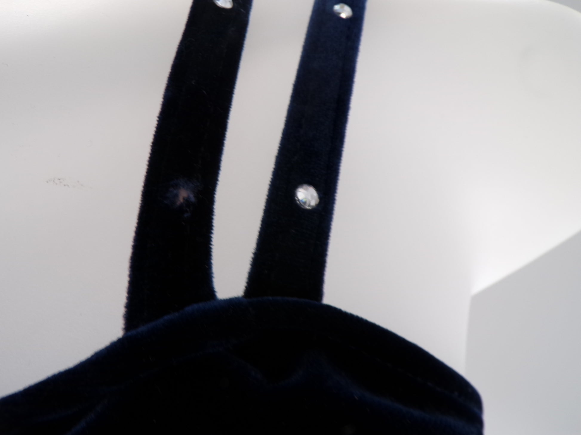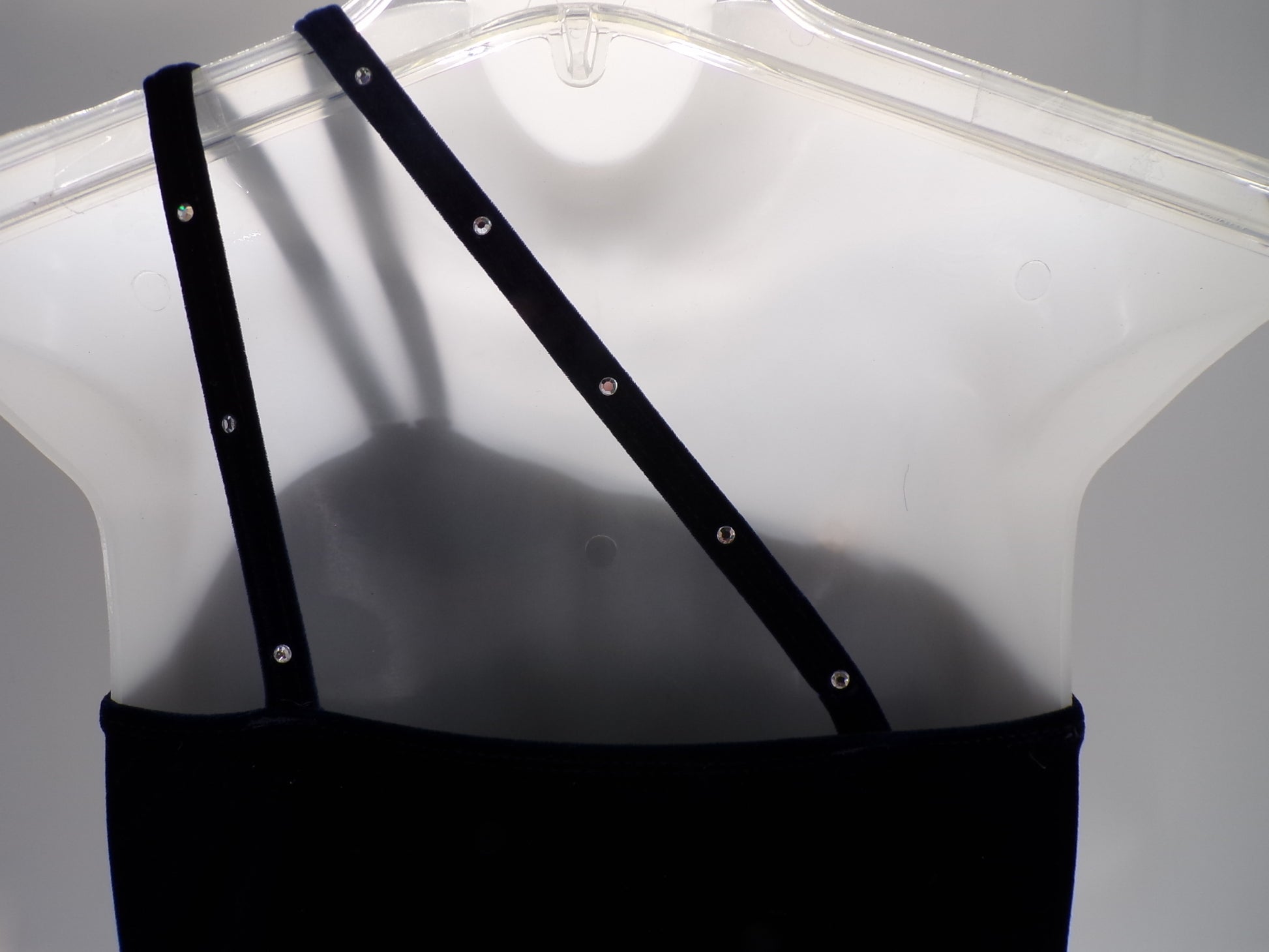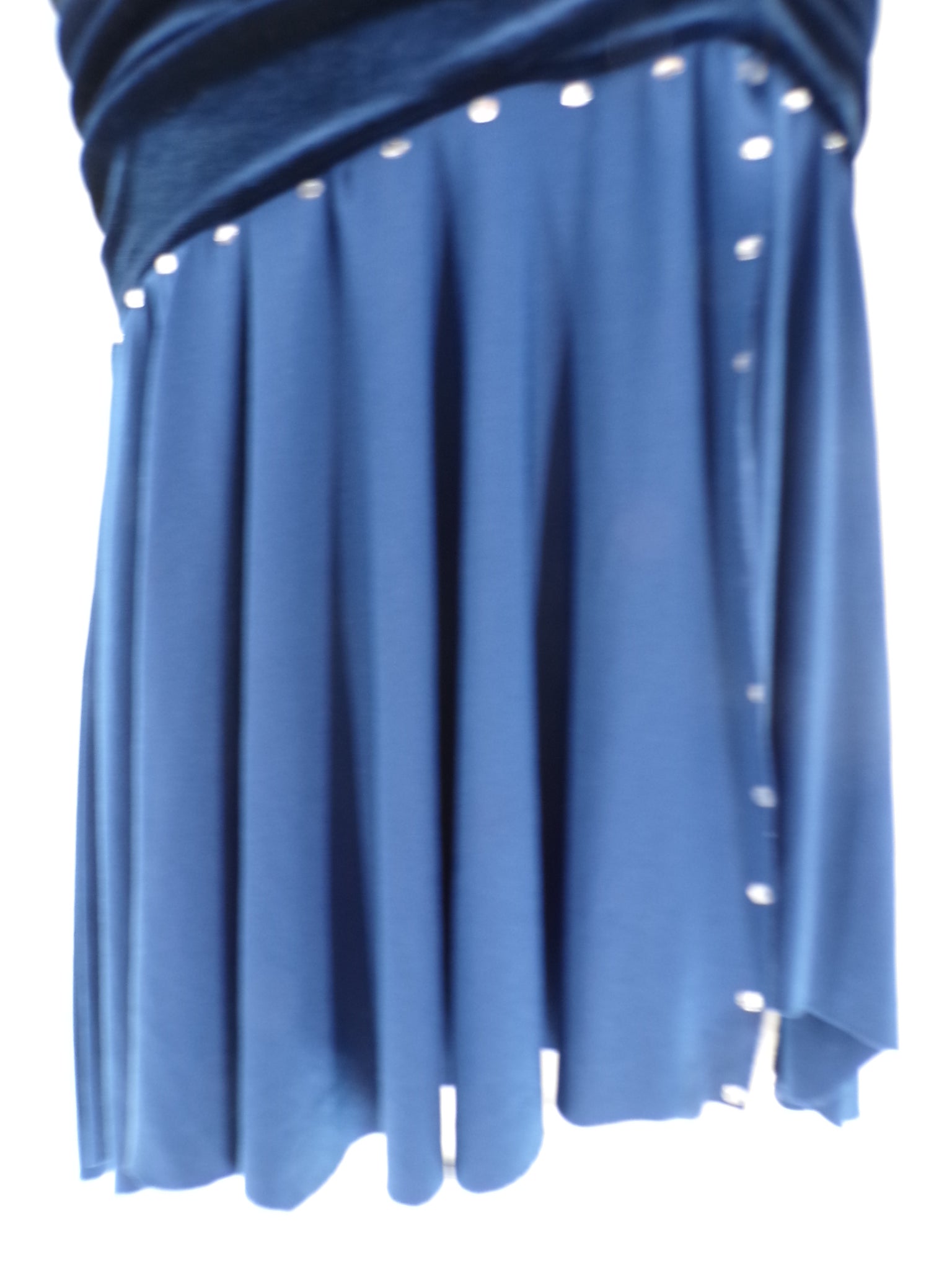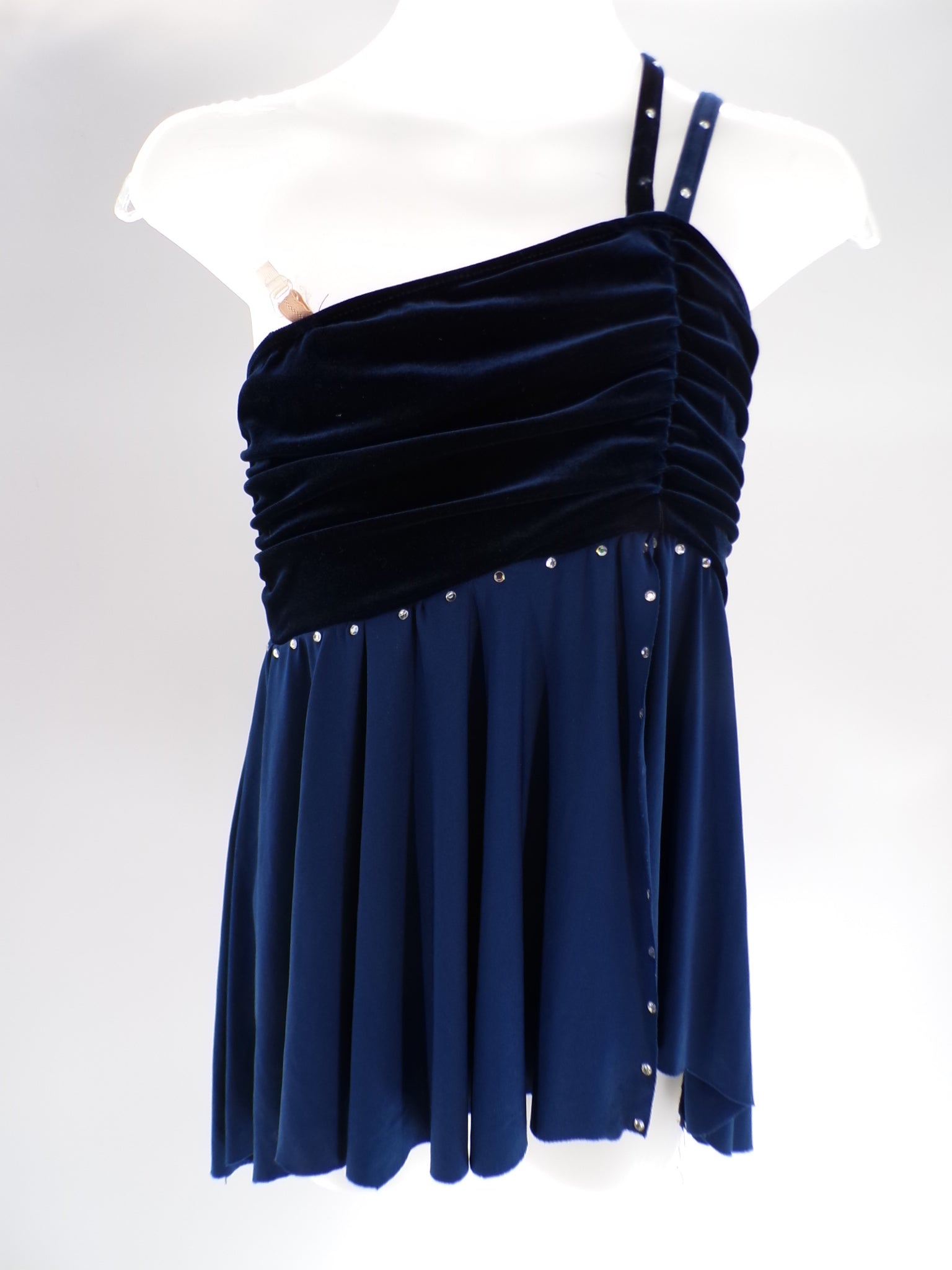 Velvet leotard with attached flow skirt. Rhinestones have been added for extra sparkle. The top of the costume is halter style.