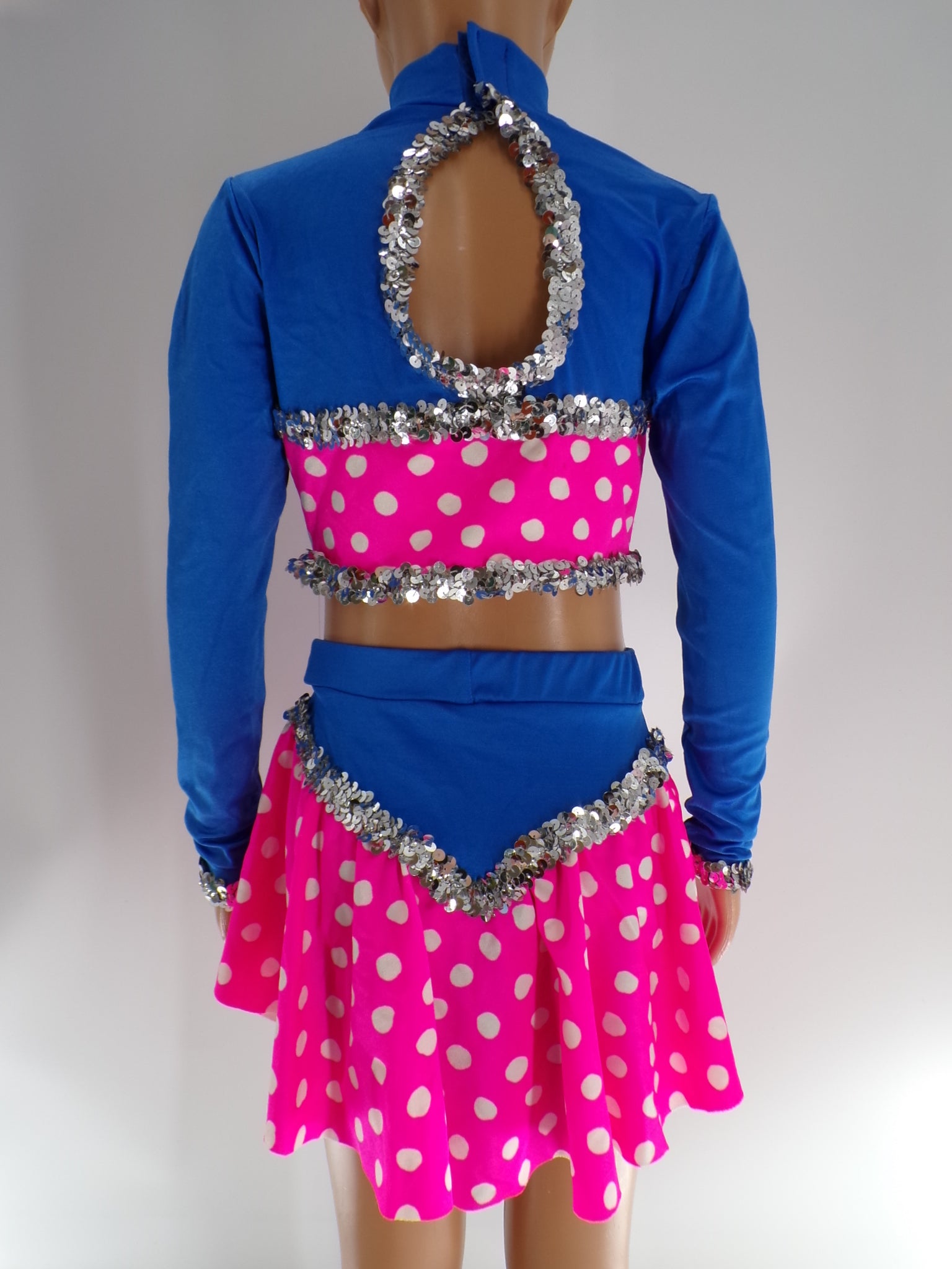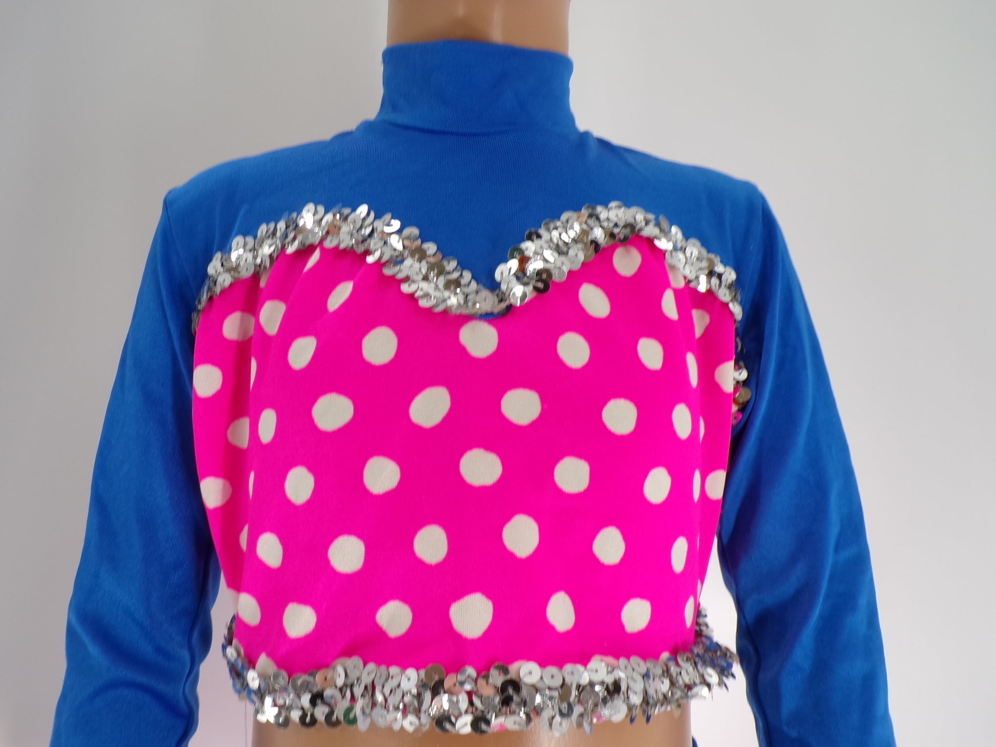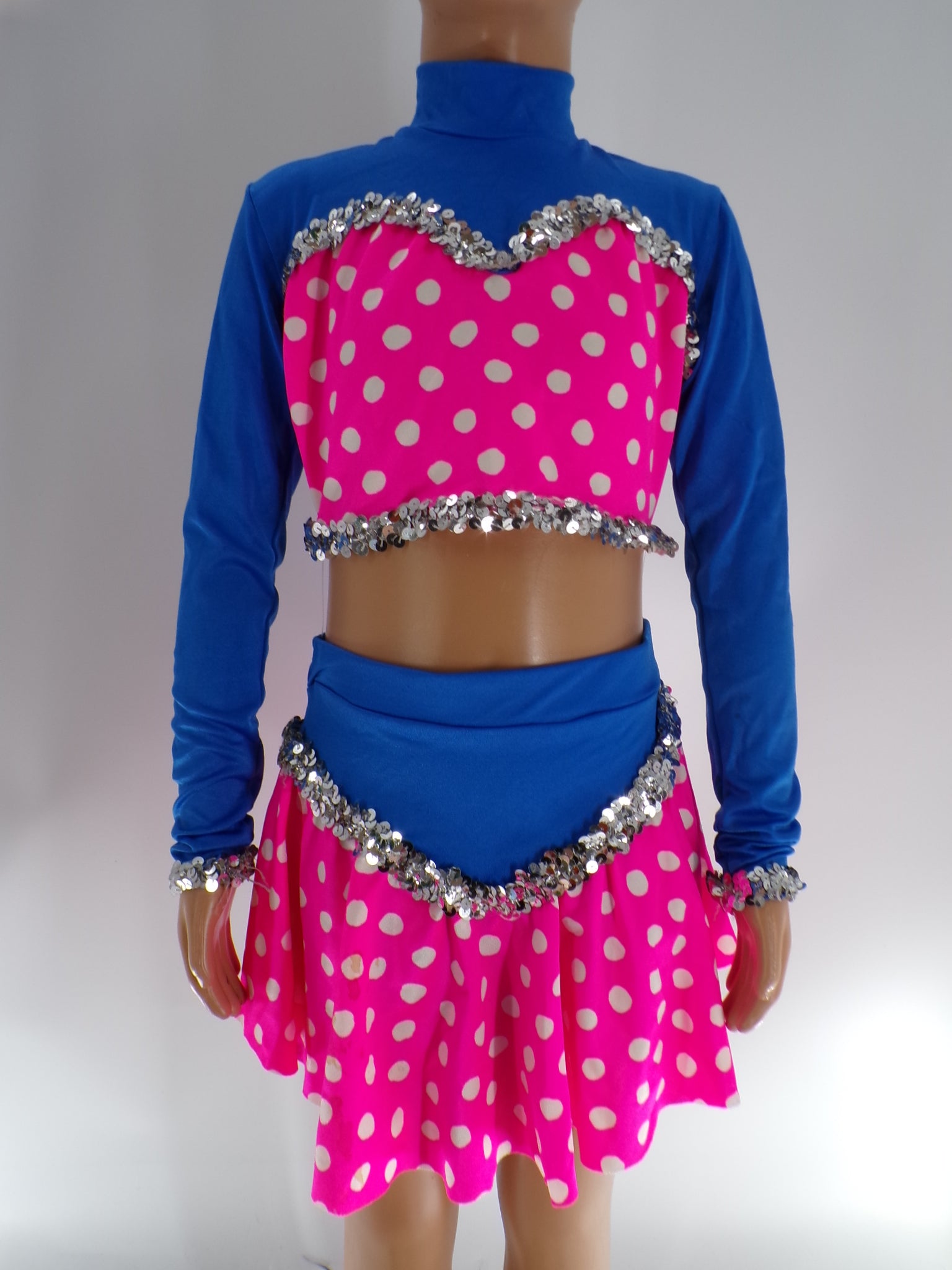 2 pc costume includes mock neck long sleeve crop top and skirt with attached briefs. Costume is decorated with polka dots and sequins. Also includes polka dot gloves to match.