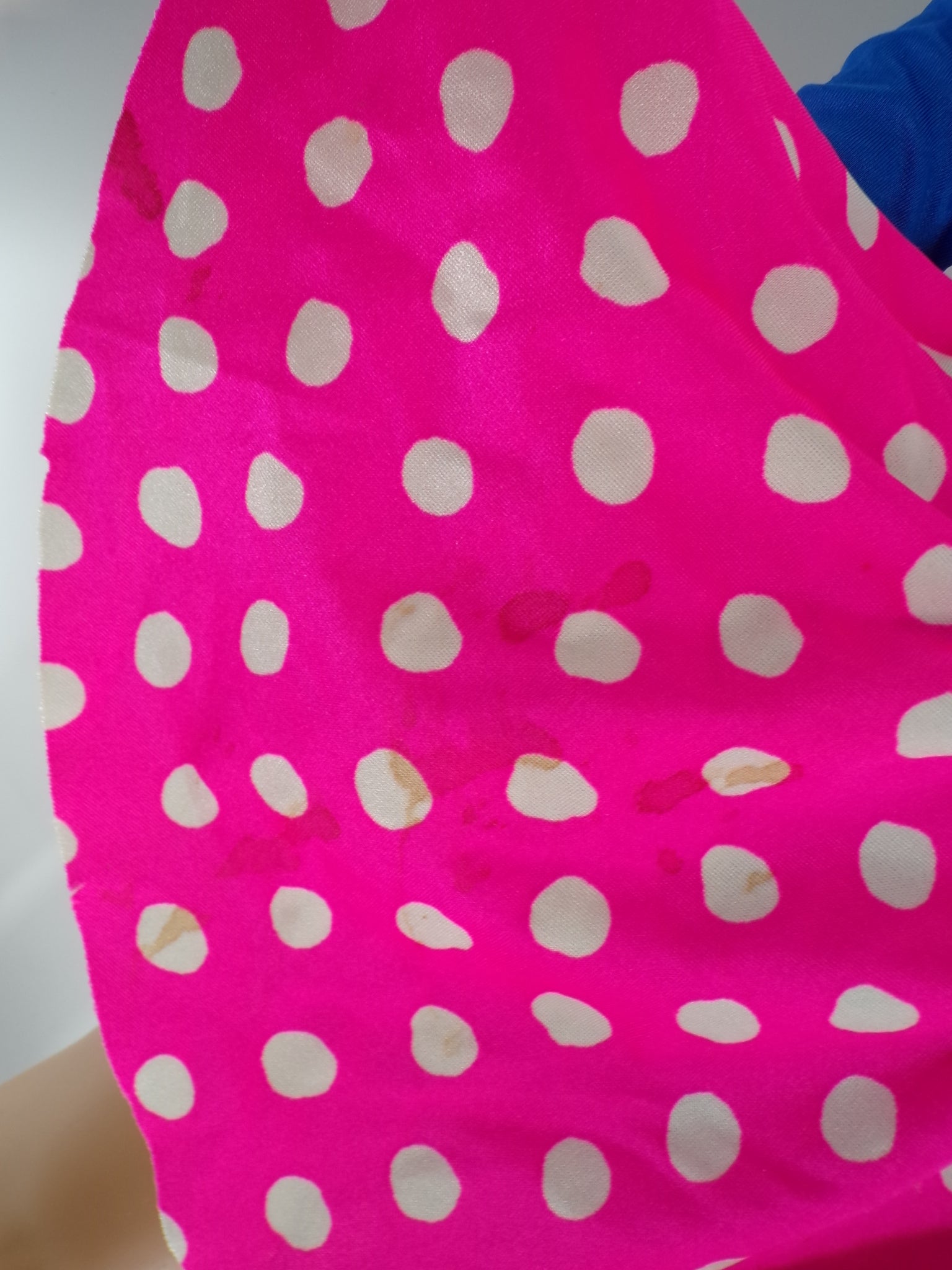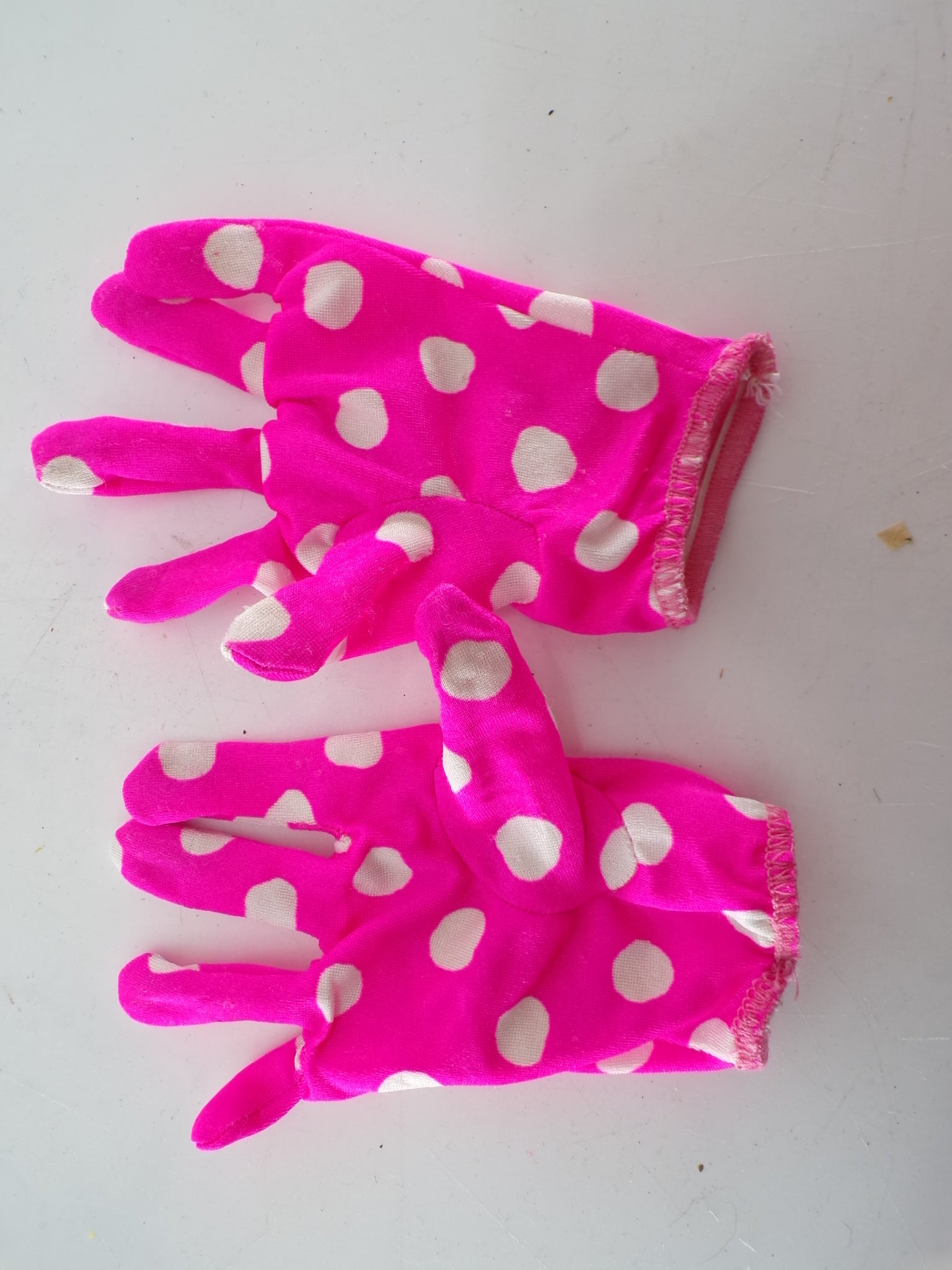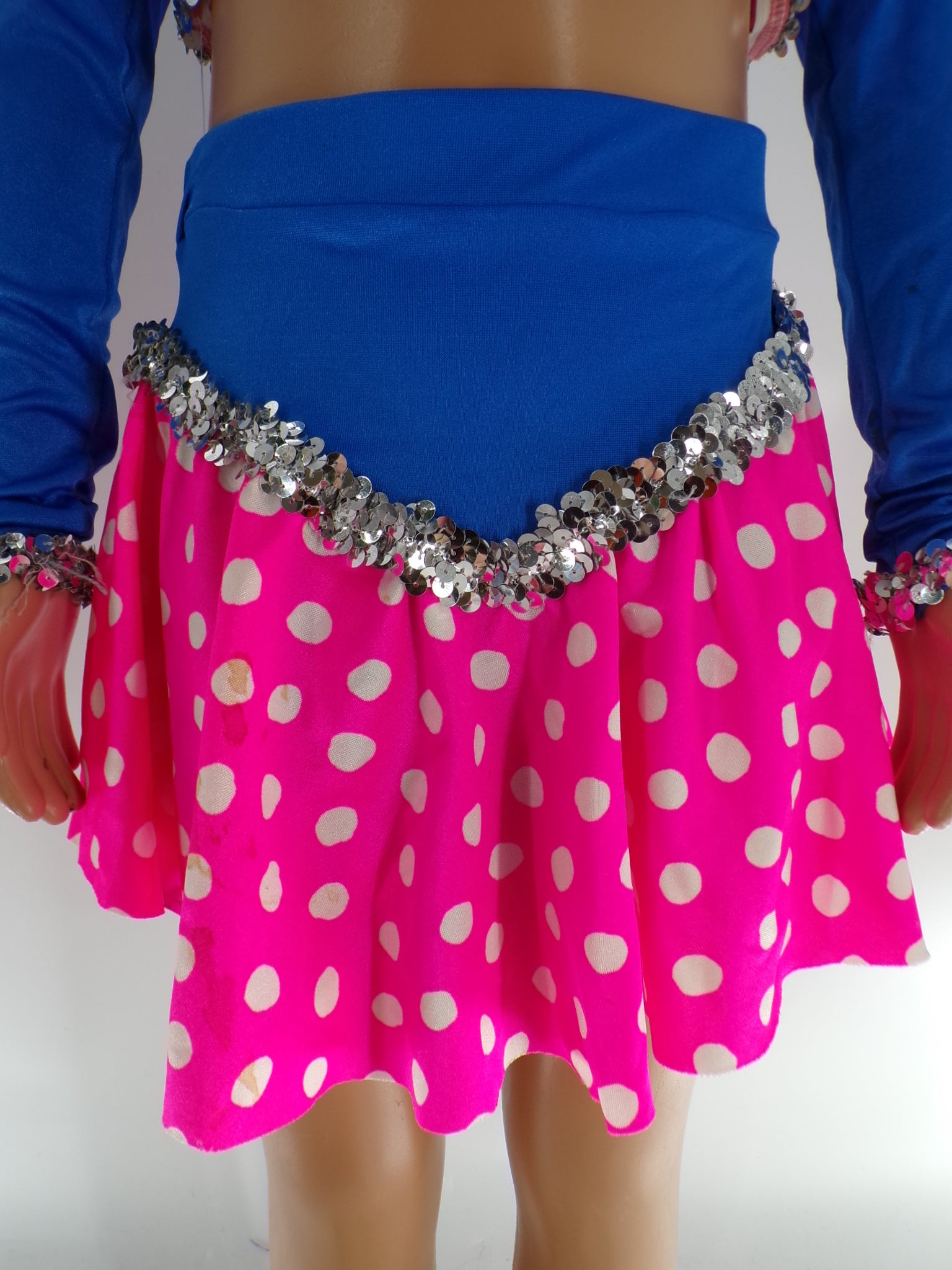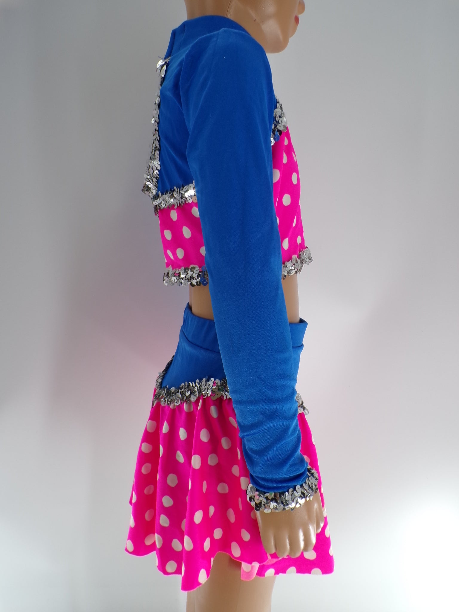 2 pc costume includes mock neck long sleeve crop top and skirt with attached briefs. Costume is decorated with polka dots and sequins. Also includes polka dot gloves to match.