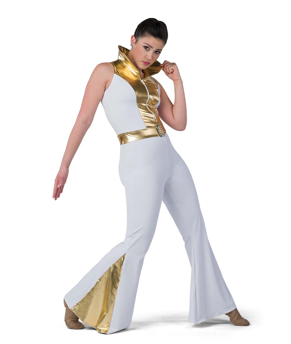 Dryfit and flat foil lycra unitard with flare pants, foam-covered collar and attached buckle. Zipper front. Made in the USA. Red rhinestones added for extra sparkle.