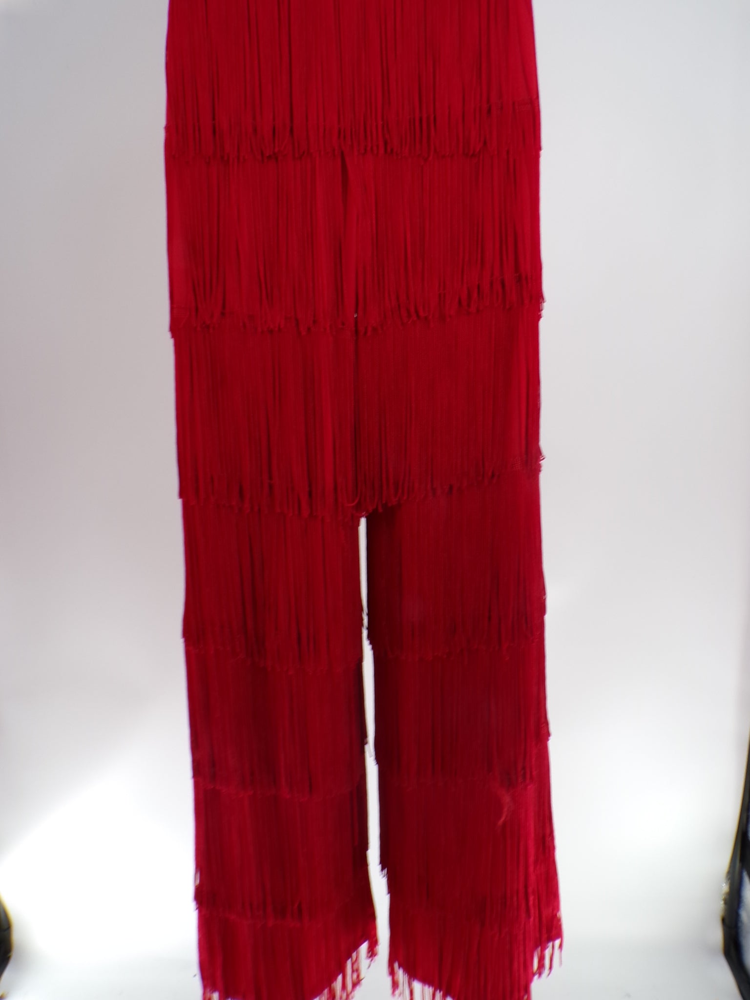 Lined sequin, solid spandex and mesh jumpsuit with attached fringe.