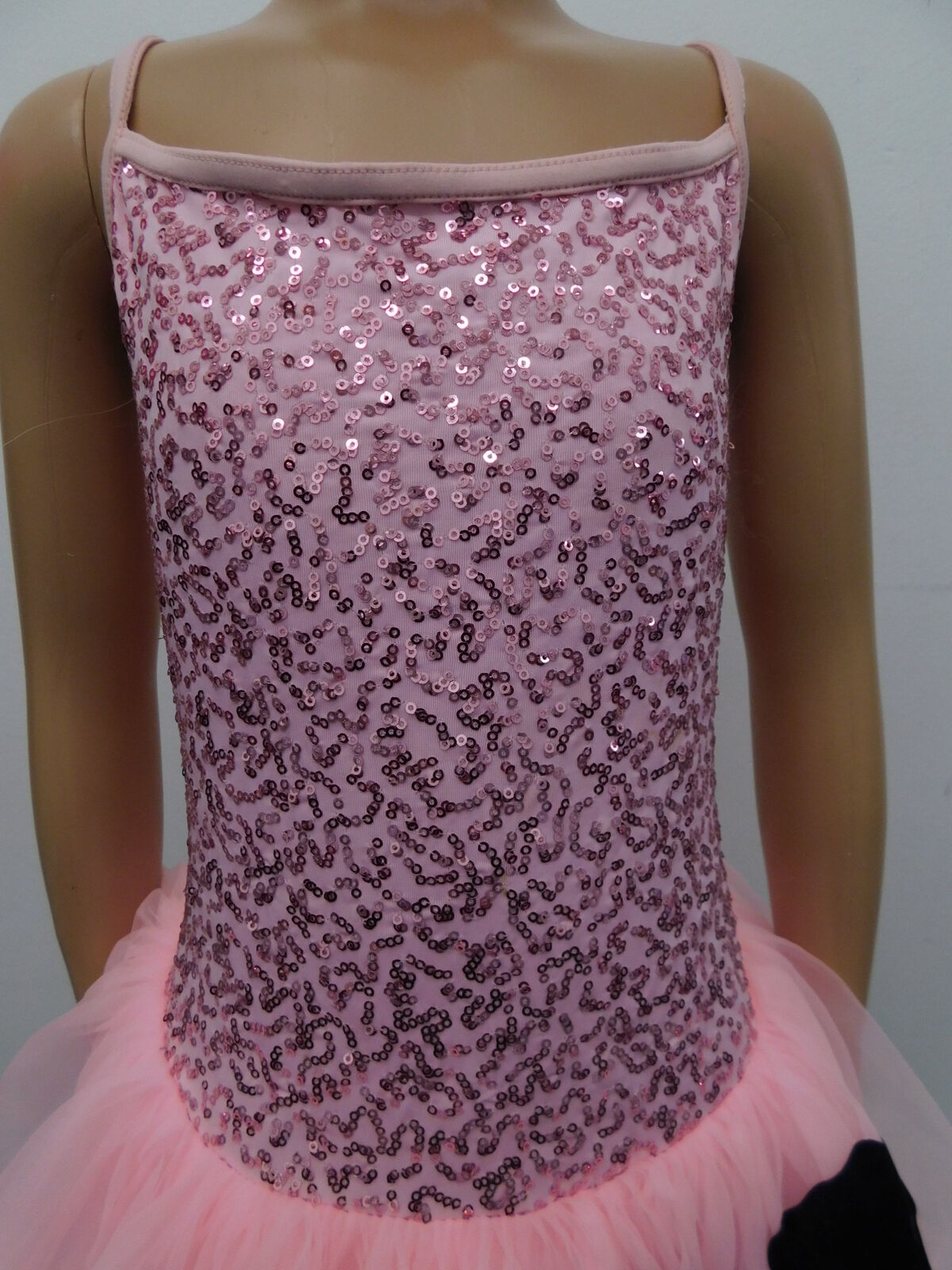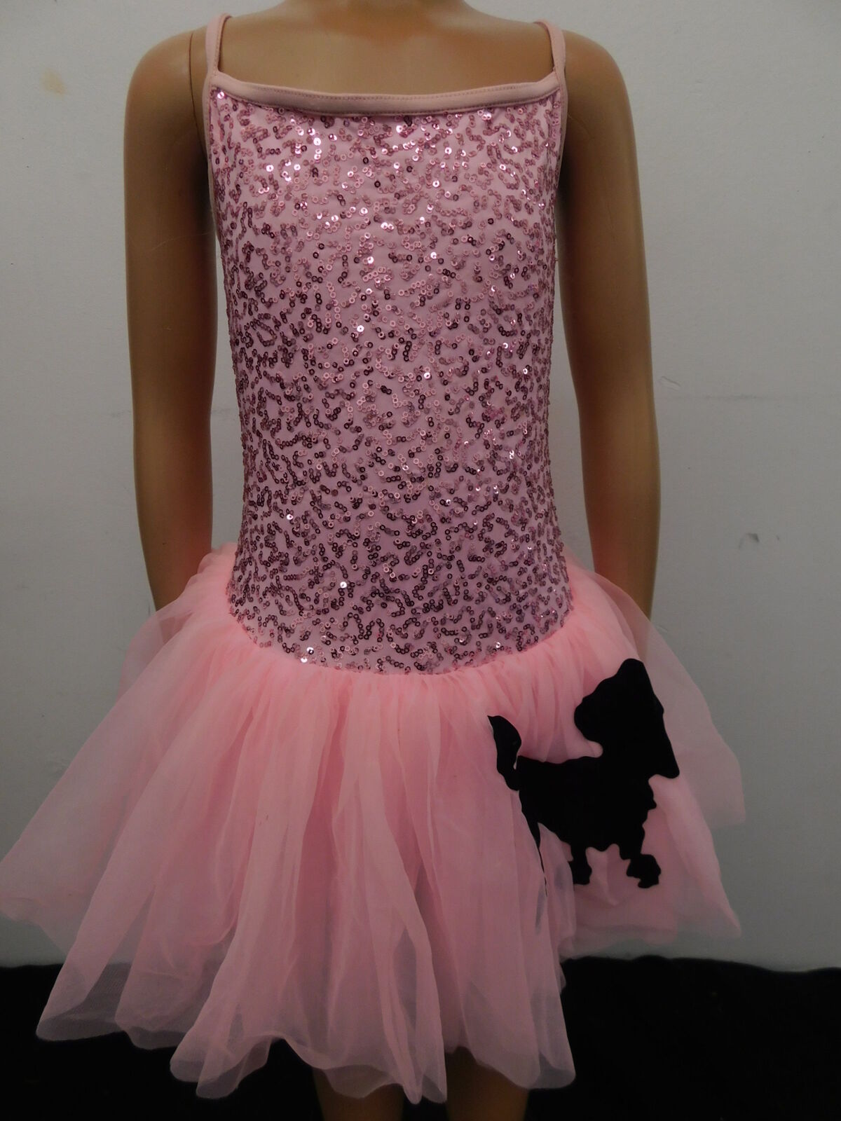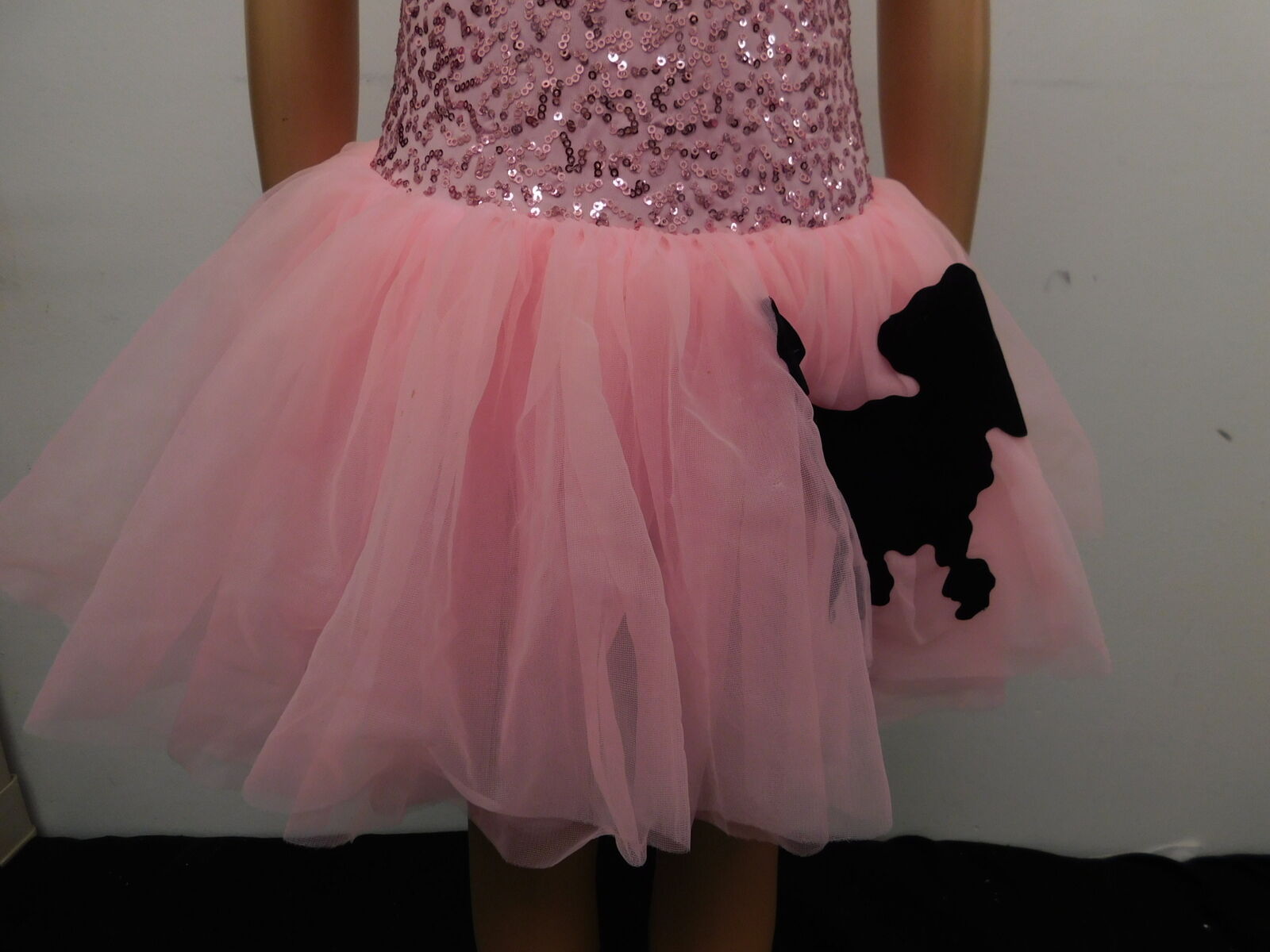 Description: Pink leotard with pink sequins on the bodice. Attached pink tulle skirting, with poodle applique on skirt.
