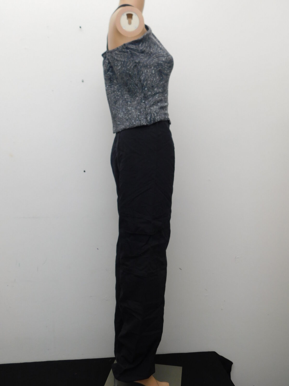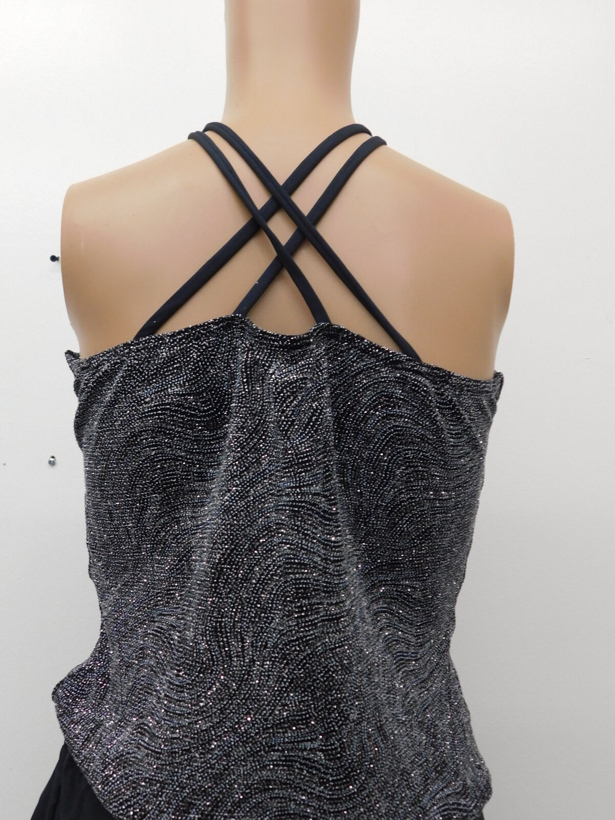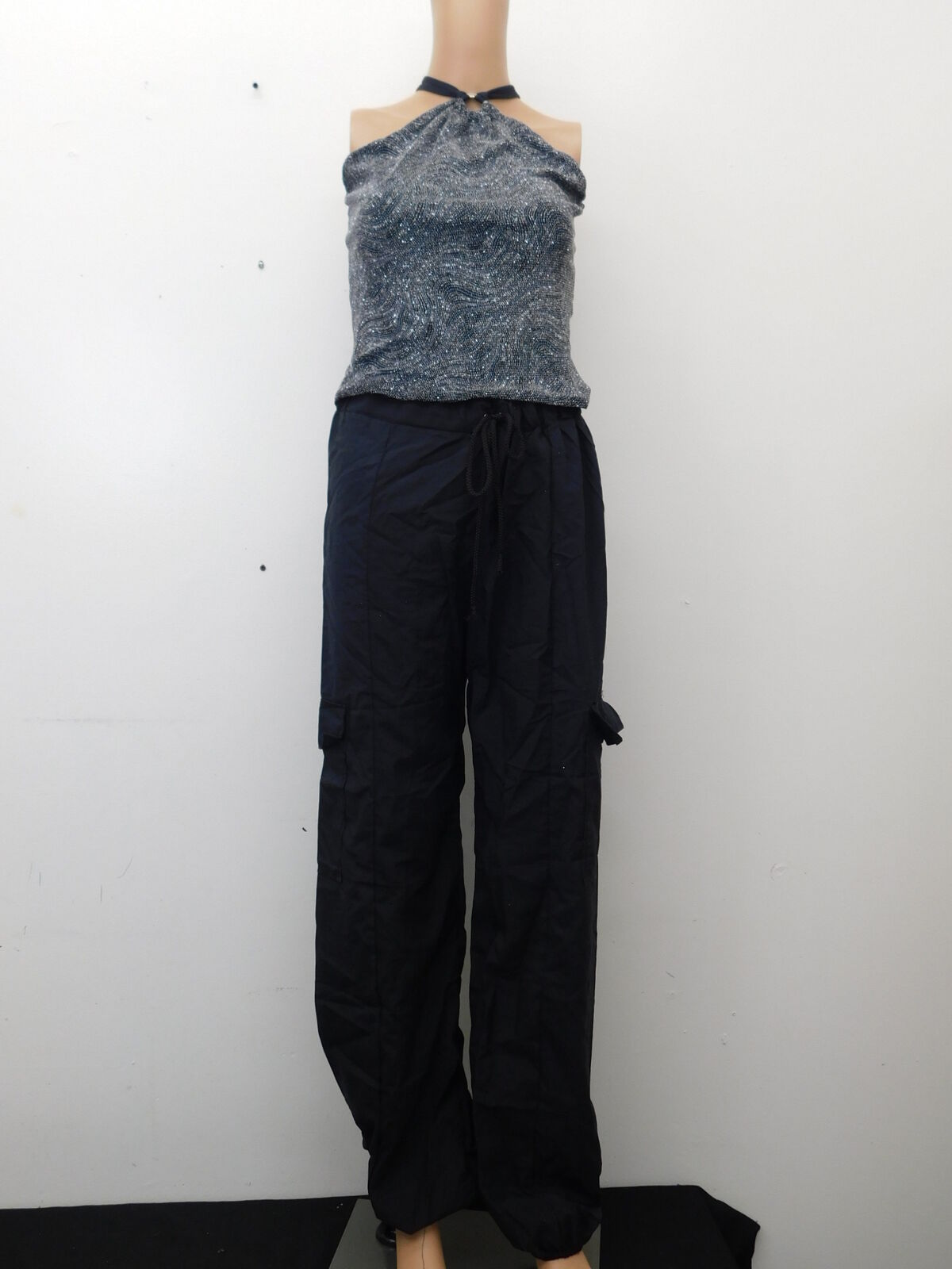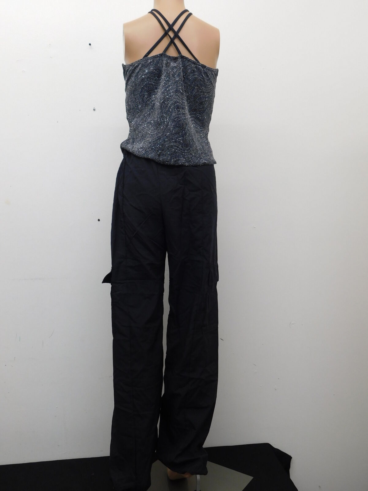 Stretchy spandex halter top with glittery sparkles and nylon, non stretchy cargo style pants.