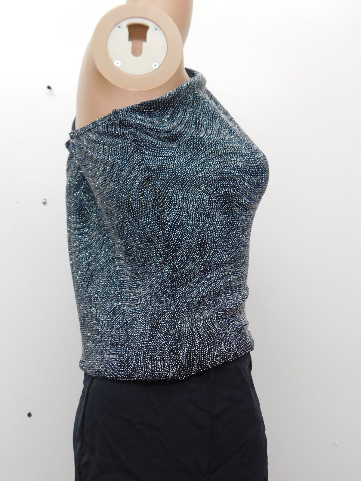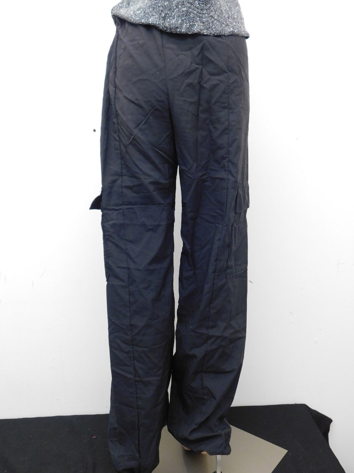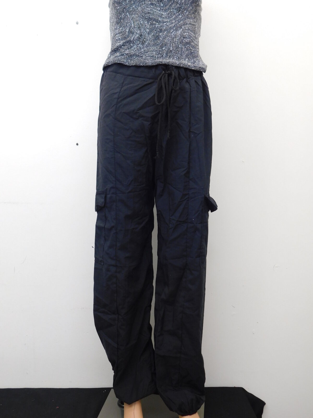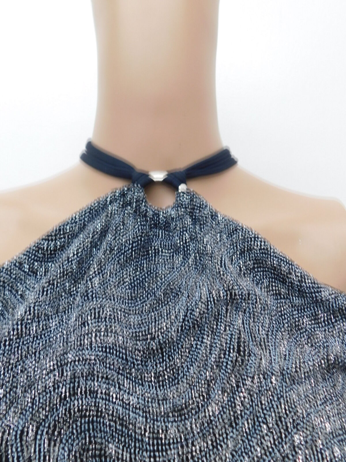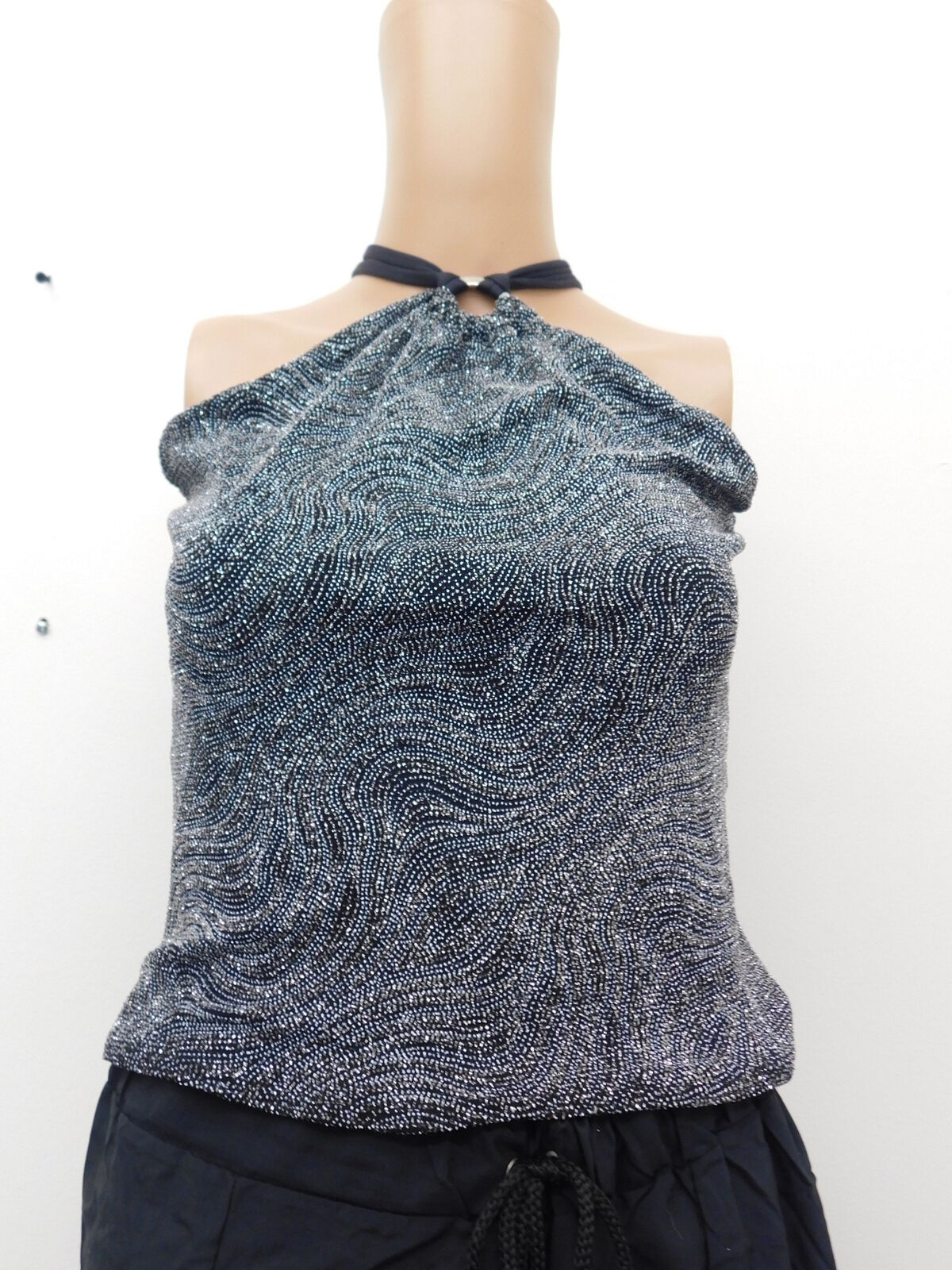 Stretchy spandex halter top with glittery sparkles and nylon, non stretchy cargo style pants.