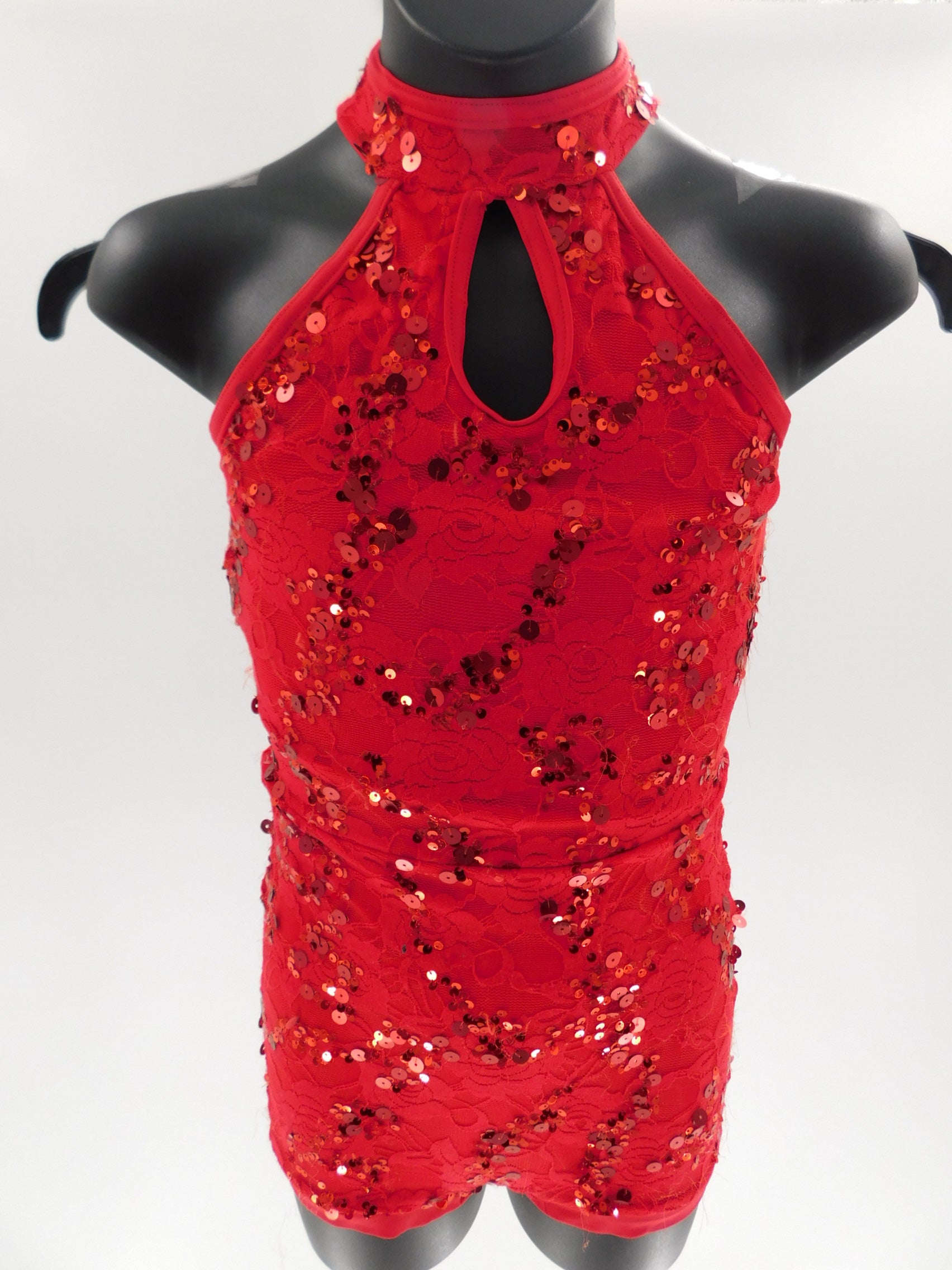 Halter biketard is made of matte nylon/spandex with a shimmering streak lace overlay