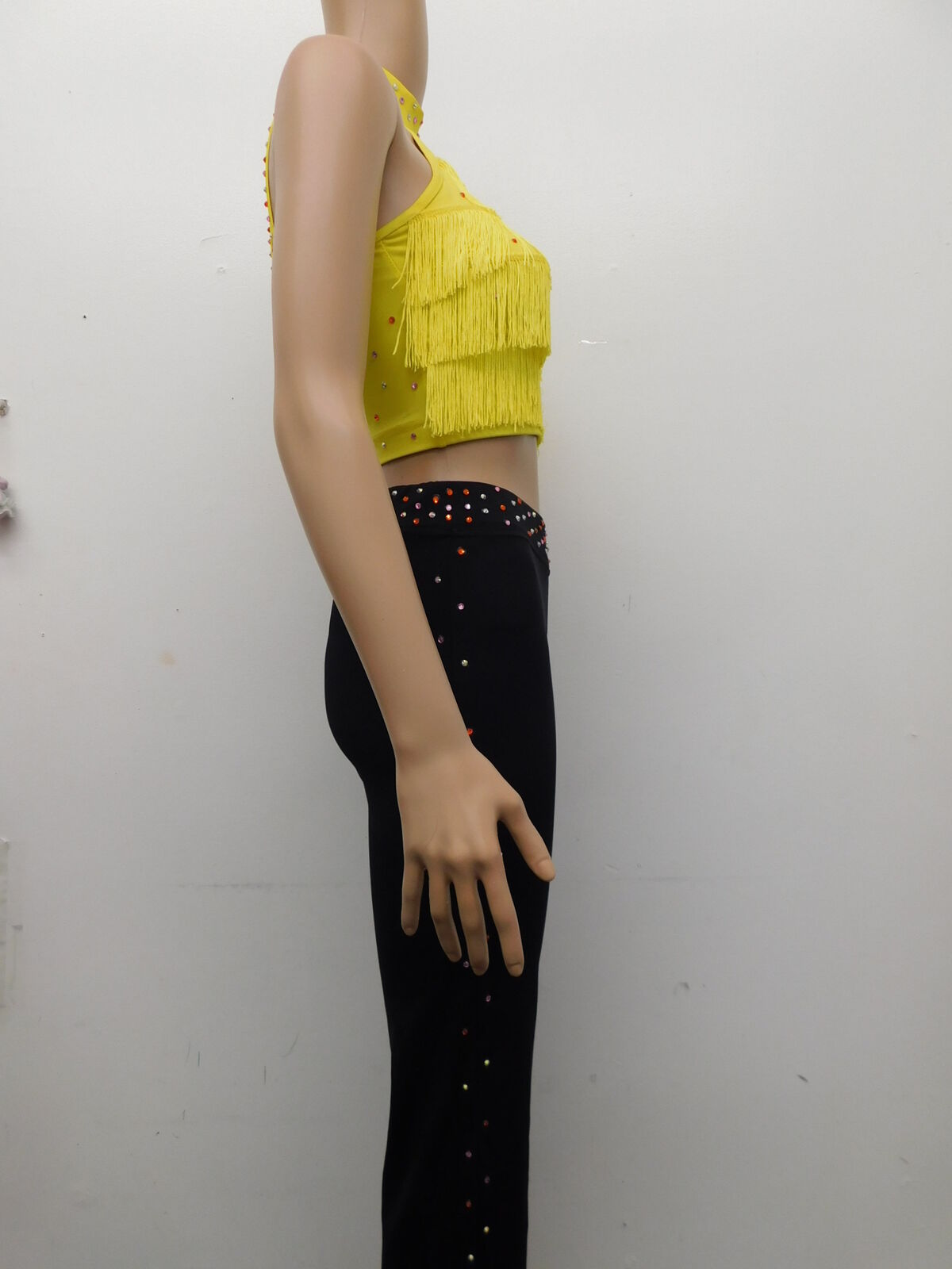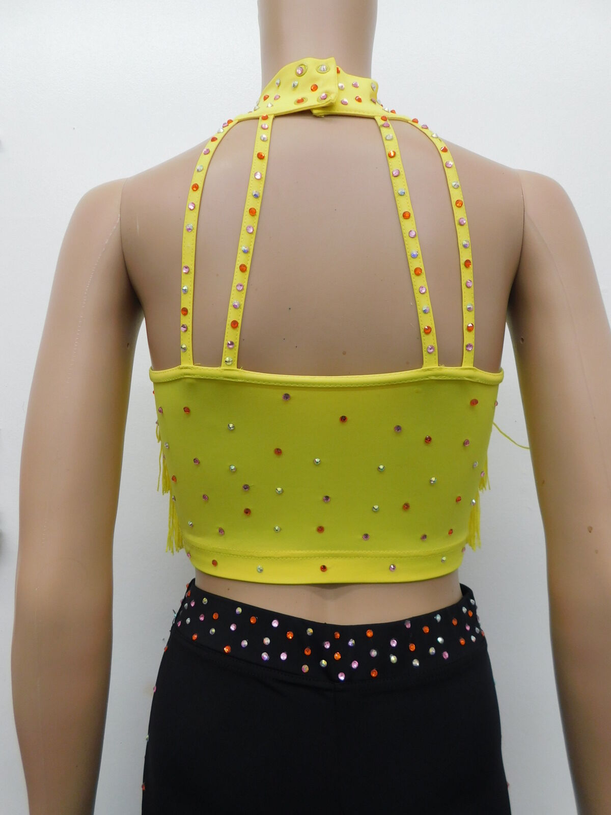 Yellow Dance Halter Crop Top with Sequin Collar with fringe material across the chest with sequin across the back of the top