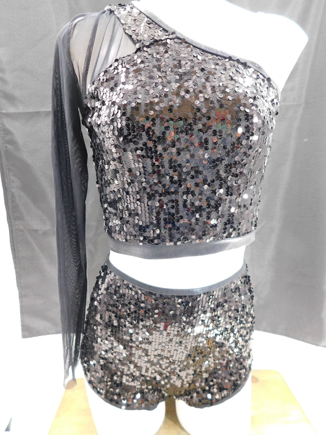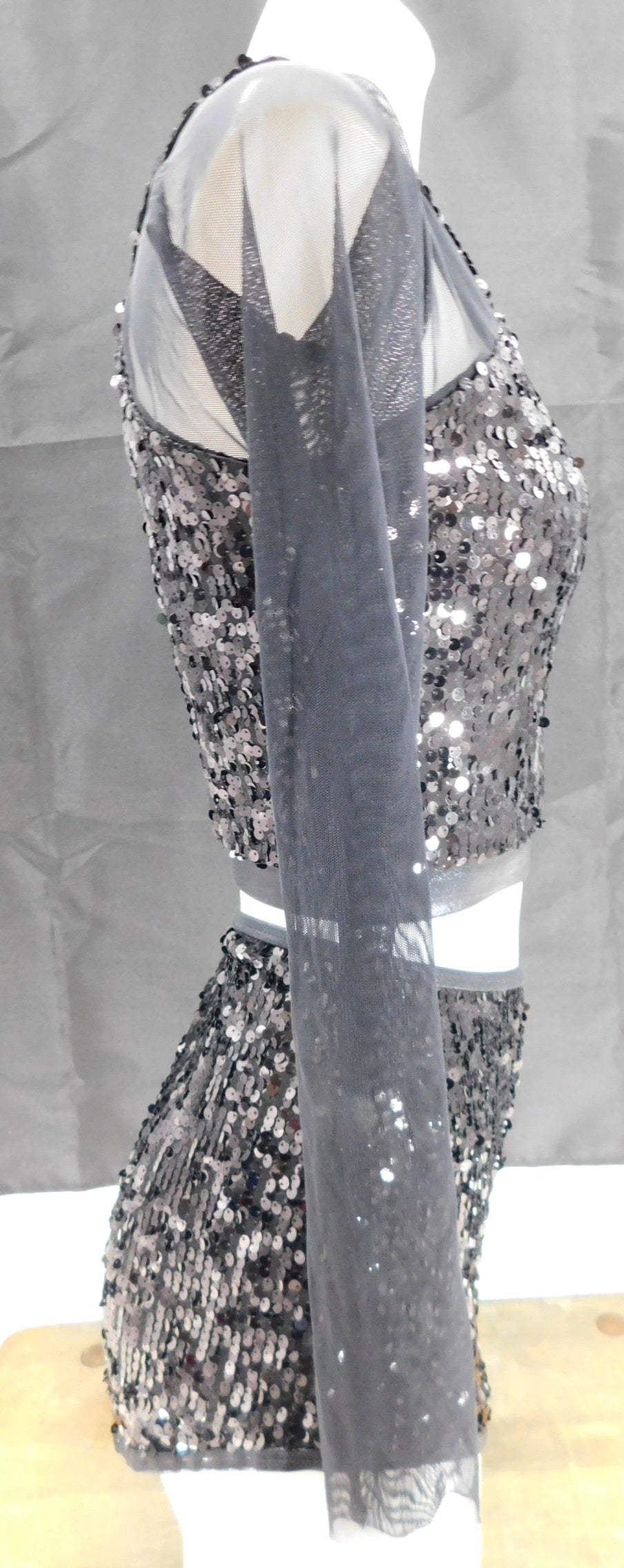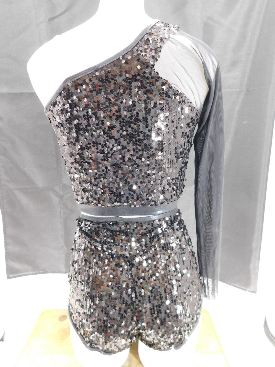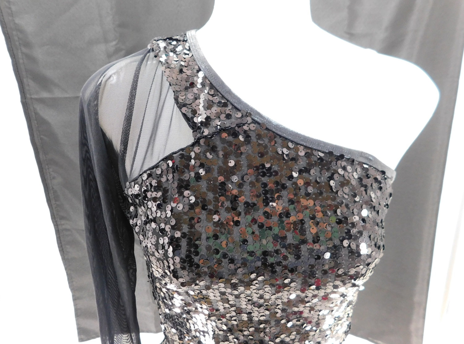 Ultra Sparkle sequin asymmetrical crop top with illusion mesh long sleeve and adjustable nude strap. Bodice fully lined. Imported.