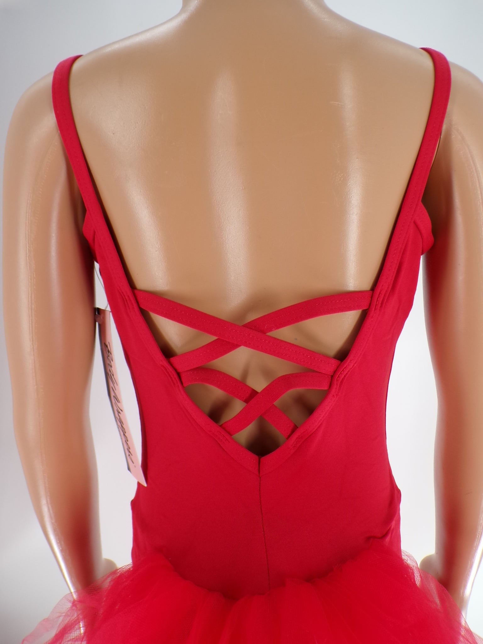 Bustle back boy-cut leotard has a multi-layered soSOFT™ tulle bustle attached at the back drop waist. The front princess seam bodice has a shirred tulle center panel and memoryStretch™ front bodice lining. the back features double criss-cross strap trim