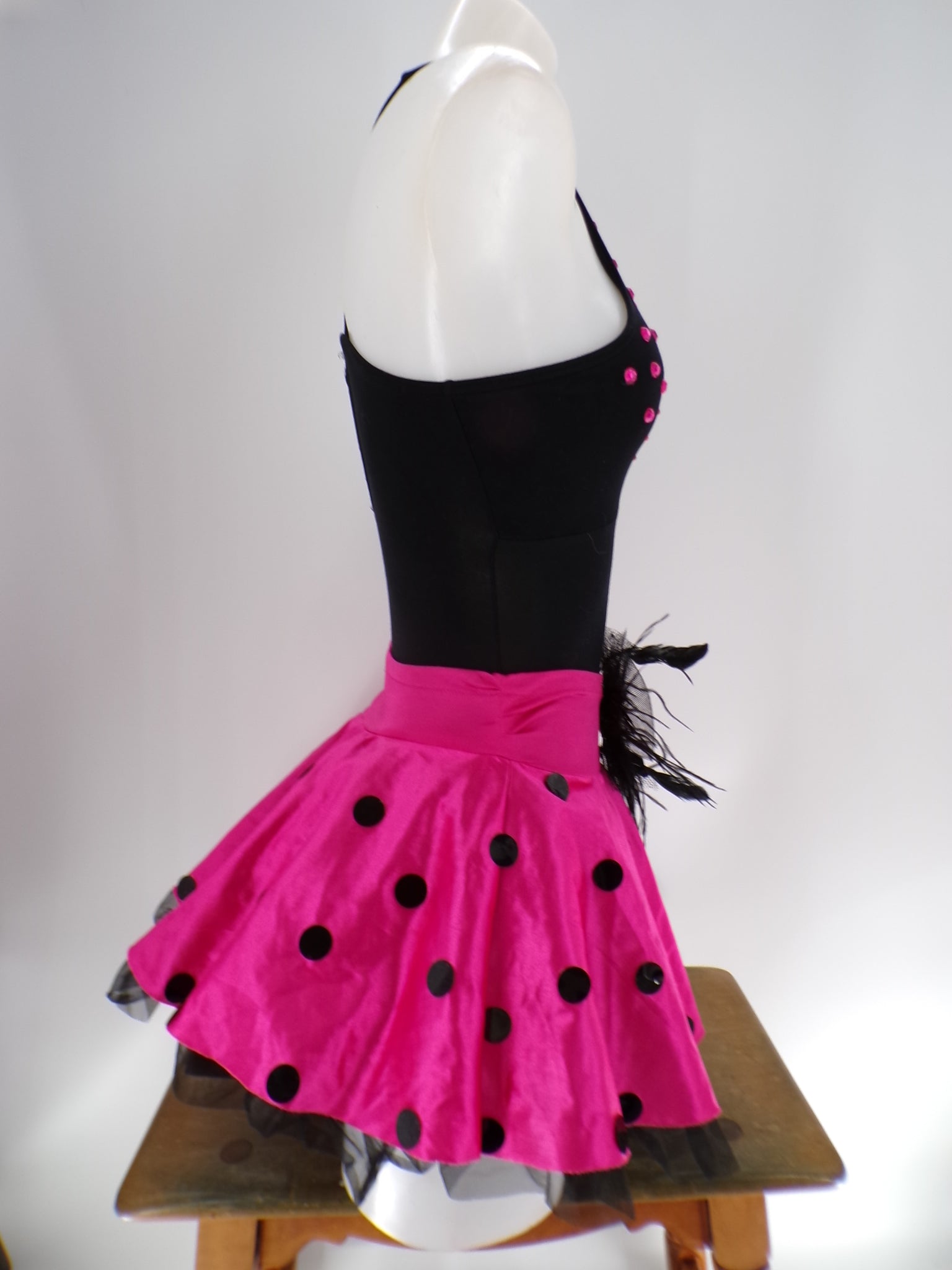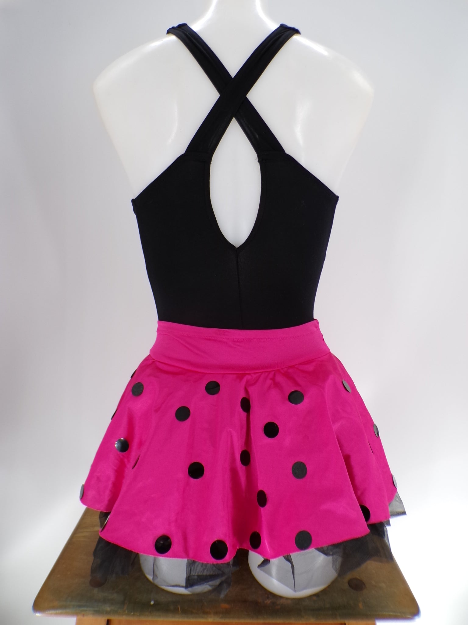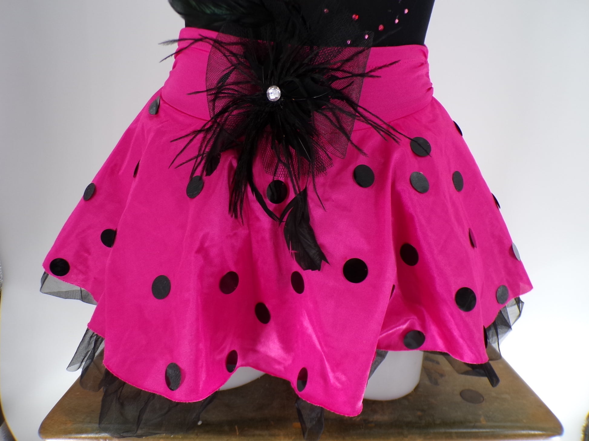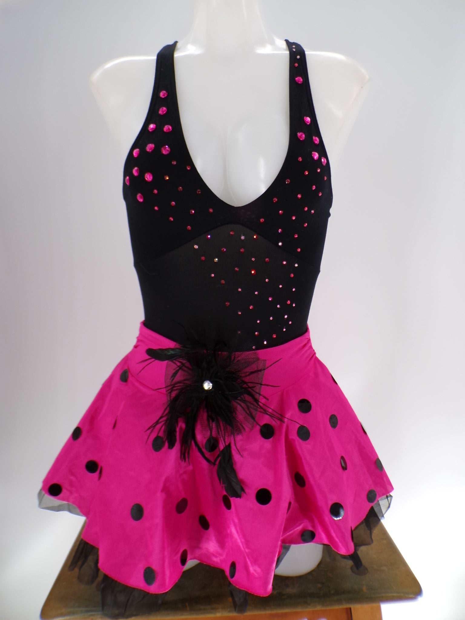Cotton leotard with cascading pink rhinestones and straps that criss cross in the back. Separate, but included skirt is shiny spandex with "polka dot" sequins attached and tulle petticoat. Feather embellishment is attached at waist.
