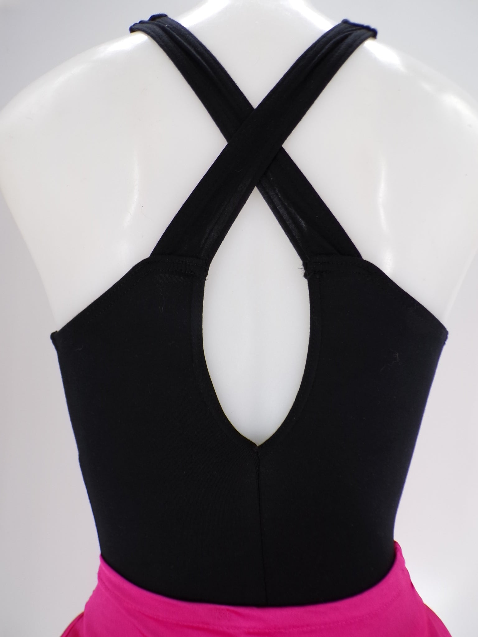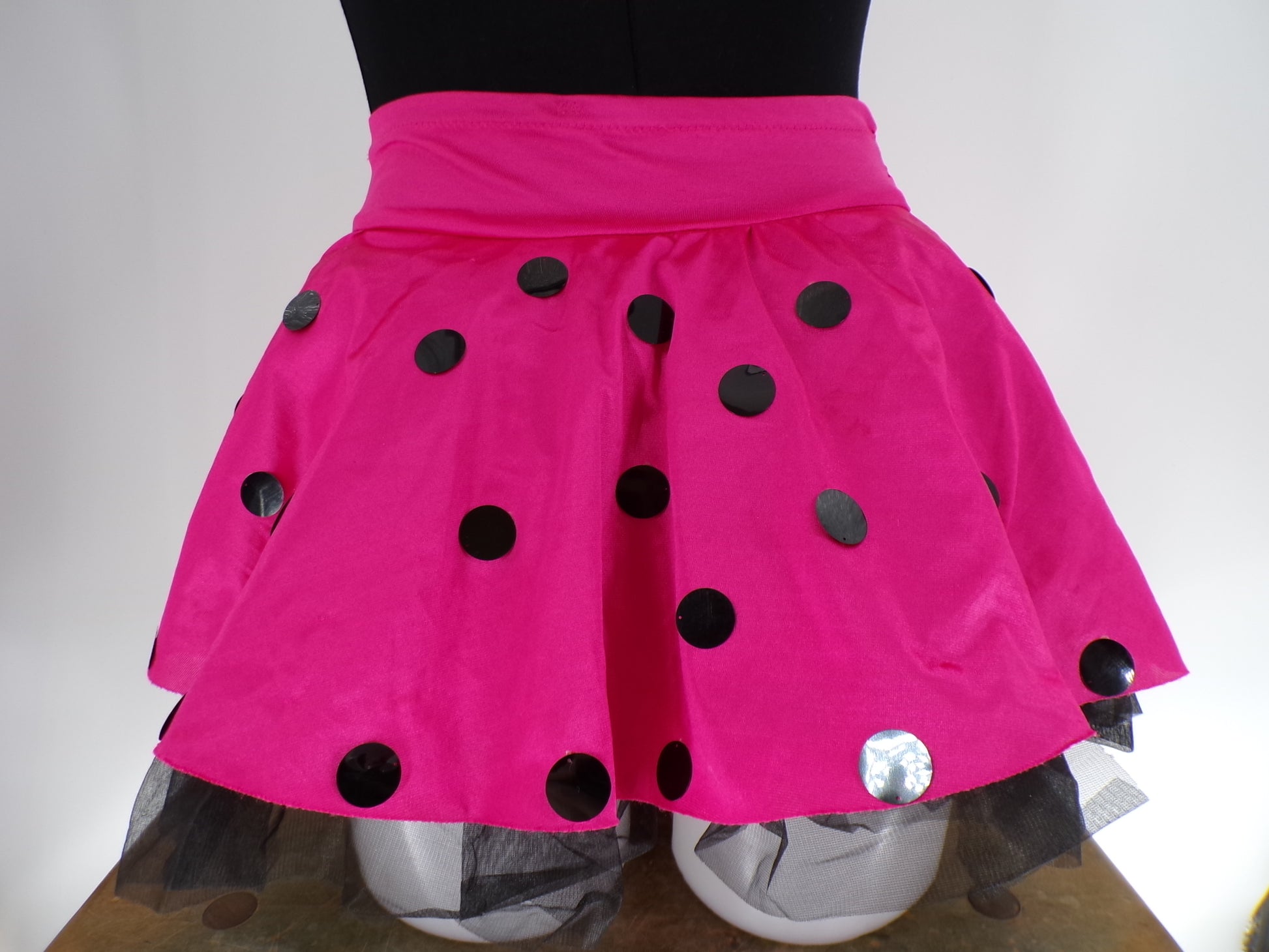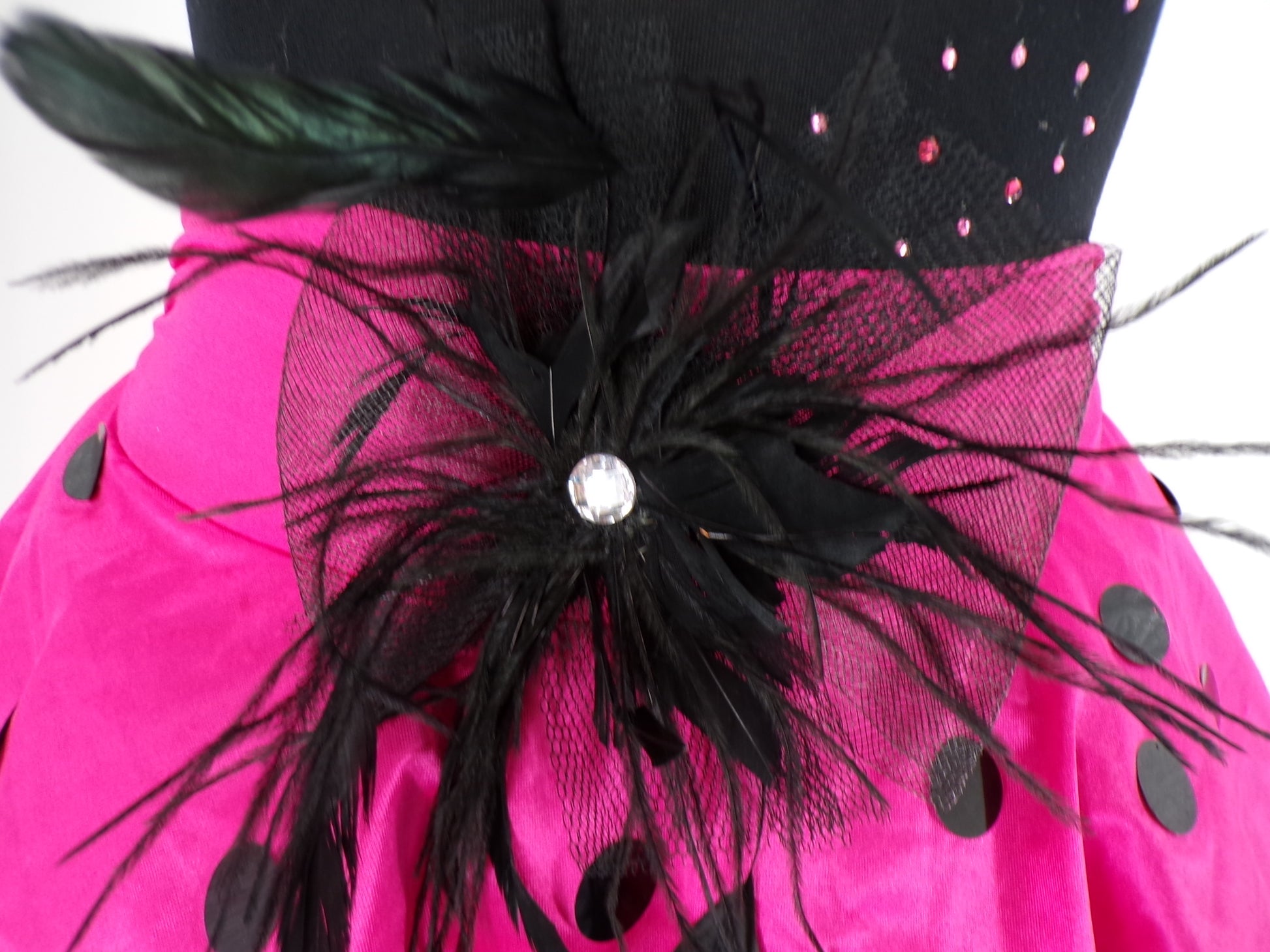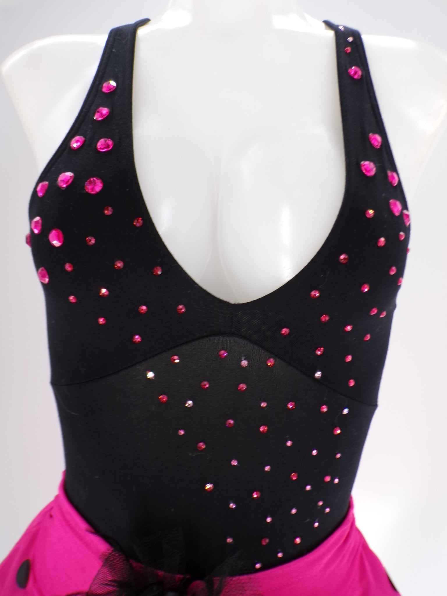 Cotton leotard with cascading pink rhinestones and straps that criss cross in the back. Separate, but included skirt is shiny spandex with "polka dot" sequins attached and tulle petticoat. Feather embellishment is attached at waist.