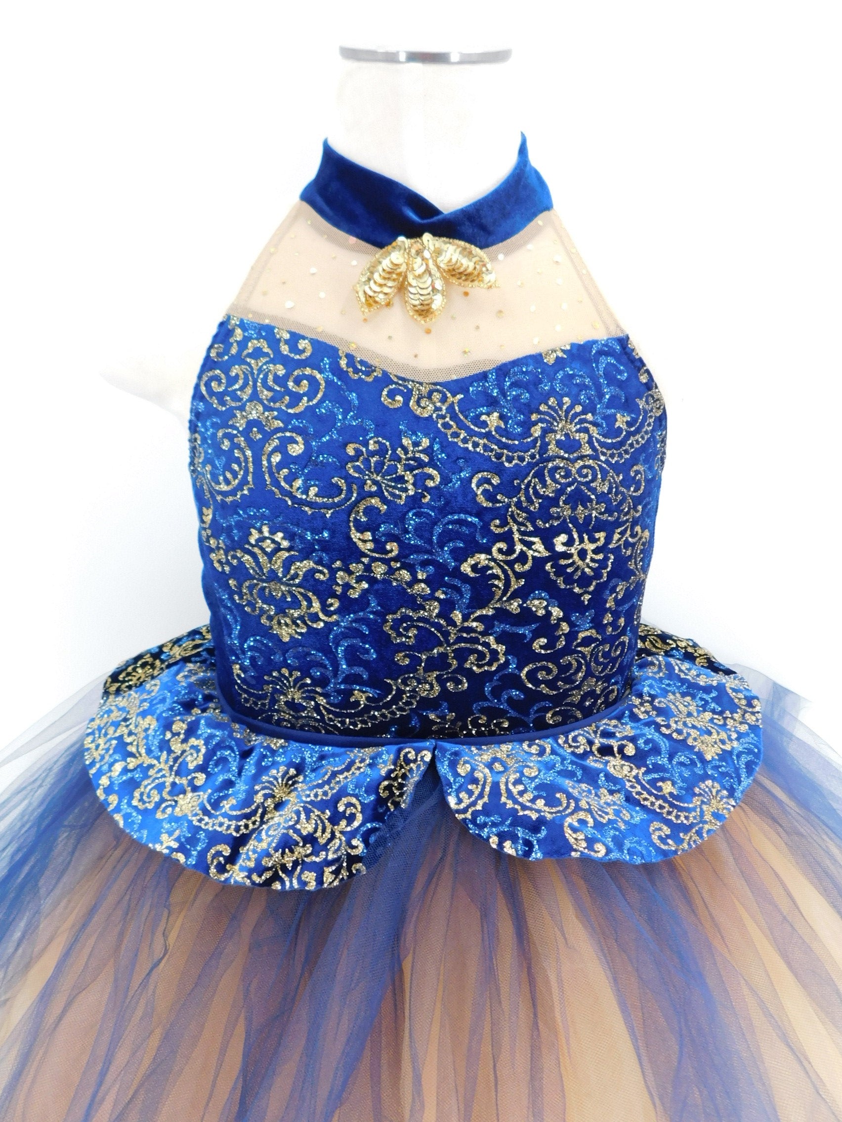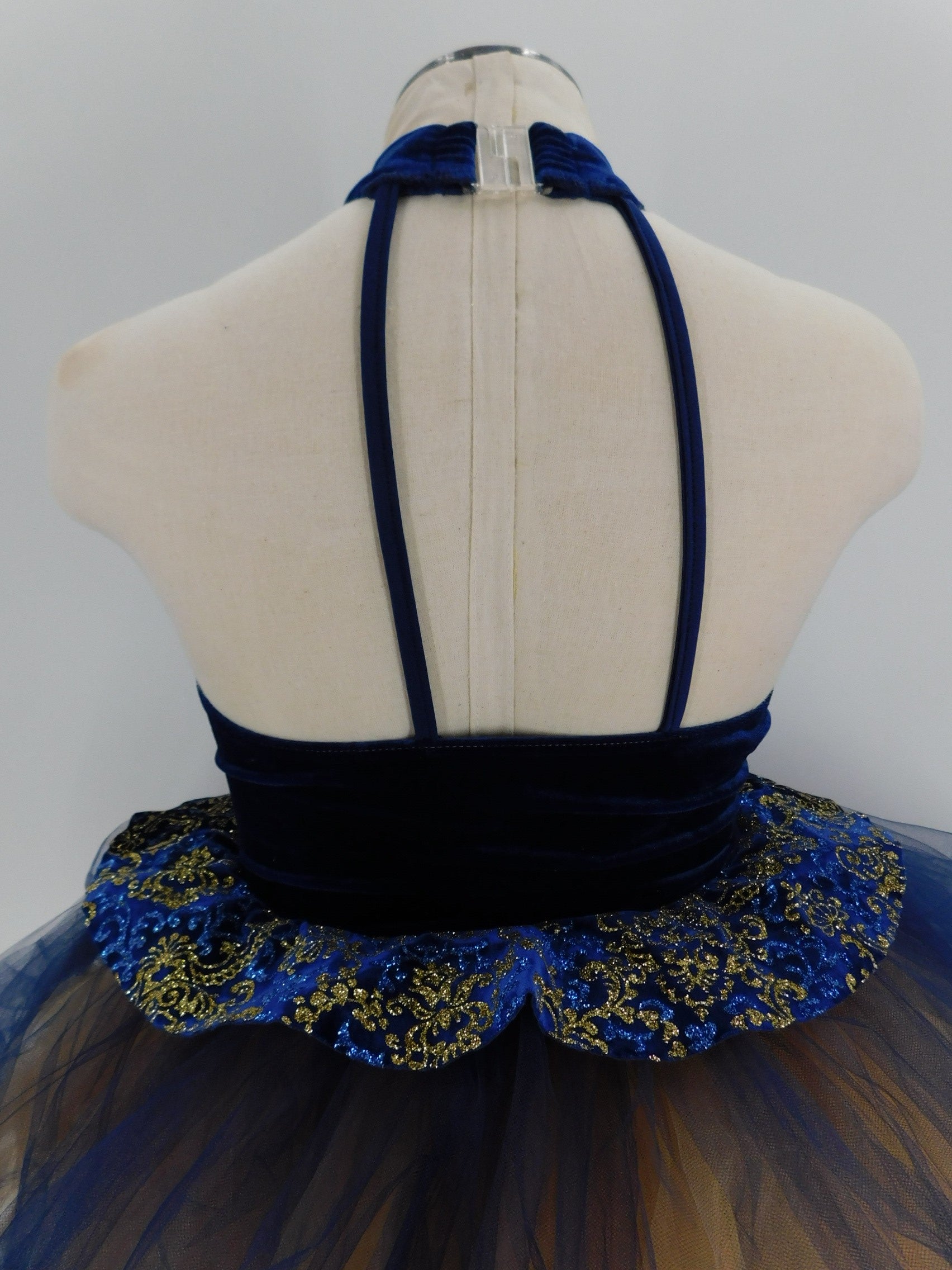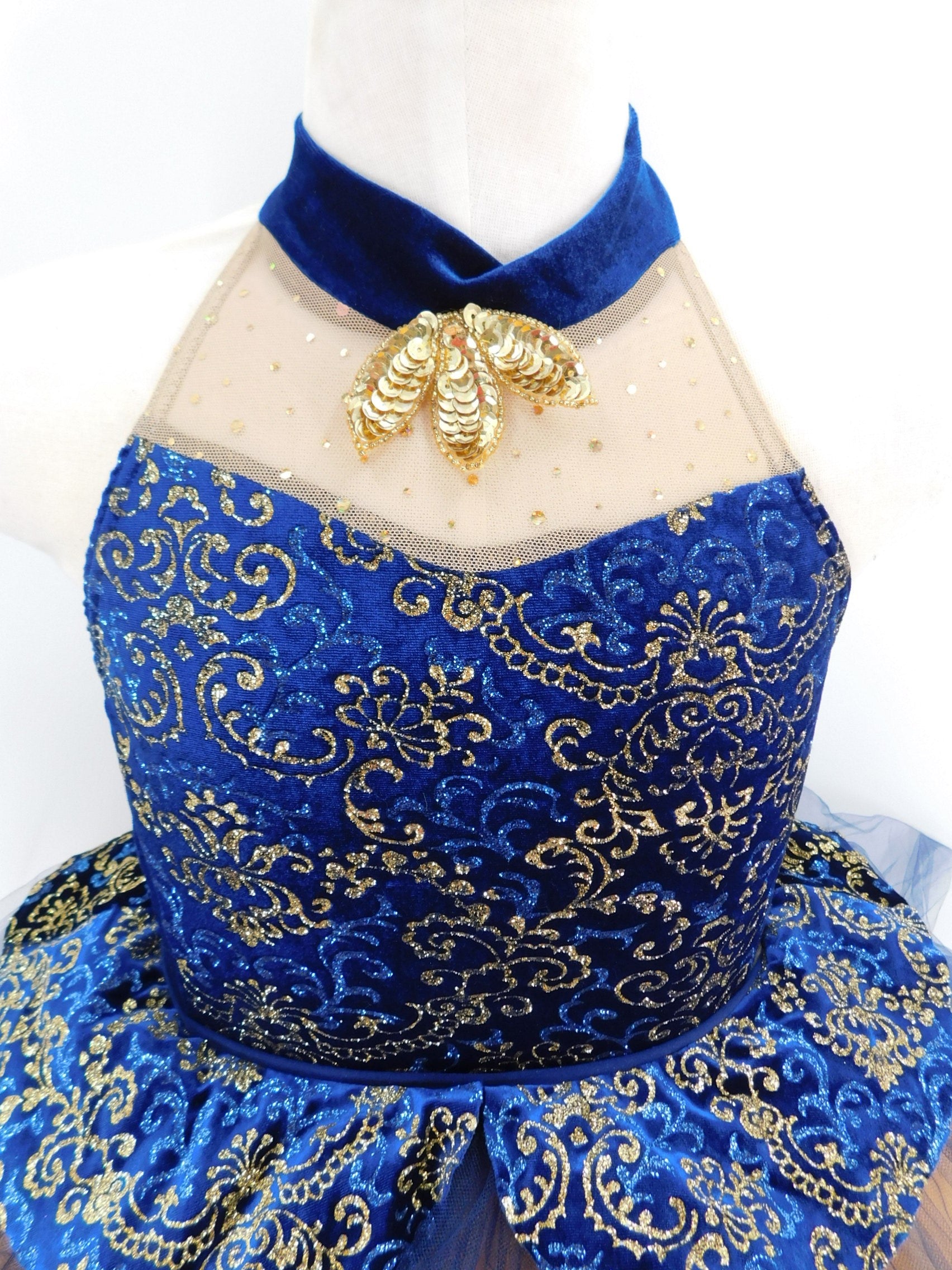 Velour halter neck leotard with gold and blue glitter embellishments on front of leotard. Nude mesh lines the neckline with gold sequin broach. 4 layered tulle tutu is gold and blue with matching velour and glitter skirting along the waist.