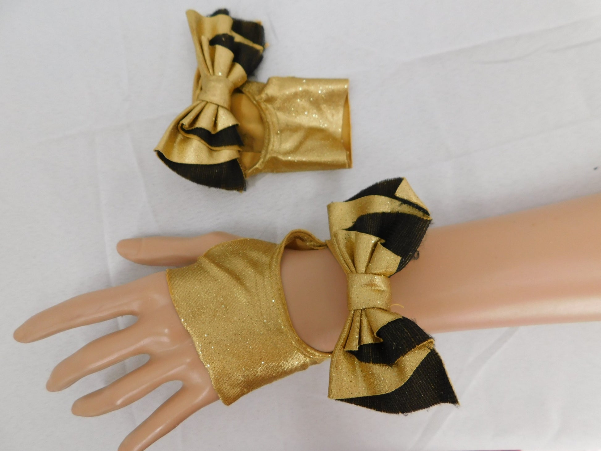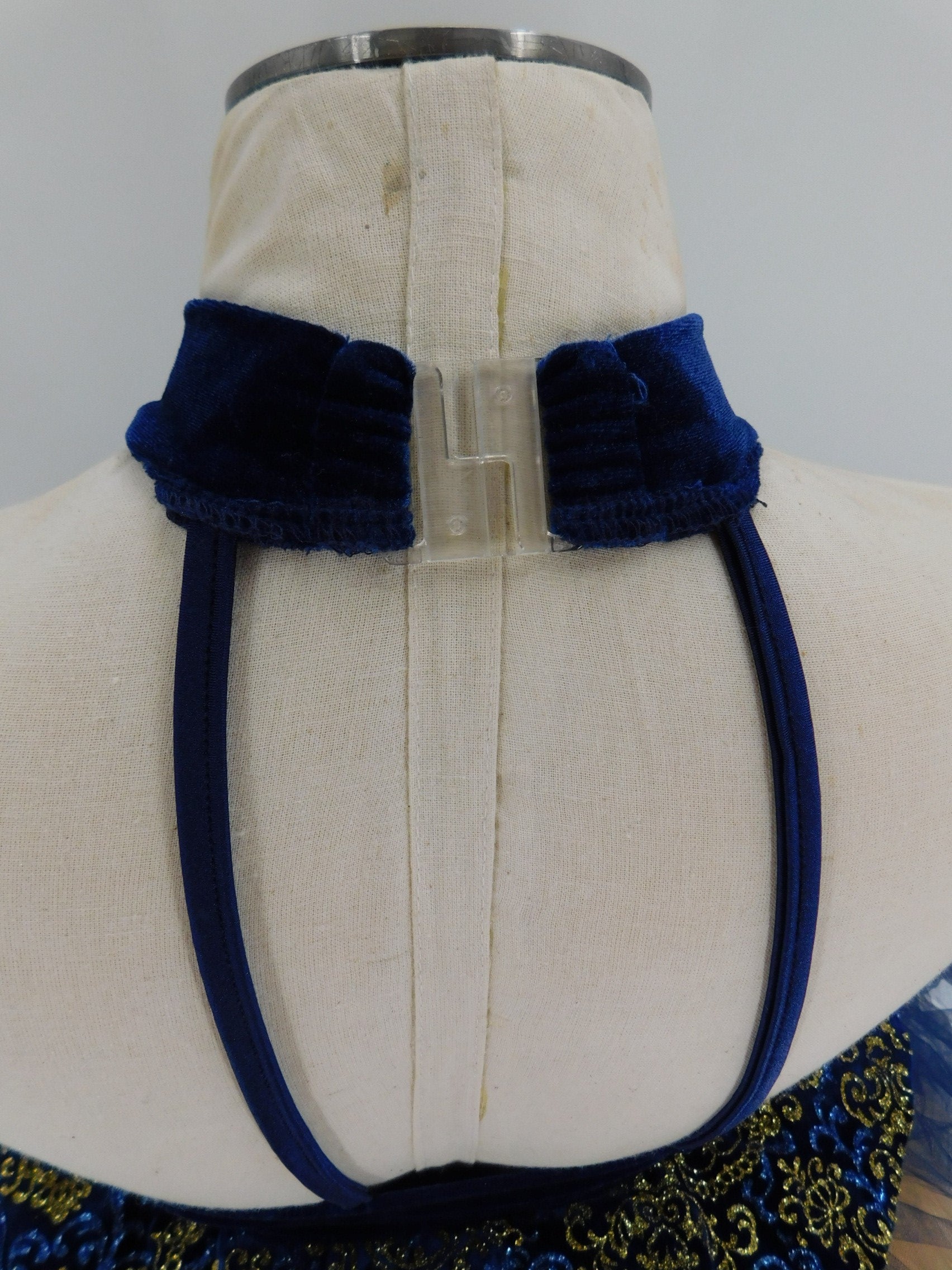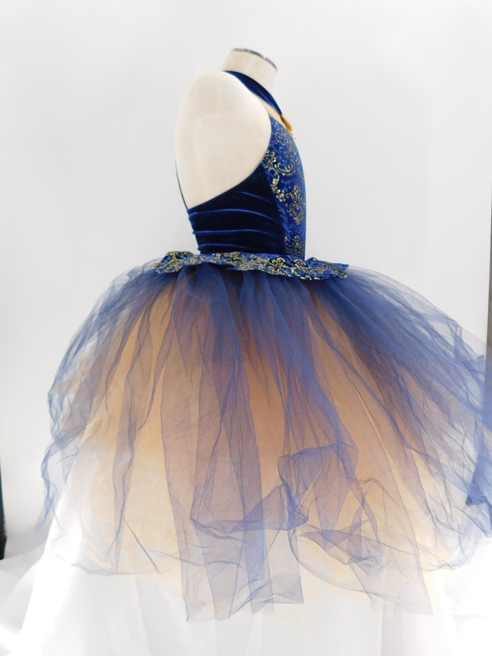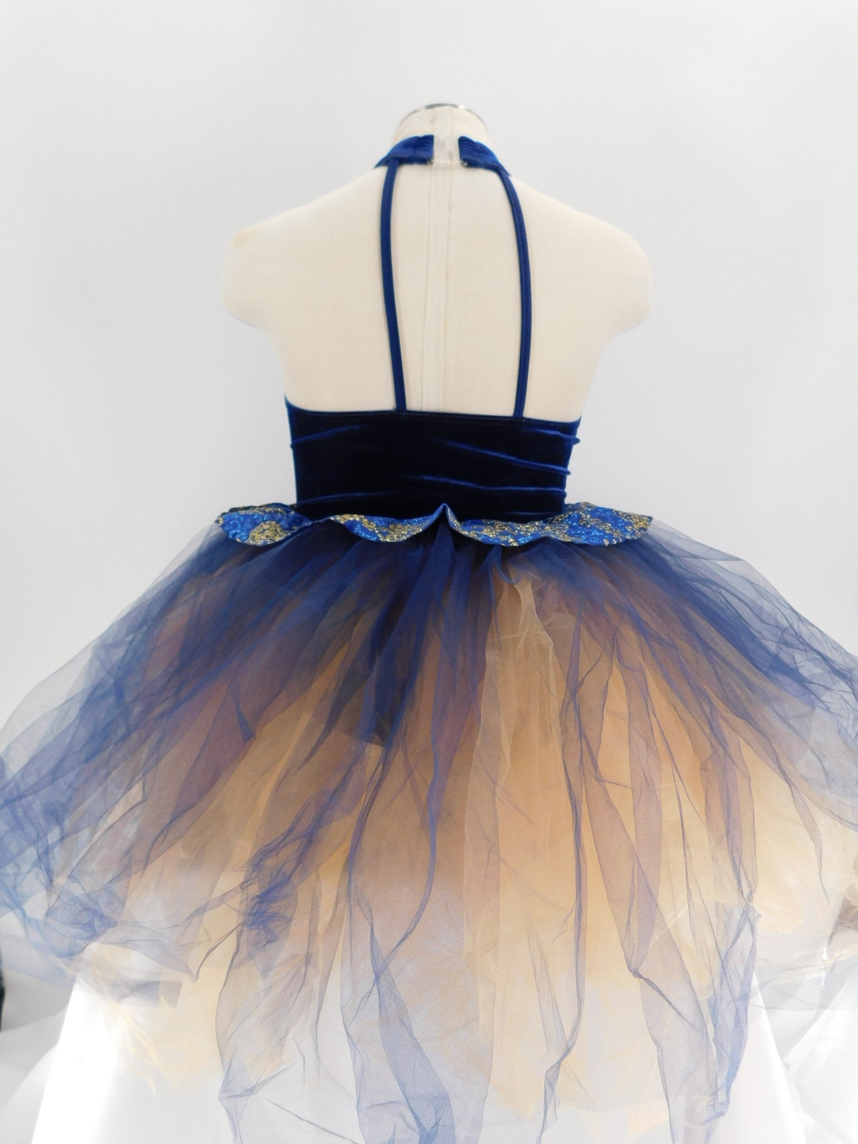 Velour halter neck leotard with gold and blue glitter embellishments on front of leotard. Nude mesh lines the neckline with gold sequin broach. 4 layered tulle tutu is gold and blue with matching velour and glitter skirting along the waist.