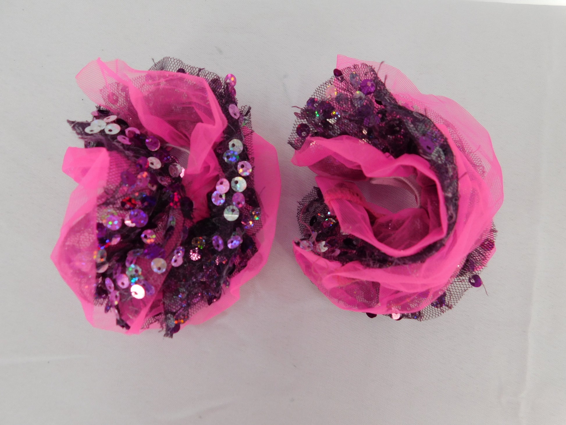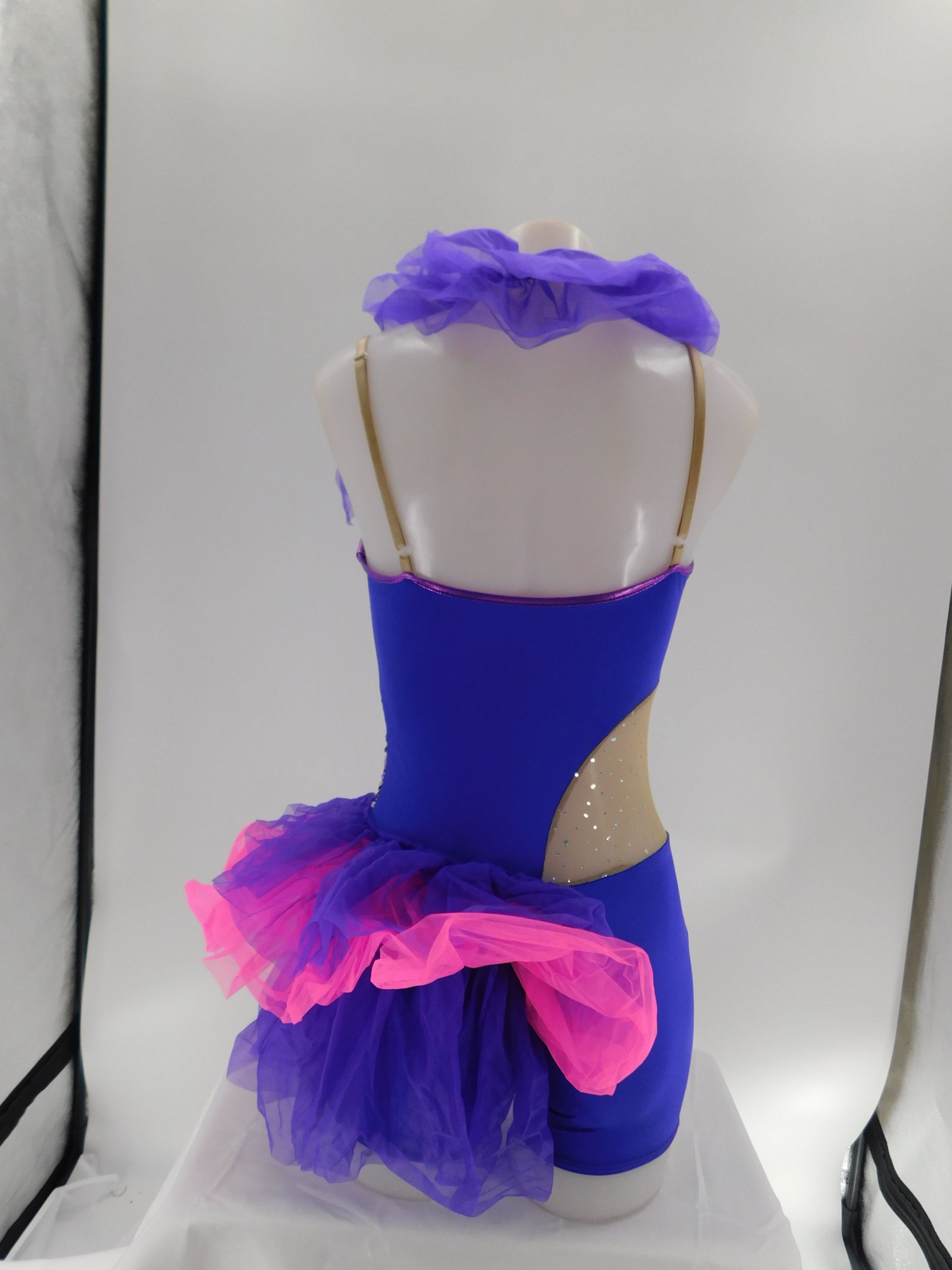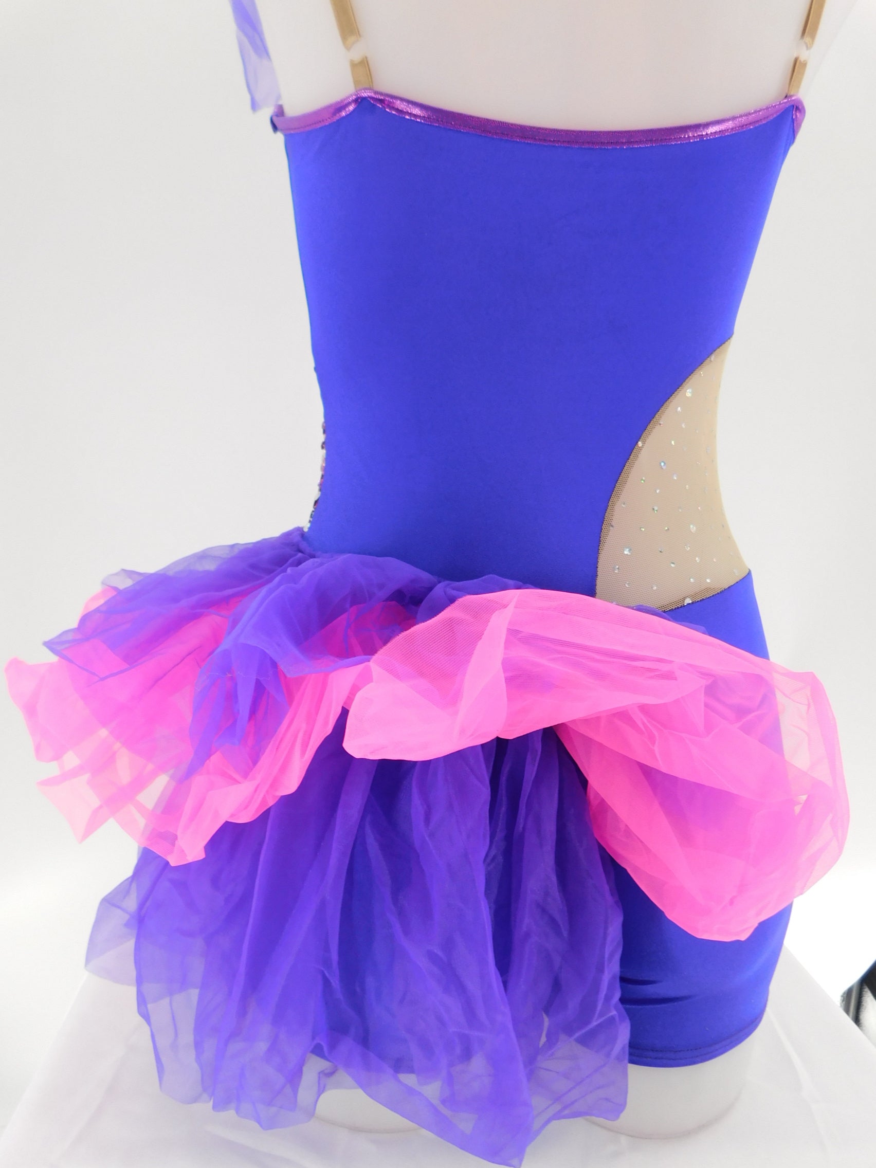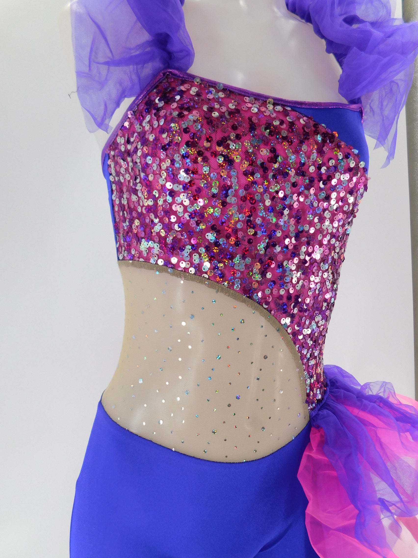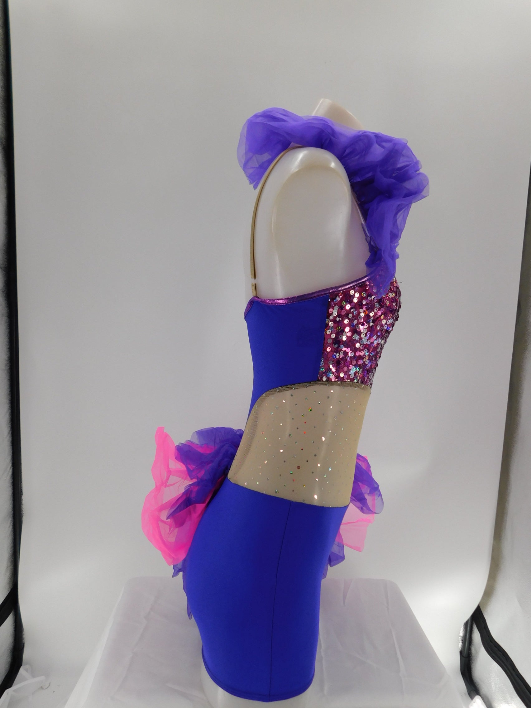 Sequined biketard with attached ruffle skirt and nude cut out in the midsection. Chiffon ruffle is attached to go around the neck. Includes arm bands.