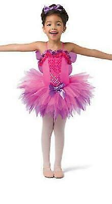 Pink Camisole Leotard adorned with pink and purple flowers along the bust, pink sequins down the middle and Pink and purple tattered style tutu for a great fairy look...WINGS NOT INCLUDED