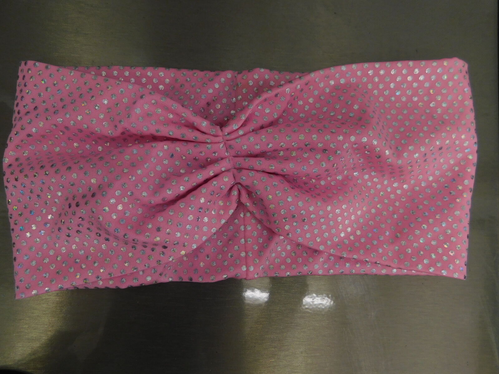 Lycra leotard with mesh foil sequin and bunching at top of bodice. Separate goucho style pants and elastic waistbank mesh skirt are included for a 2in1 costume. Headband is included also.