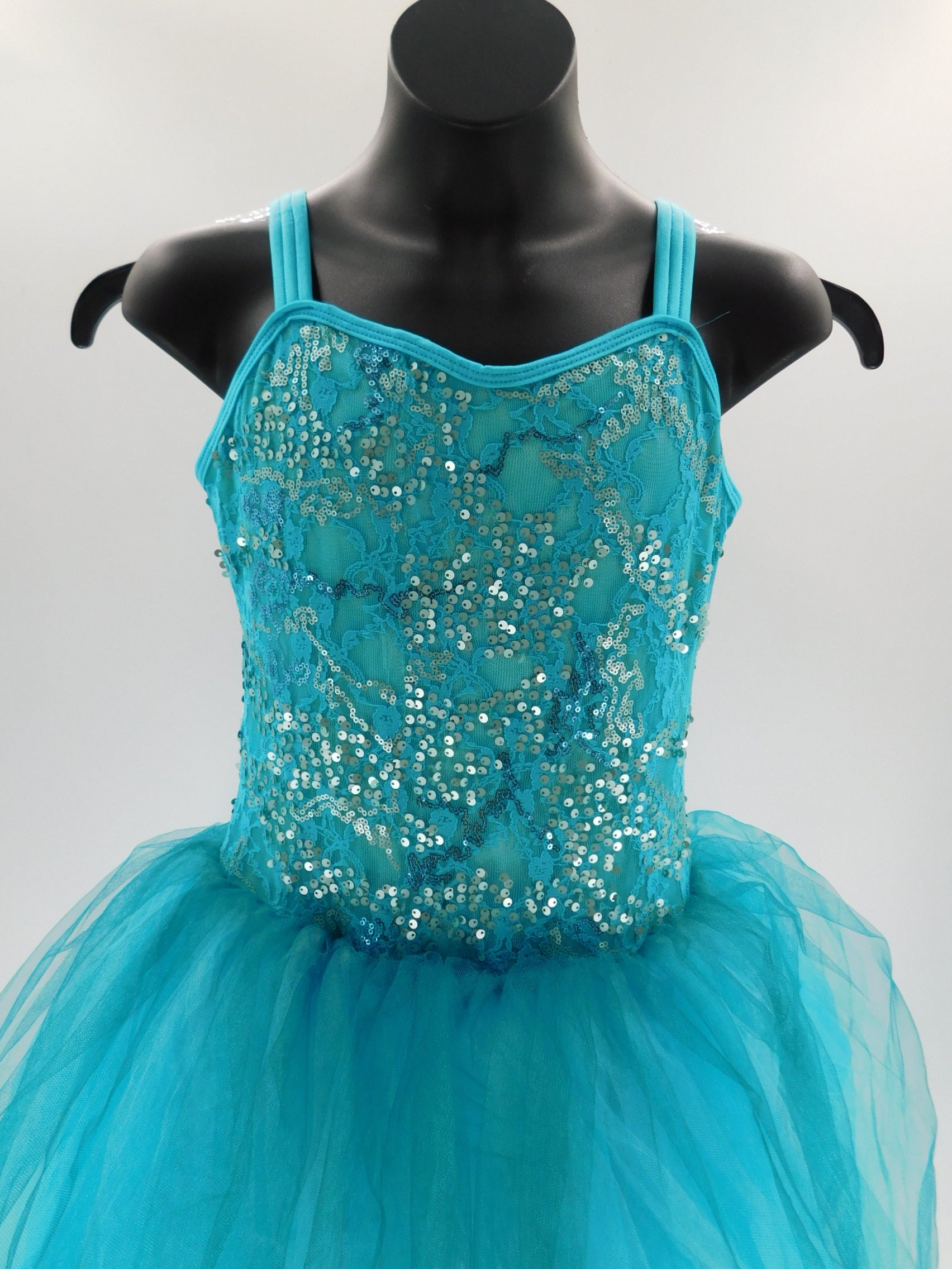 Lace and sequin spandex leotard with attached long tutu. Bottom of tutu is lined with matching ribbon.