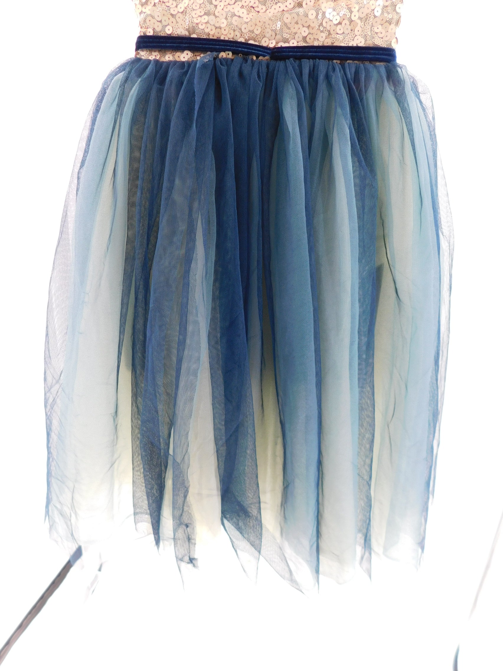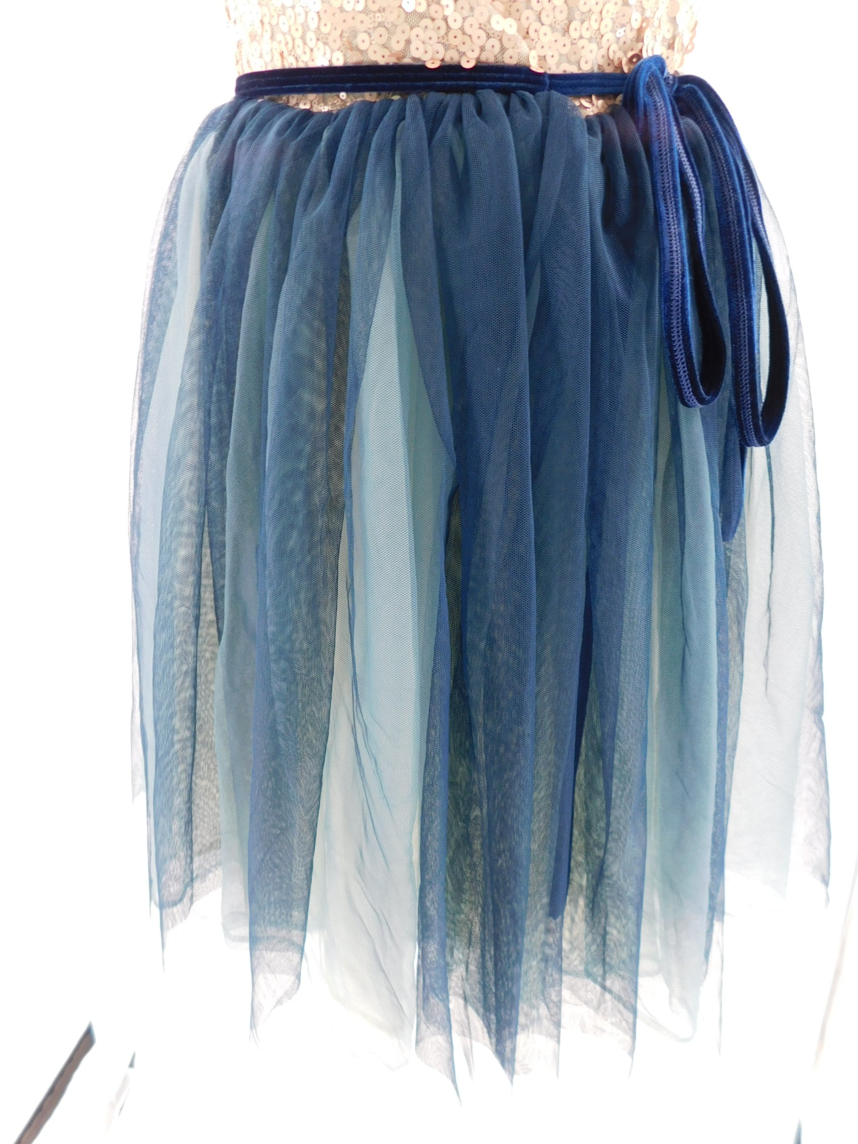 Lycra leotard with rose gold sequined bodice, square neckline, clasp closure at the neck. Attached long layered tulle tutu and belt to tie in the front.