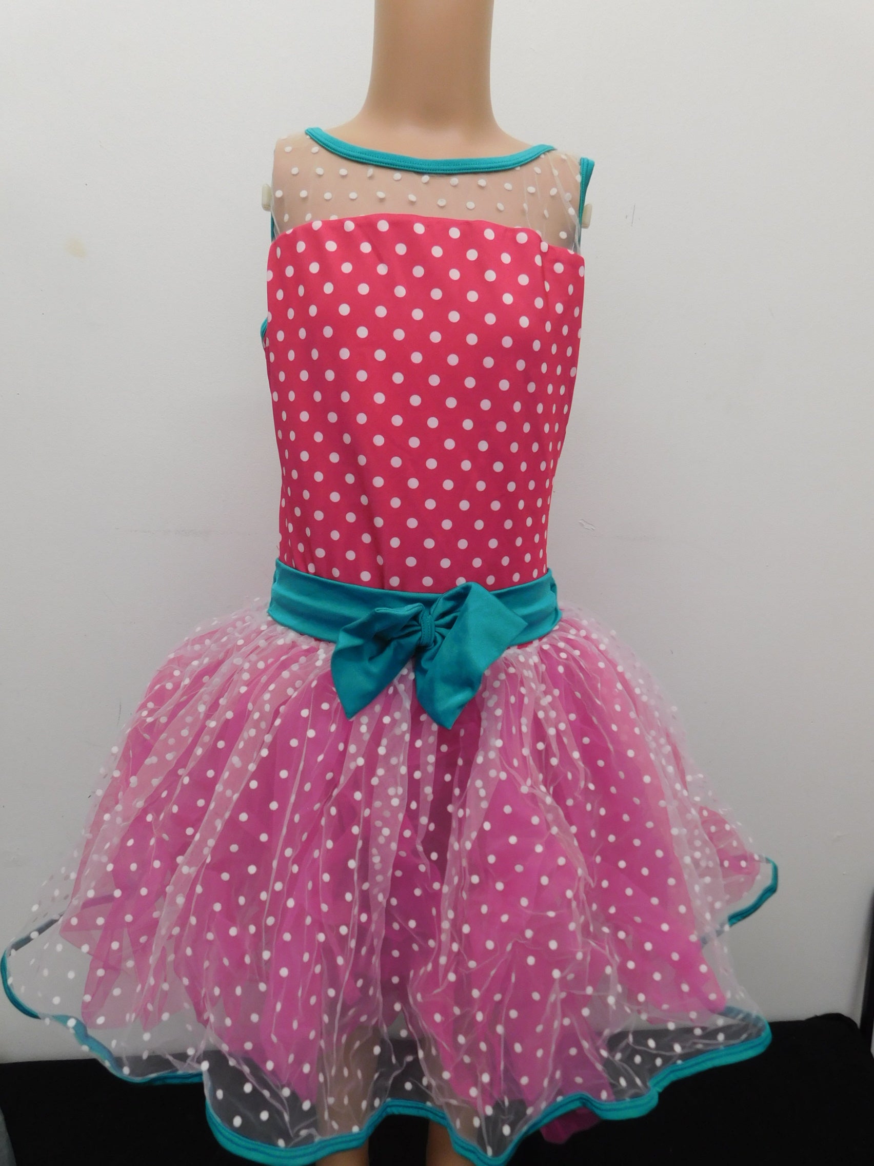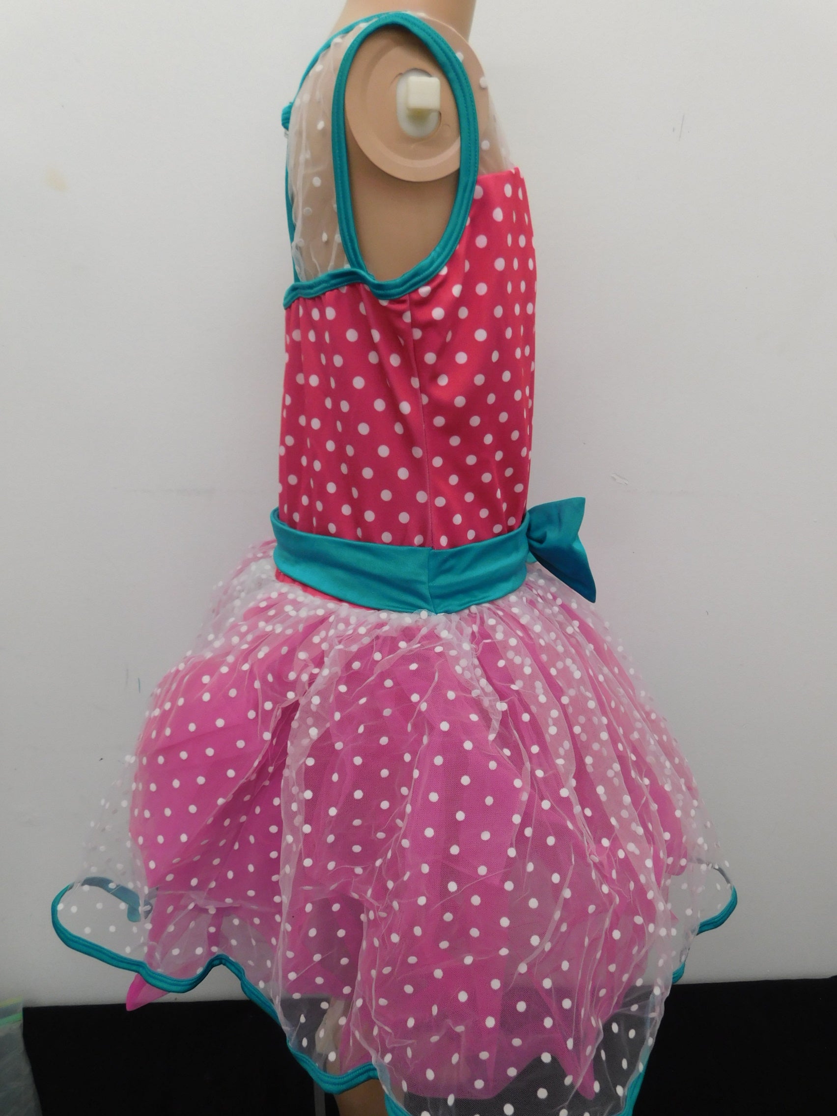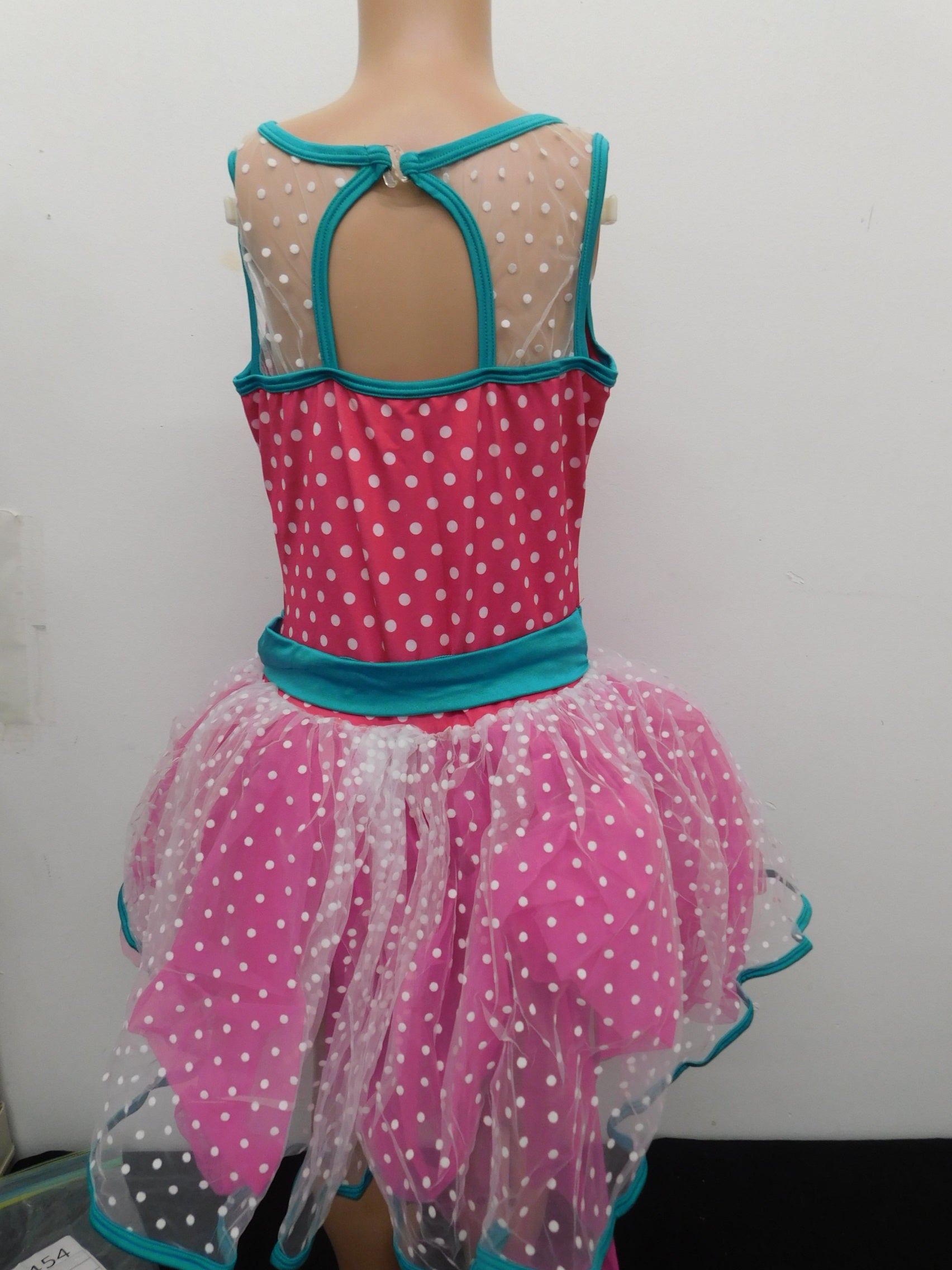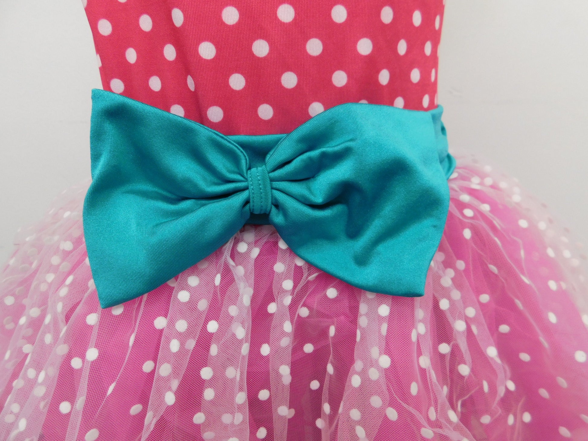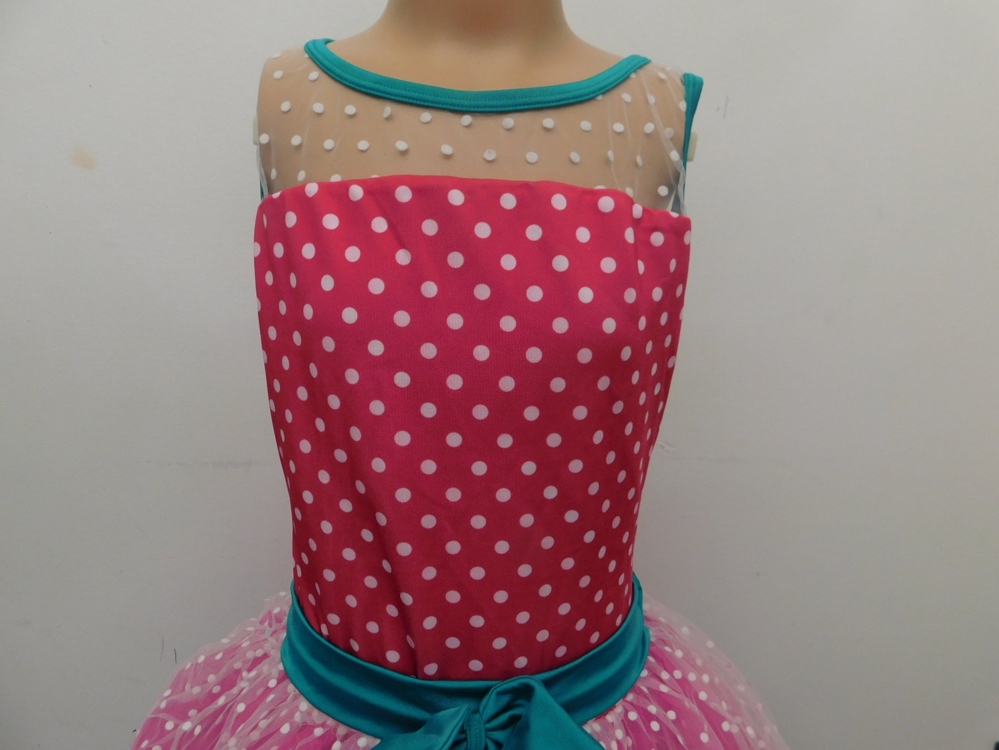 Leotard with attached tutu. Has mesh straps and keyhole cutout on back. Attached is a belt and is covered in white polka dots.