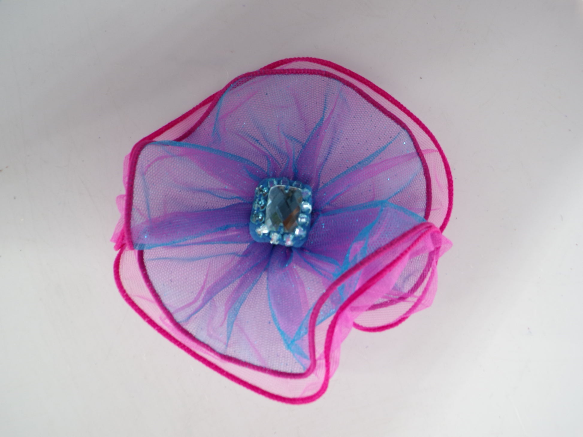 Sequined leotard with attached layered tutu. Ruffles on the sleeves. Bejeweled flower attached to left hip, and matching hair flower included.