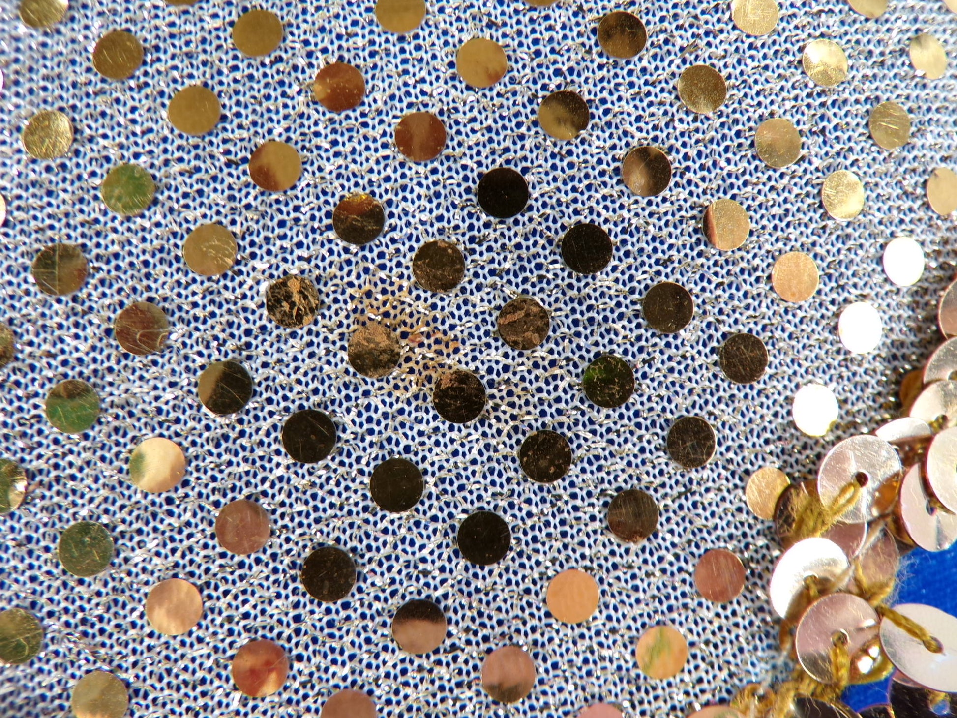 Sequin chest with velvet bodice. Hanging sequin strings with feathers attached at the end. Attached skirt/tutu lined with sequins.