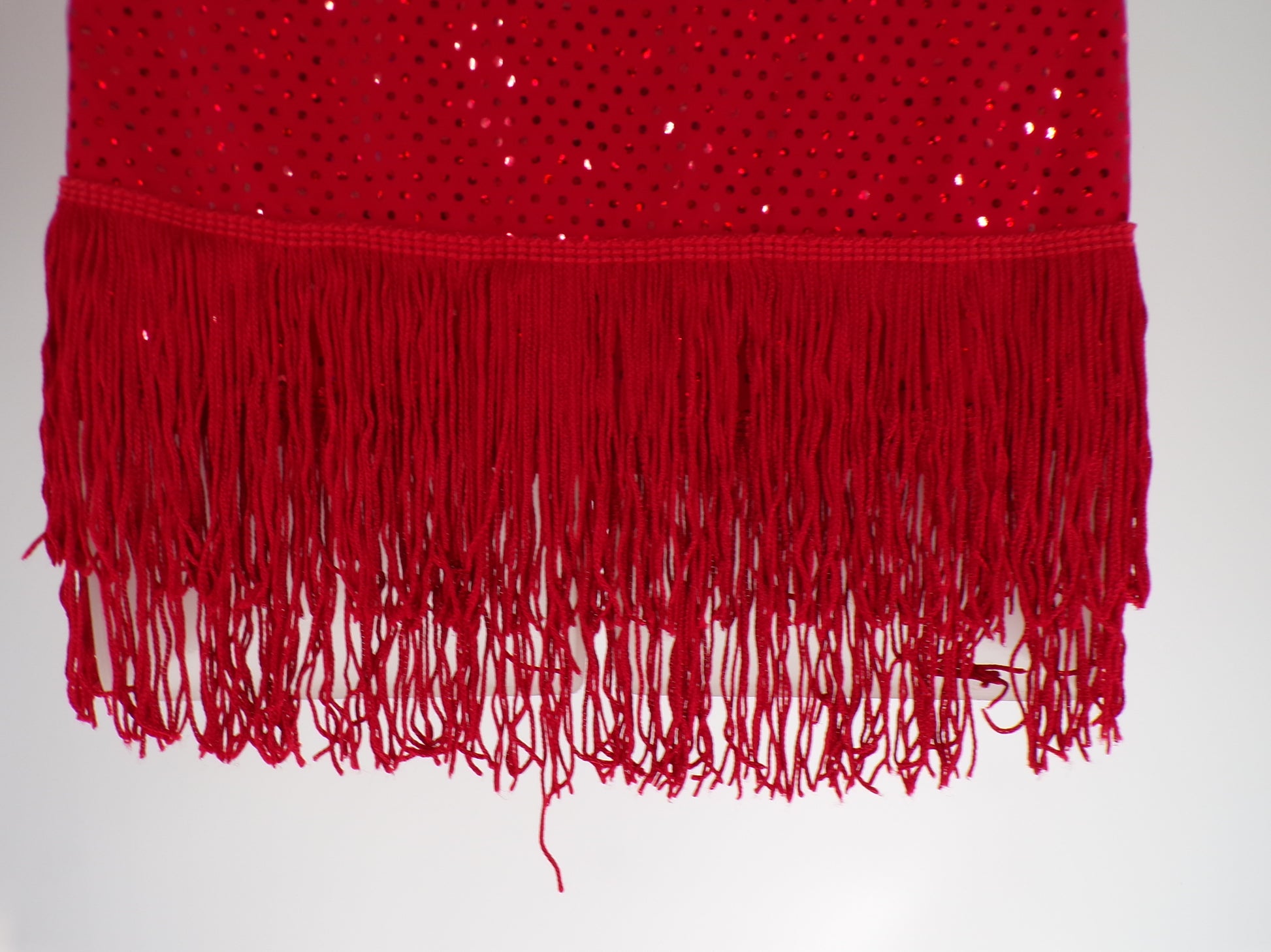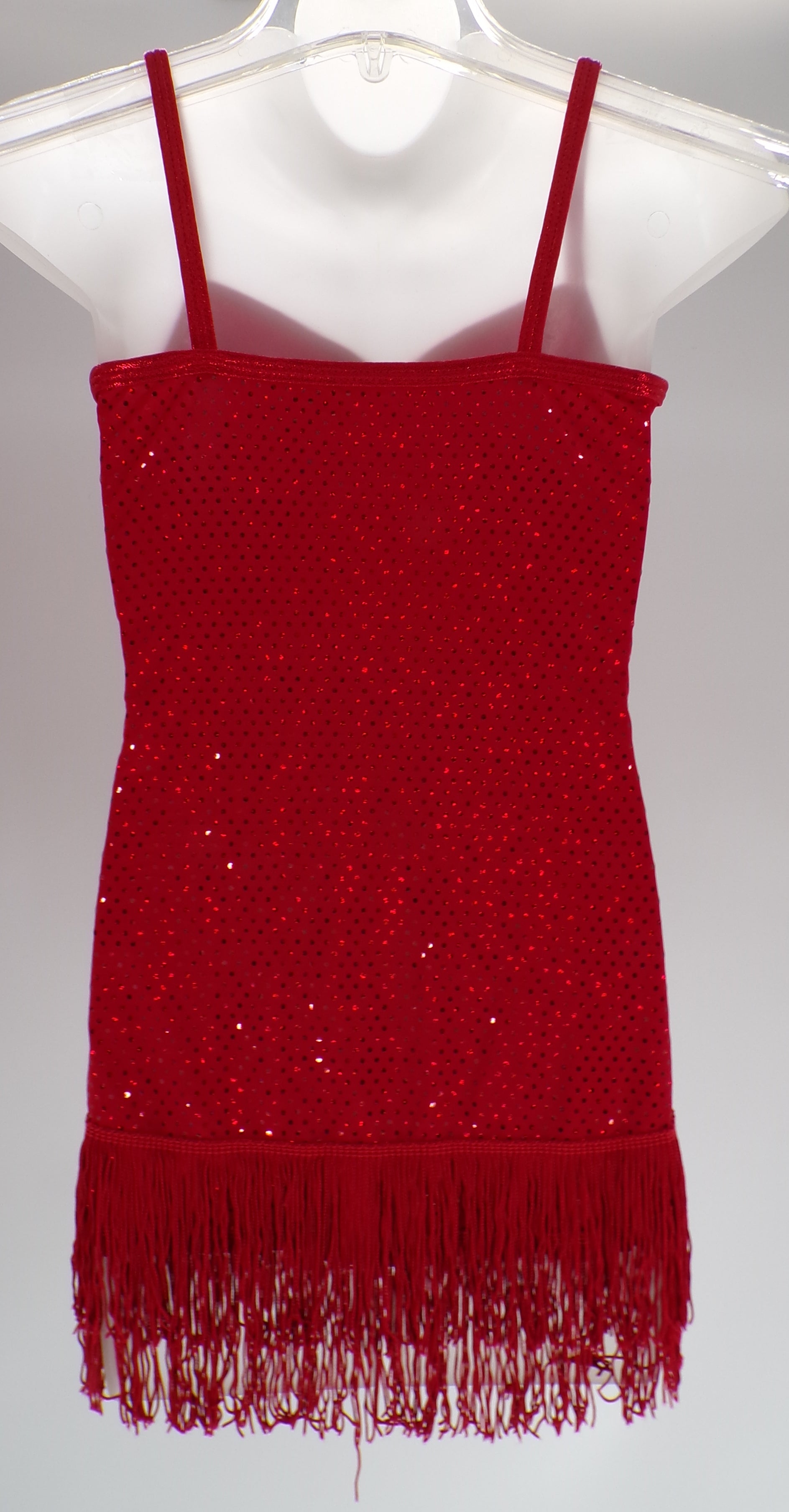 Foil Dot Blue Dress with Fringe at the bottom. Also has a rhinestone buckle with attached belt at the empire waist - NO trunks or leotard attached