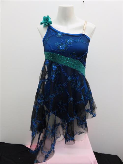 Blue camisole leotard with one nude strap and Green flowered adornments on other shoulder strap. Black net overlay dress with green and blue sequined applique flowers. Green sequined asymmetrical waist with opposite asymmetrical skirt