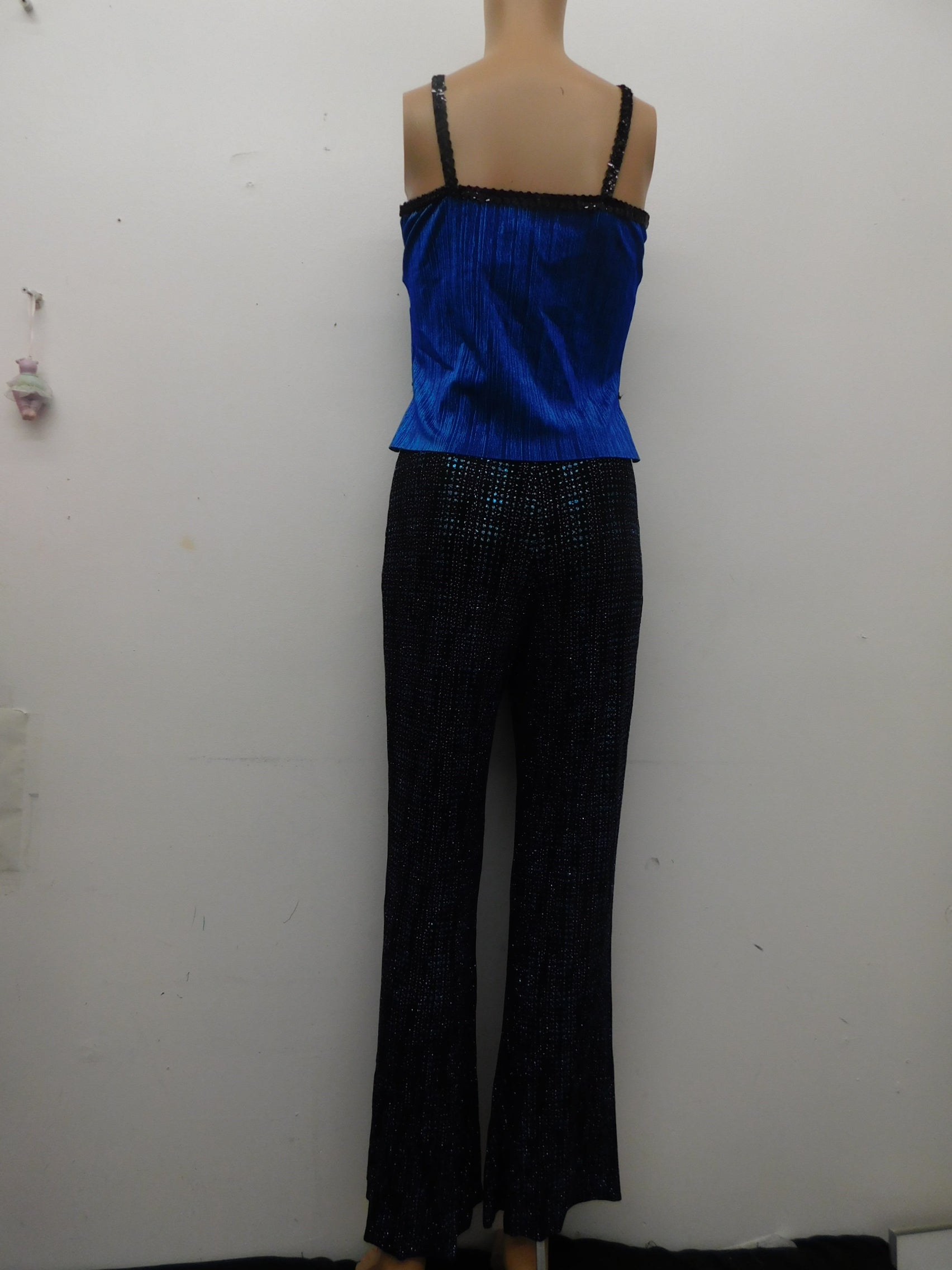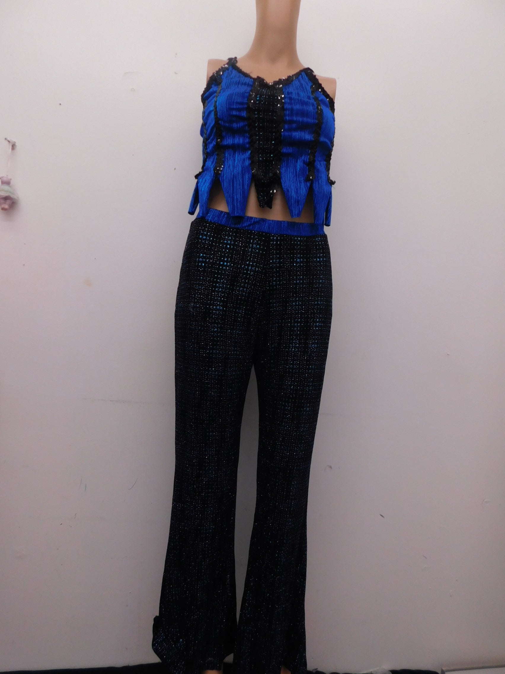 2 piece costume includes stretchy corset like top with handkerchief style bottom and stretchy pants with glitter pinstripe detail.