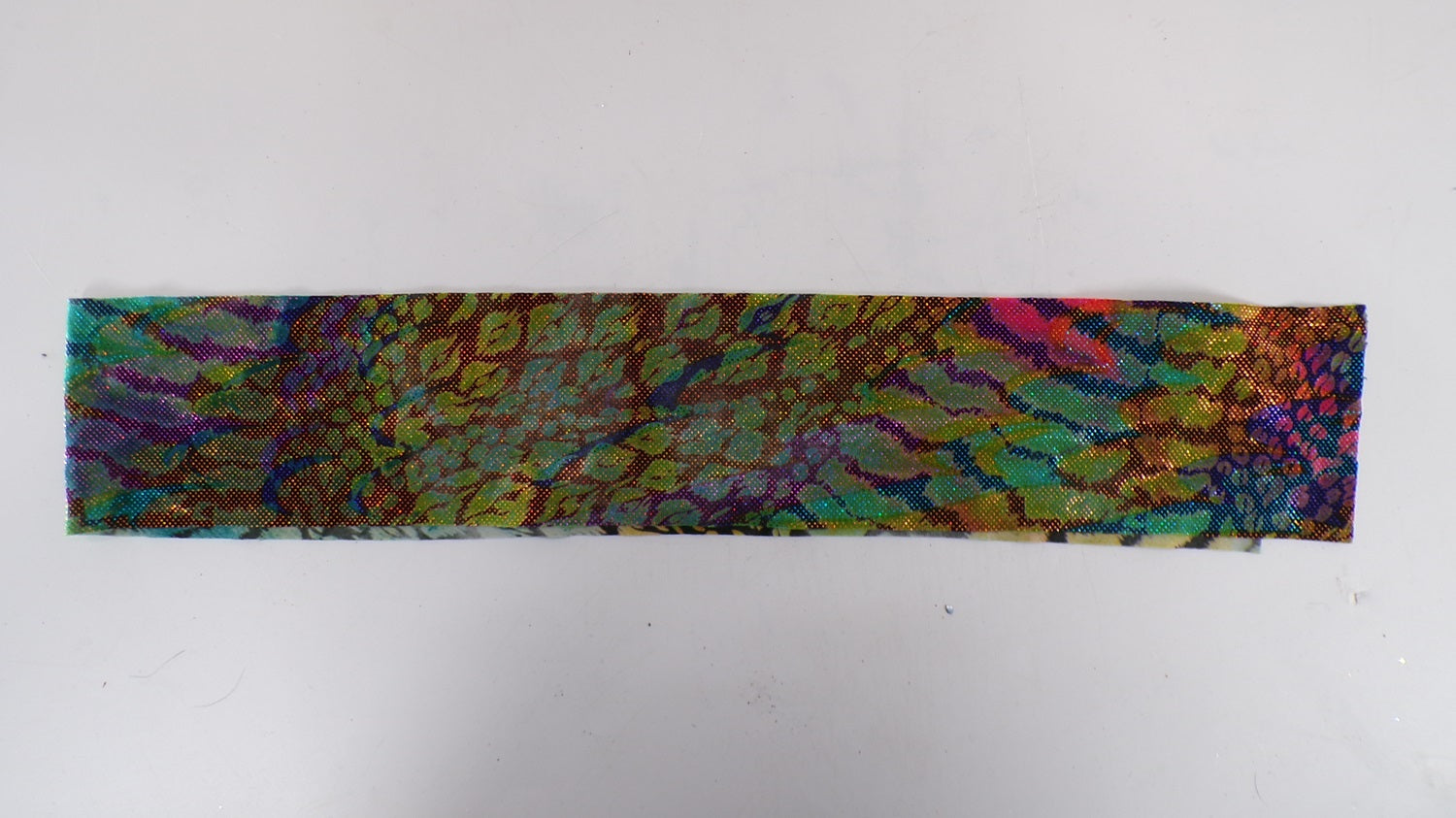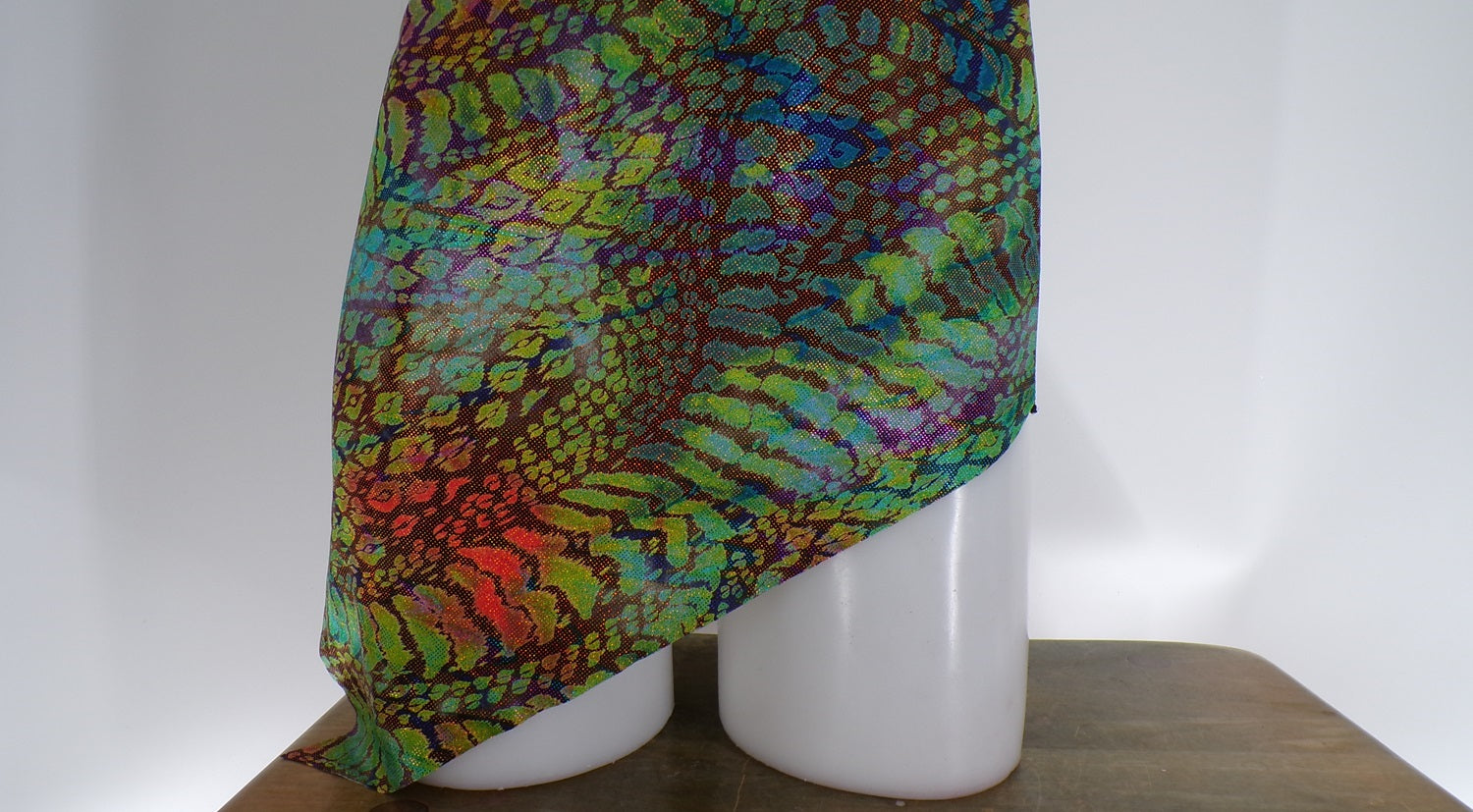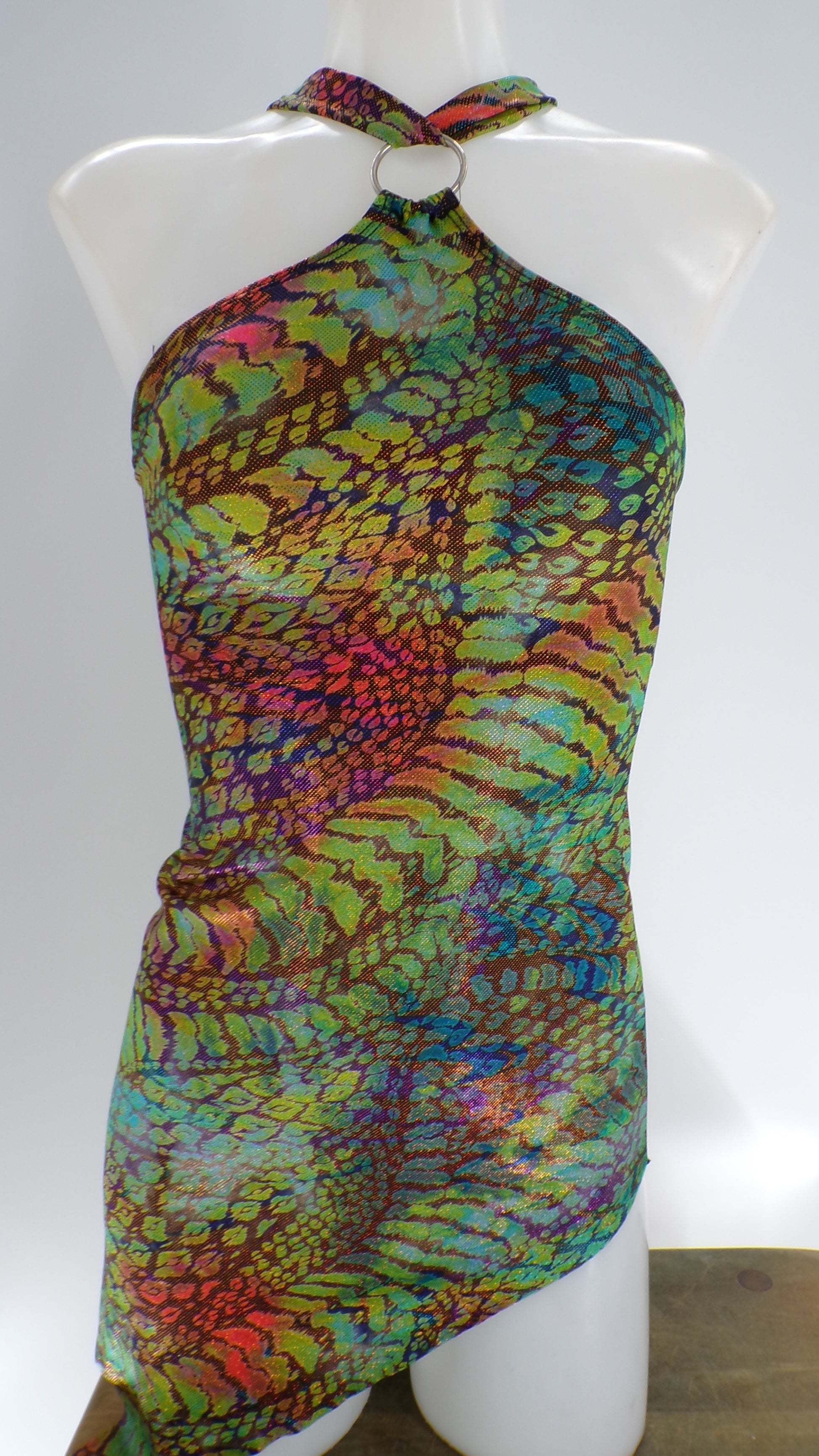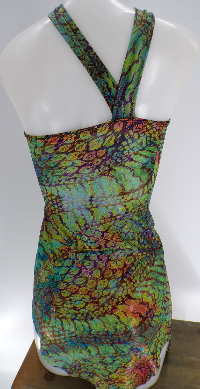 Spandex asymmetrical dress with metal halter neck holder. Print of the dress is snakeskin-like. Straps cross in the back. Trunks or briefs are NOT included. Matching fabric for hair IS included.