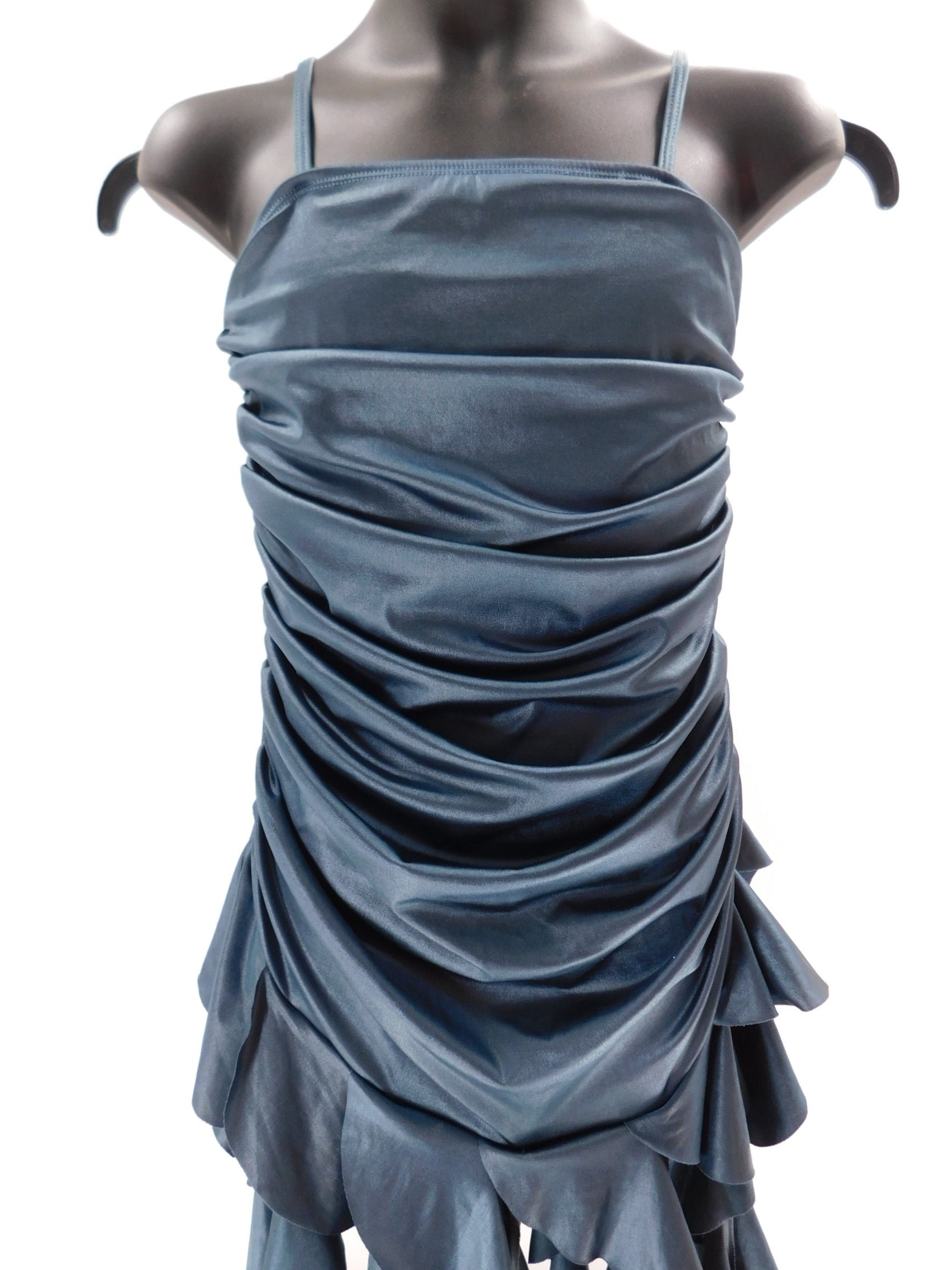 Bluw cami shiny metallic dress. Dress gathers on either side. Ruffled pieces hang below as skirt. Includes matching Blue trunks.