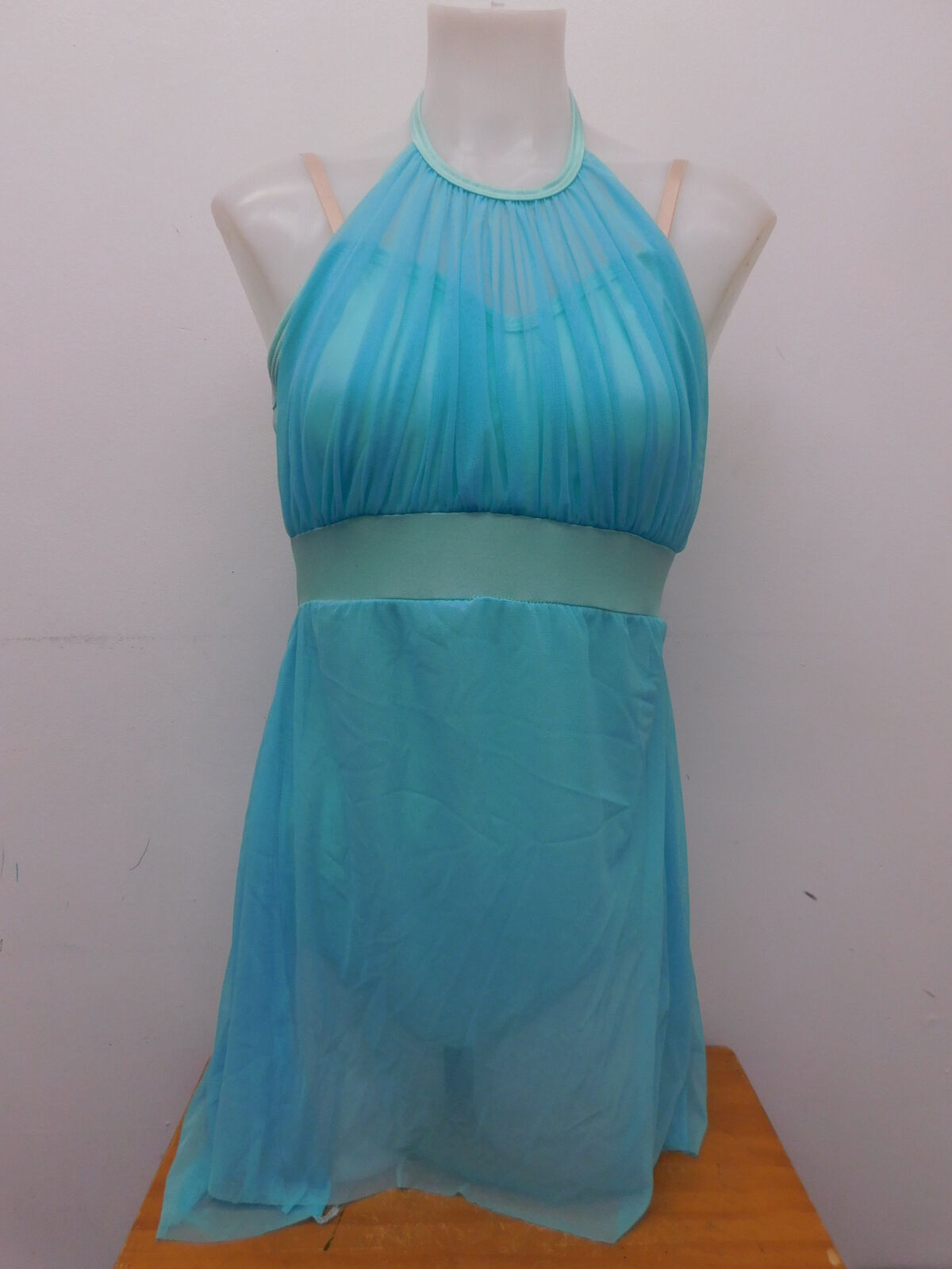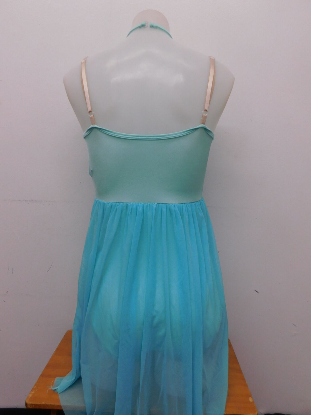 Leotard with attached mesh skirt and adjustable nude straps. Mesh halter neck is attached and has closure behind the neck.
