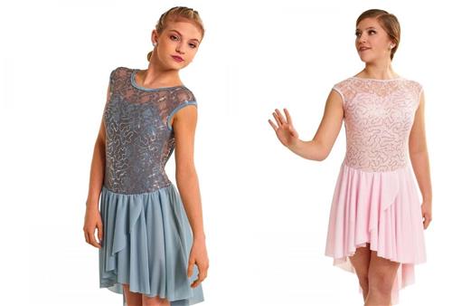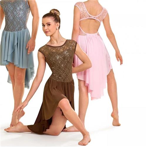 Nylon/spandex leotard with sequin stretch lace front bodice overlay, and attached crepe skirt. DOES NOT INCLUDE: rhinestone barrette (not shown). Made in the U.S.A. of imported fabric.