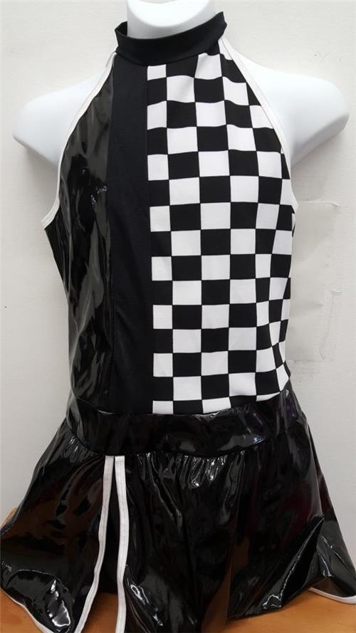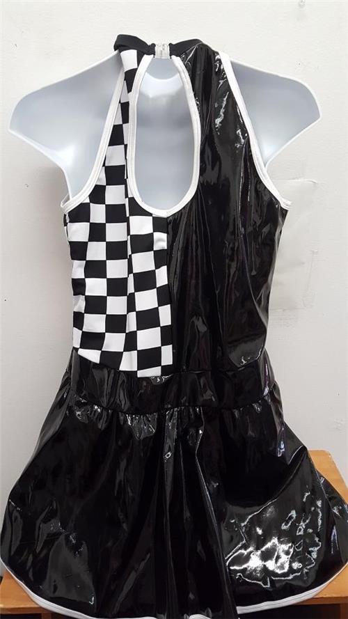 Pleather checkered dress with attached trunks. Black is metallic and white is Nylon.
