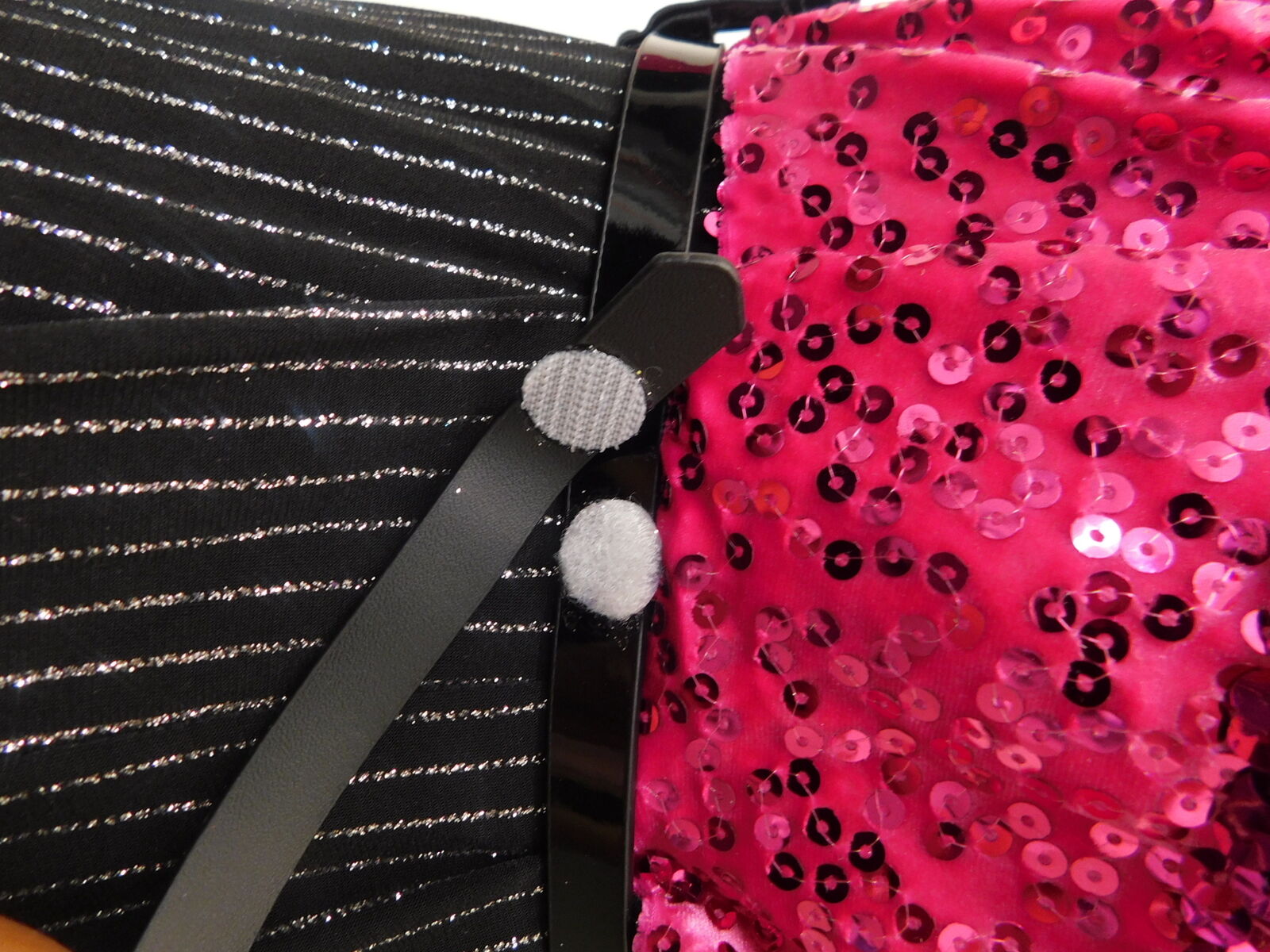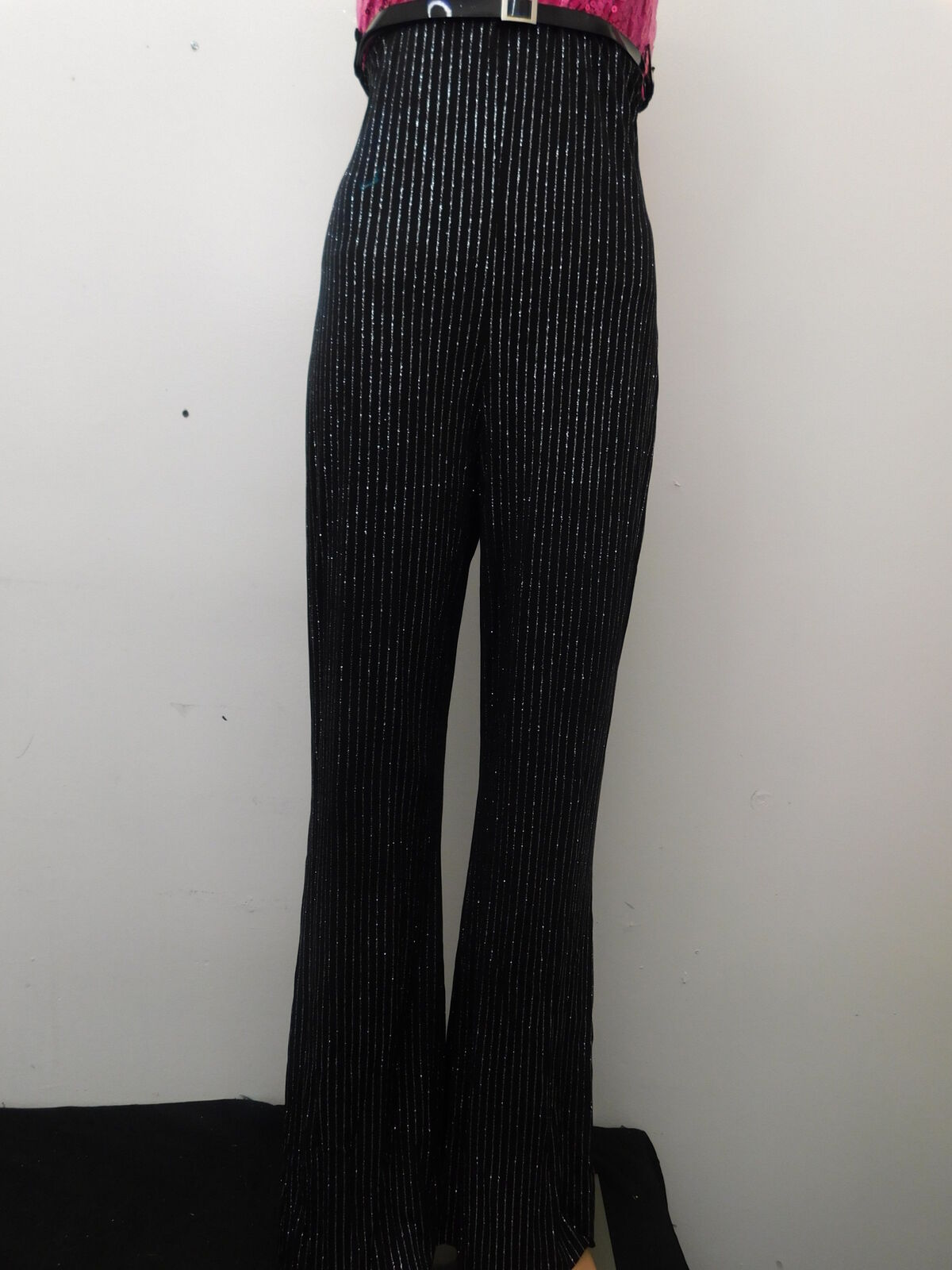 Tuxedo style unitard with flare leg pinstripe pants and sequined velvet bodice. Straps criss cross in the back. Belt and fedora are included.