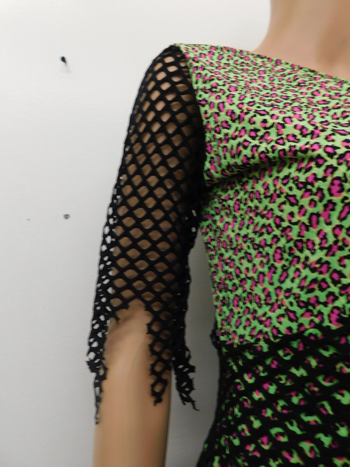 Lycra leotard with attached mesh material over neon cheetah print. Handkerchief skirt is attached and it also includes separate mesh pants. Arm mitt and hair accessory included.