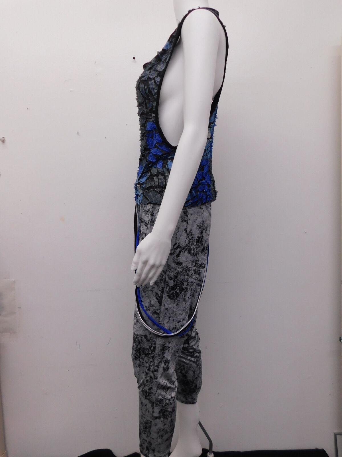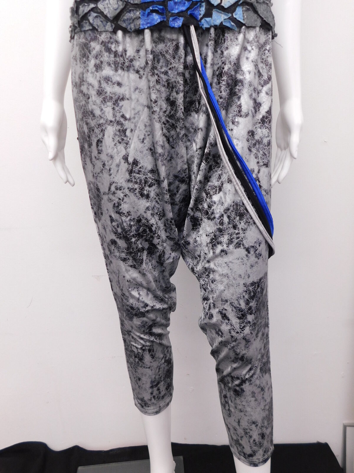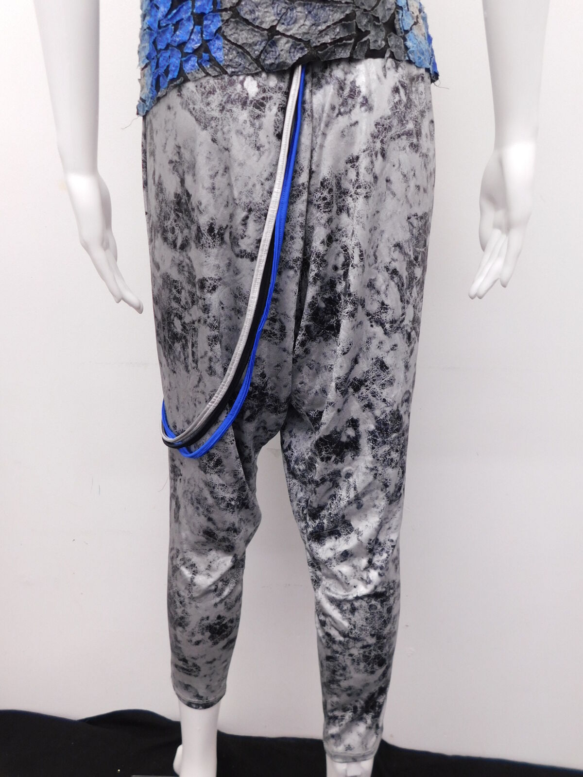 Razorback tank with shredded like piecec of fabric. Pants are harem style with attached string belt.