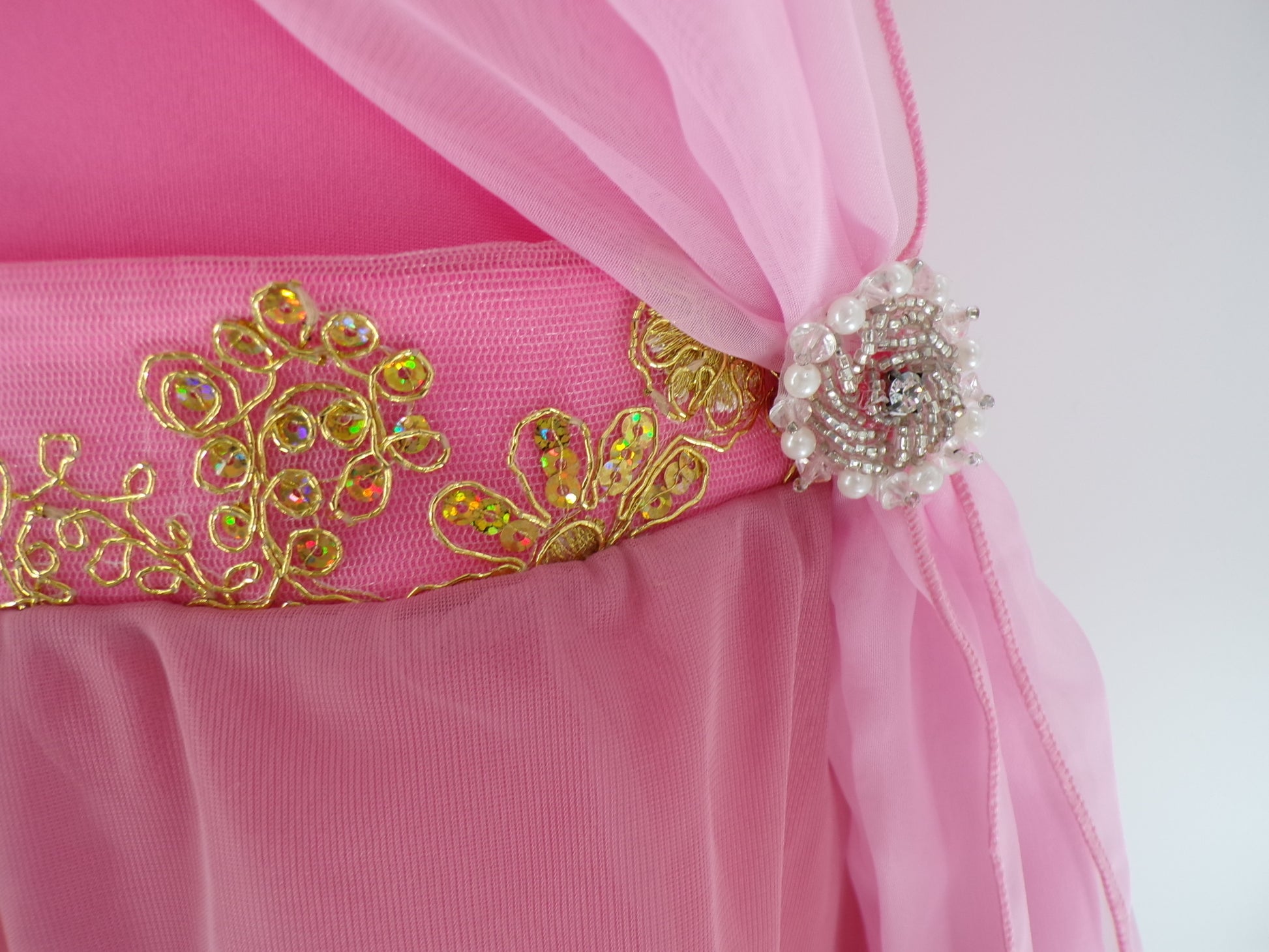 Brand: Ferreira Size: Adult Small Adult Colors: Pink Pink Peach Gold Great For: Contemporary Modern Lyrical Ballet Features: Solid Spandex 3 pc costume includes leotard with lace and sequins on the top left and flowy fabric on the right shoulder, bike shorts, and skirt with matching lace and sequins.