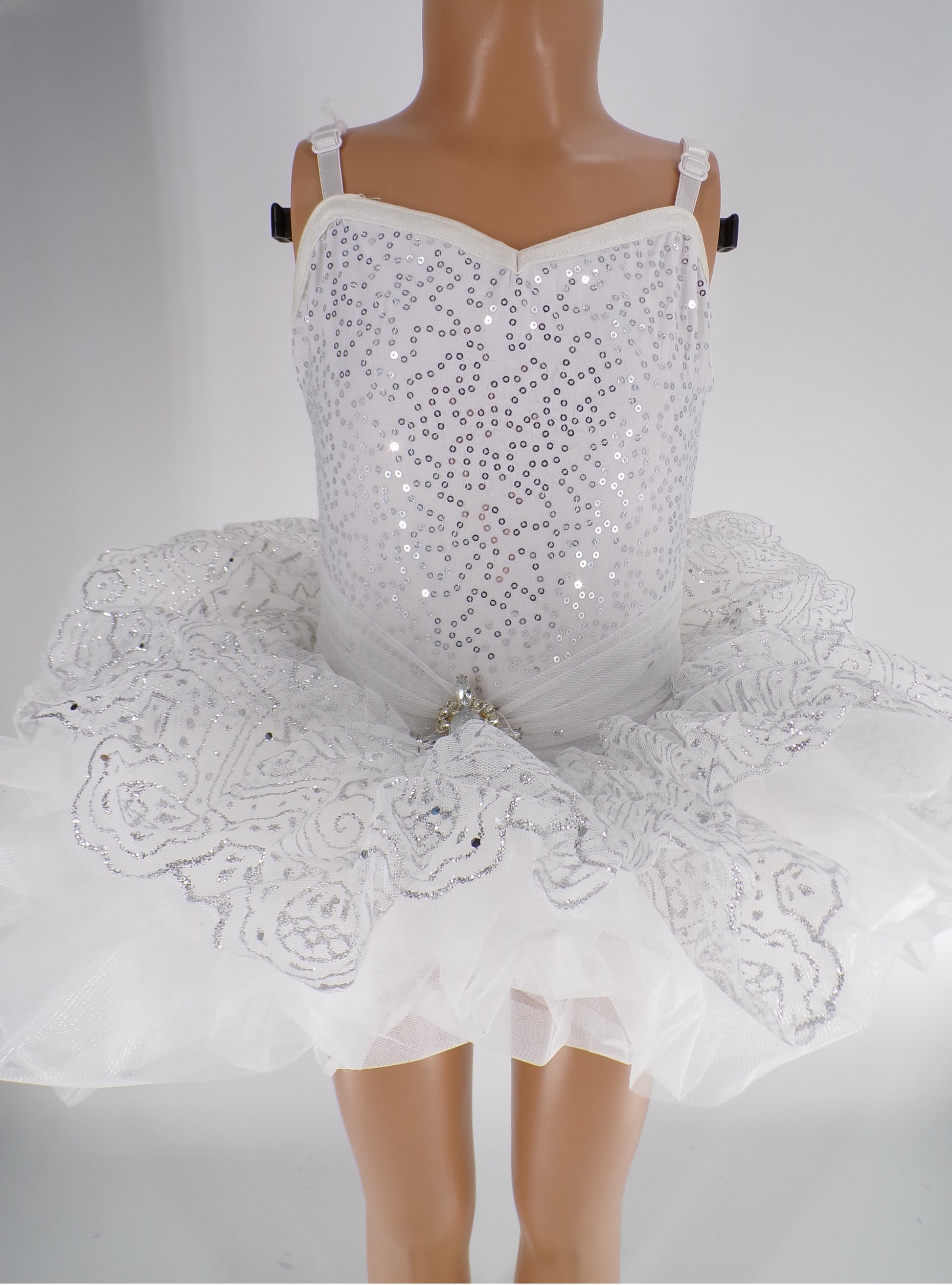Silver sequined leotard with attached glitter tulle skirt. Rhinestone jewel embellishment is attached to the waist. Straps are adjustable.
