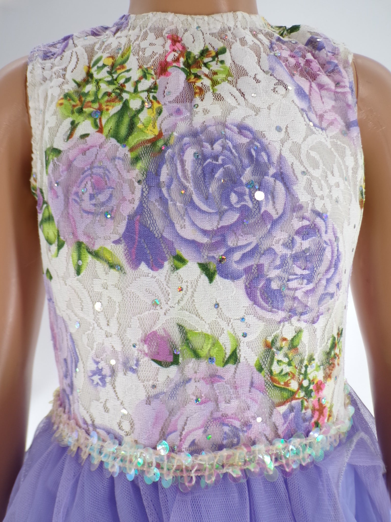 Lace leotard with foil dot sequins and floral print. Attached mesh tutu. Snaps behind the neck.