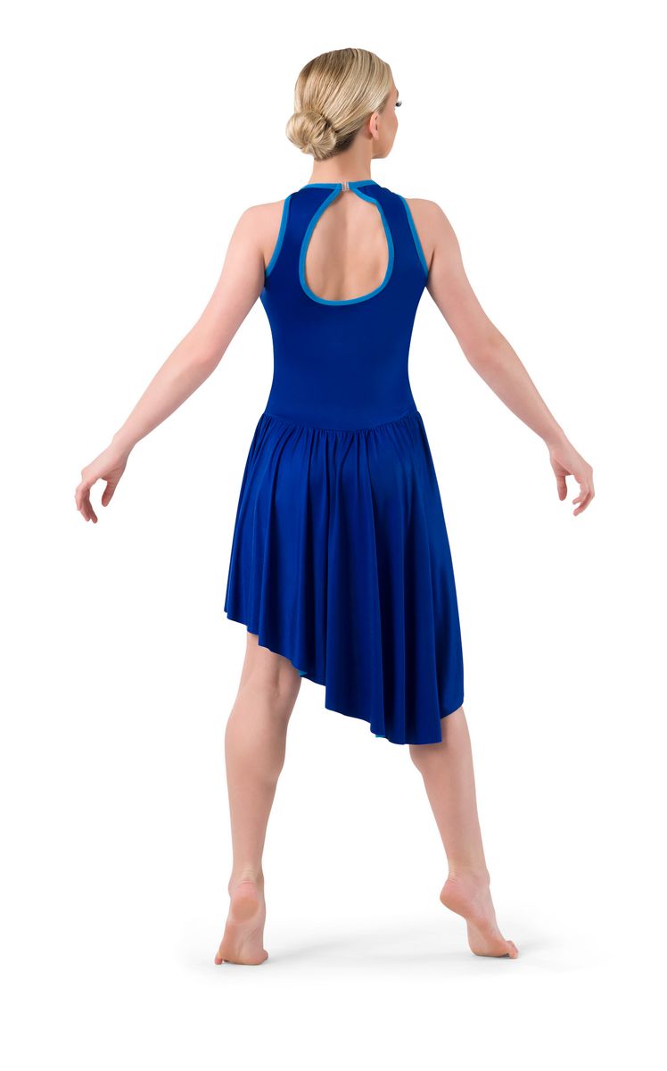 Silky stretch front lined leotard with cut-out detail. Keyhole back with clasp closure. Attached contrast silky stretch skirt. Contrast binding trim. Imported.