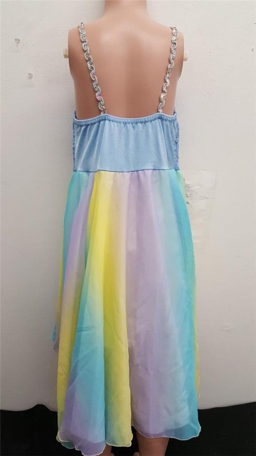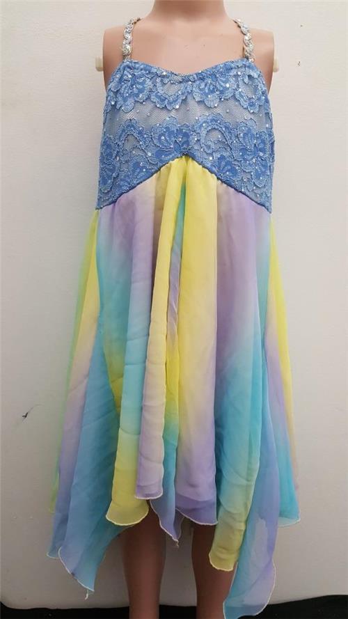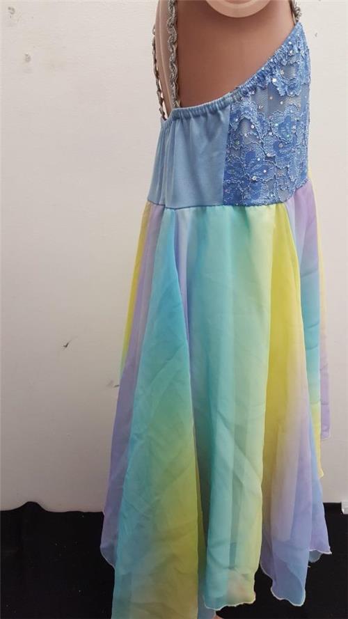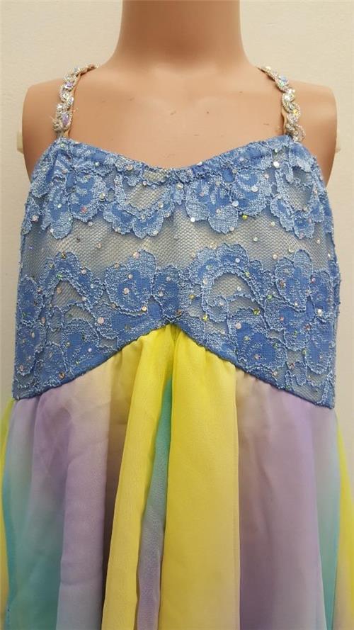 Cami dress with silver sequins on straps. Blue lace bodice with beautiful yellow, purple, blue pastel skirt. Leotard is attached.