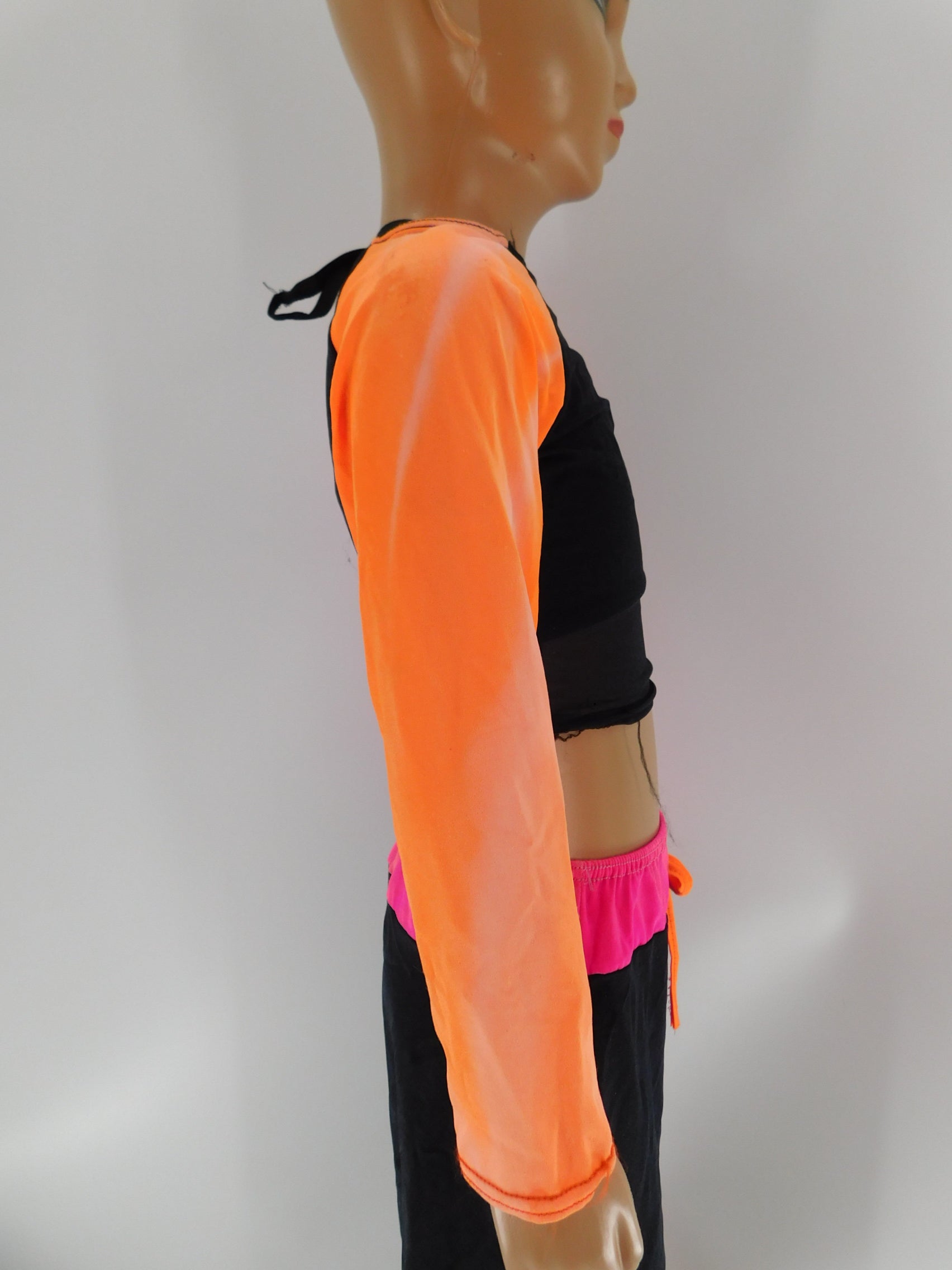 3 piece costume includes bra top that ties around the neck, mesh and spandex crop top, and matching jogger pants.