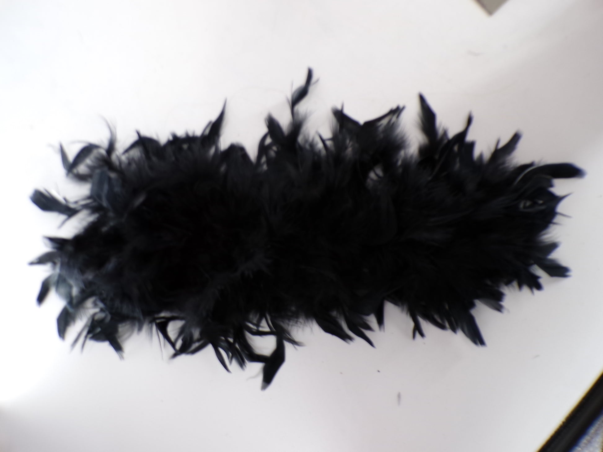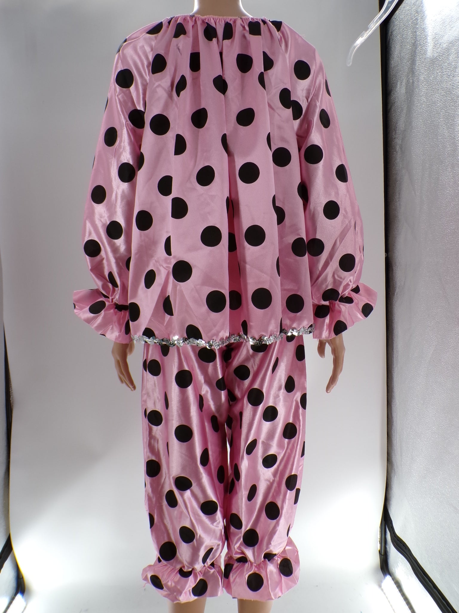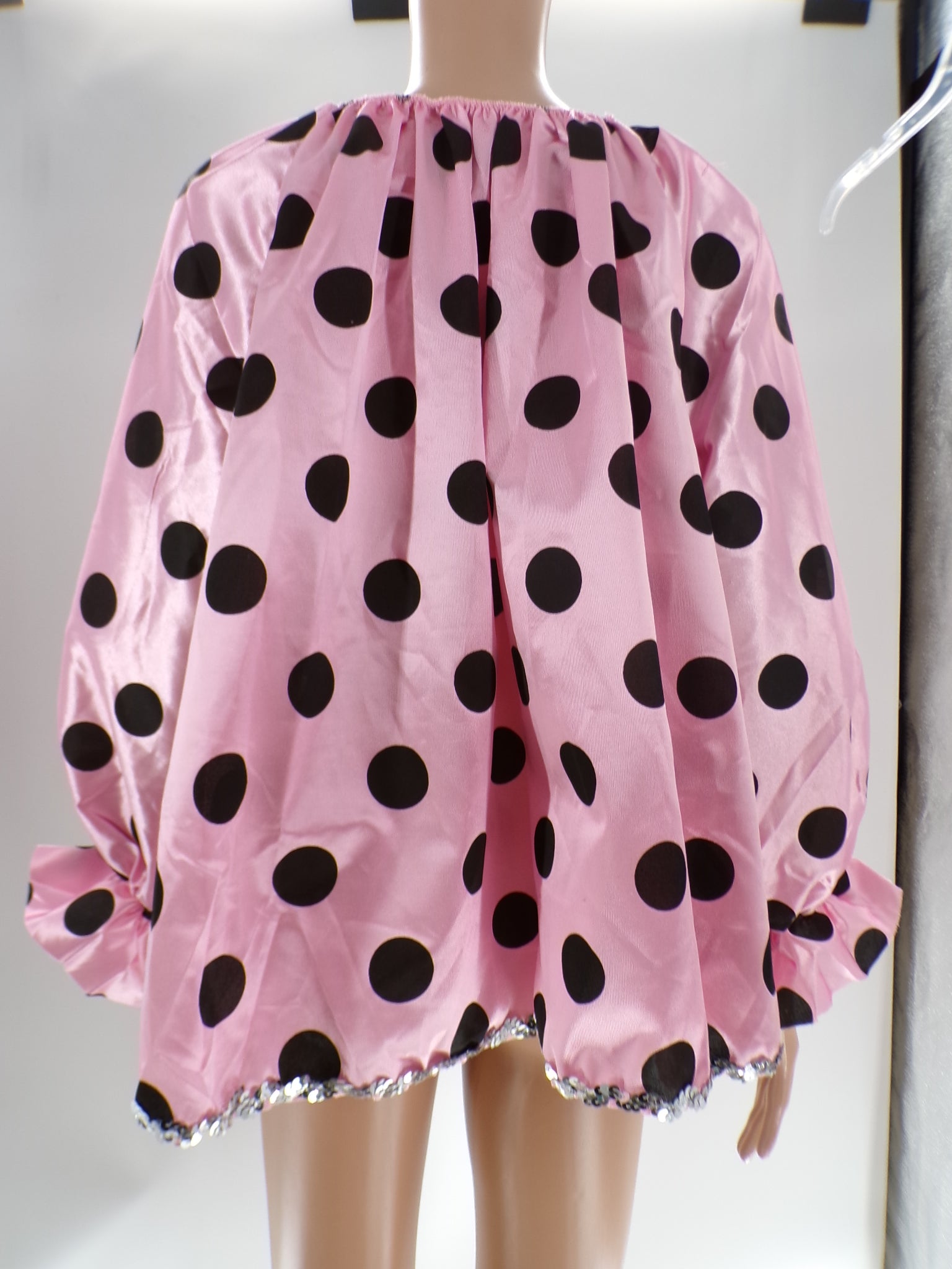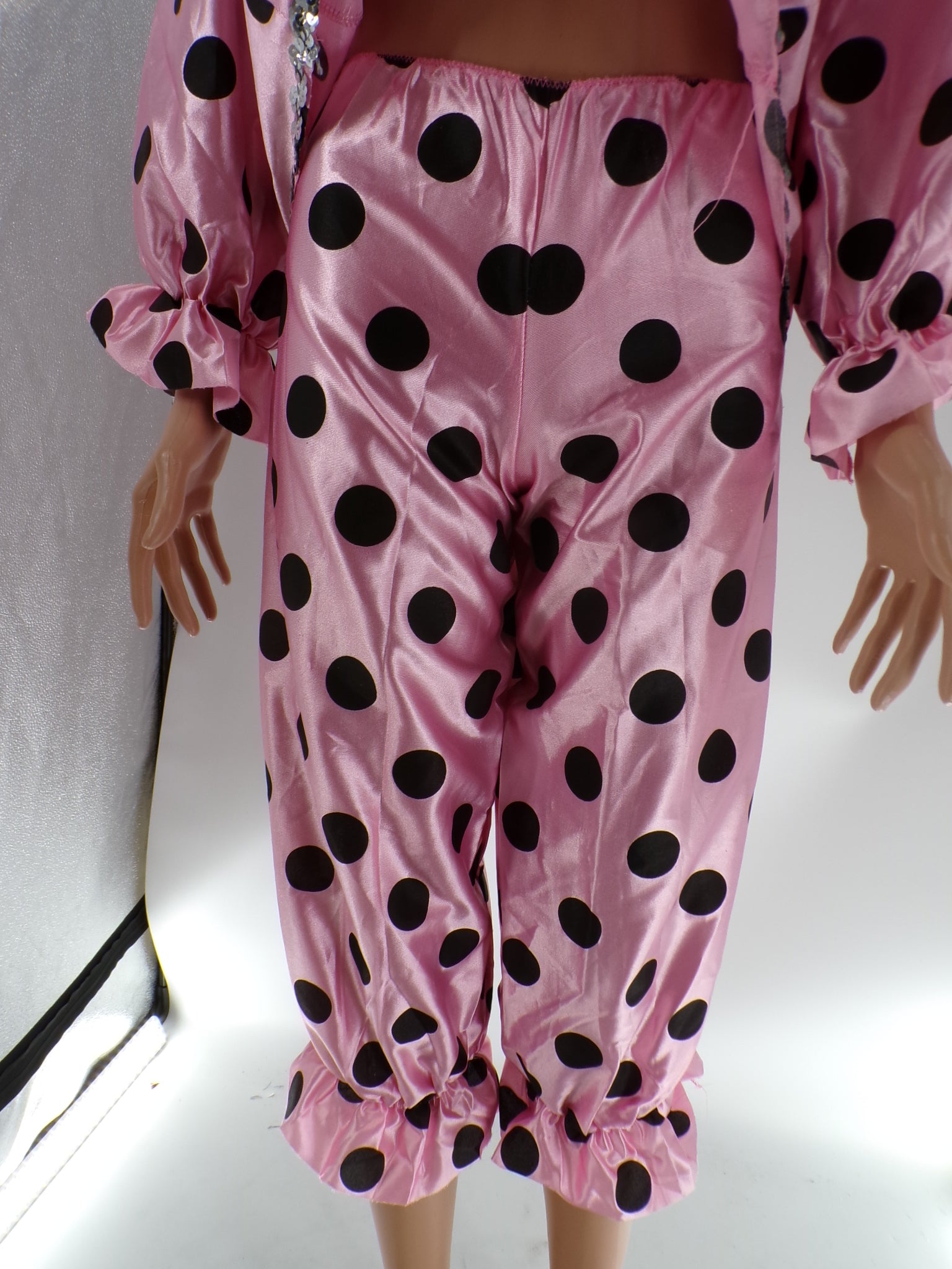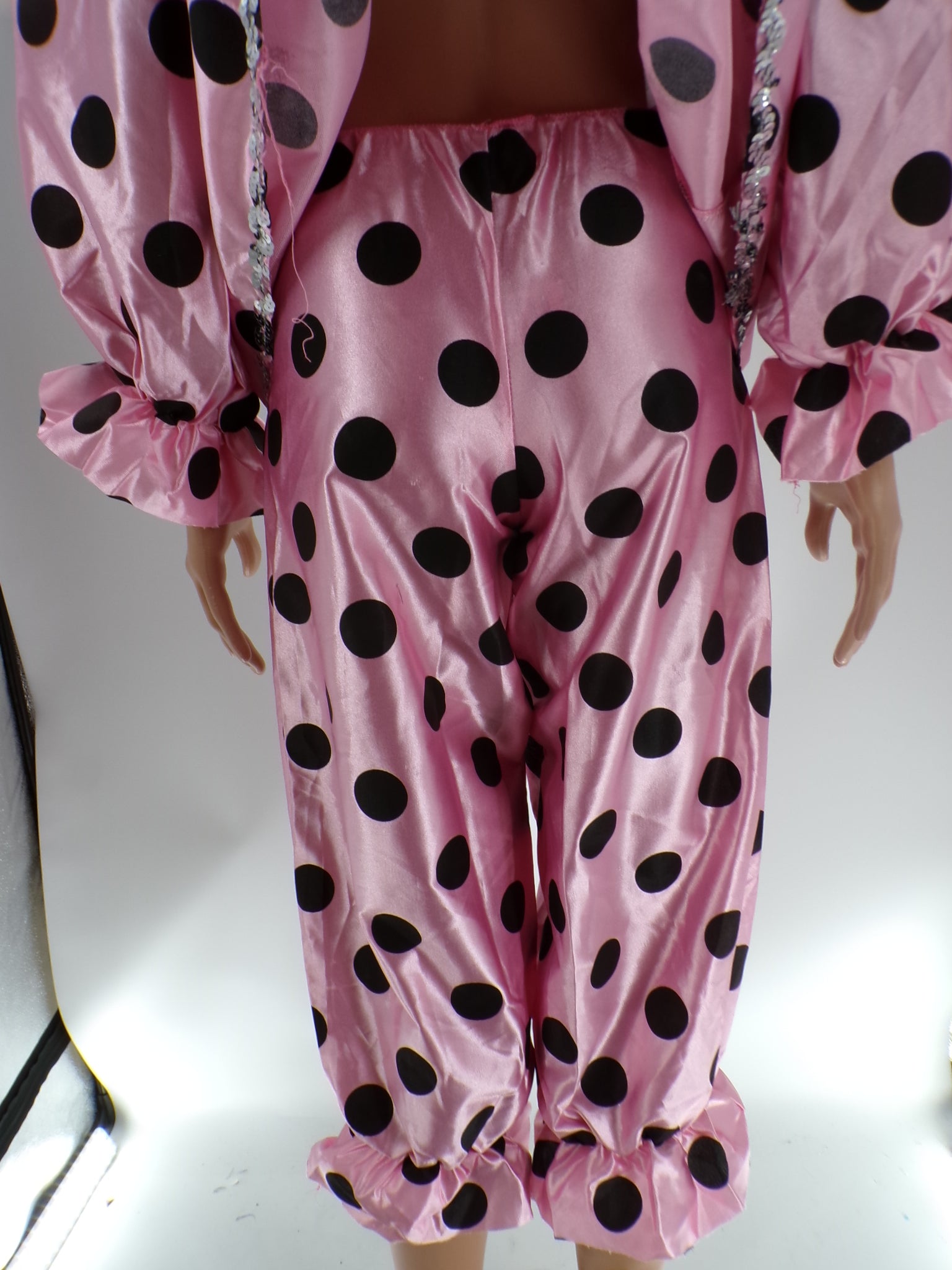 Oversized long sleeve top with sequined heart embellishment, matching pants with ruffles and polka dots. Head accessory and feather accessory is included.