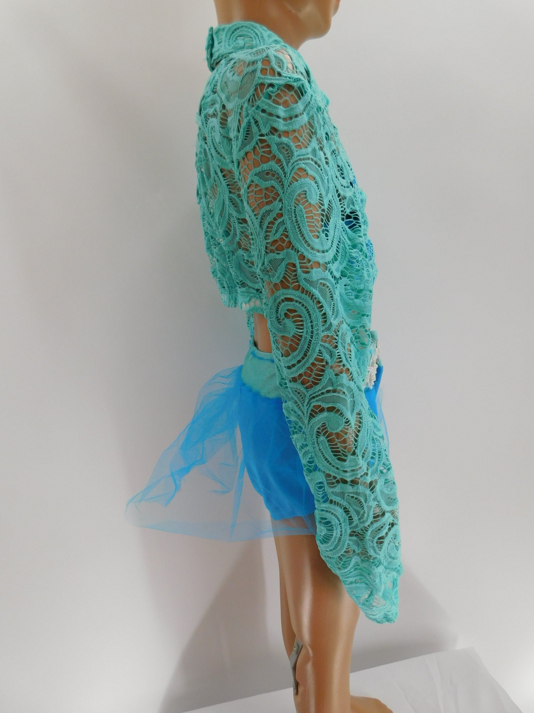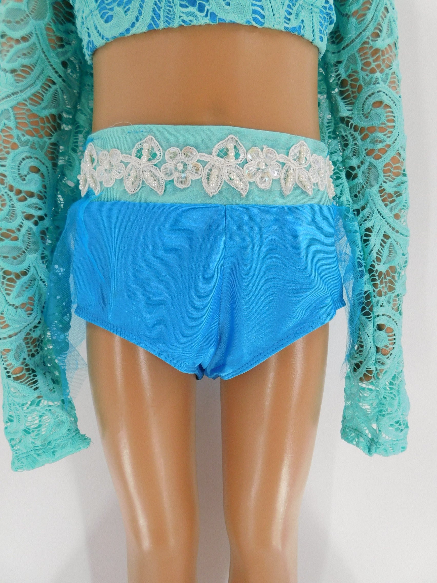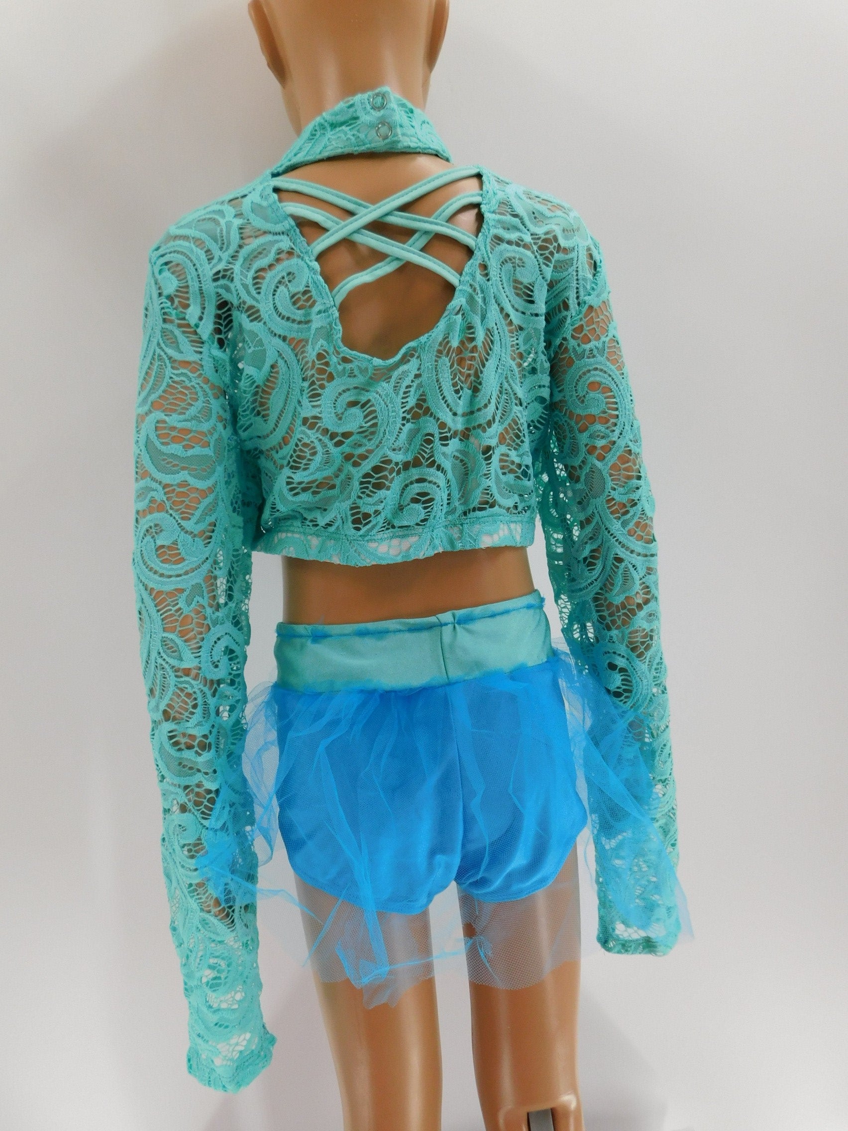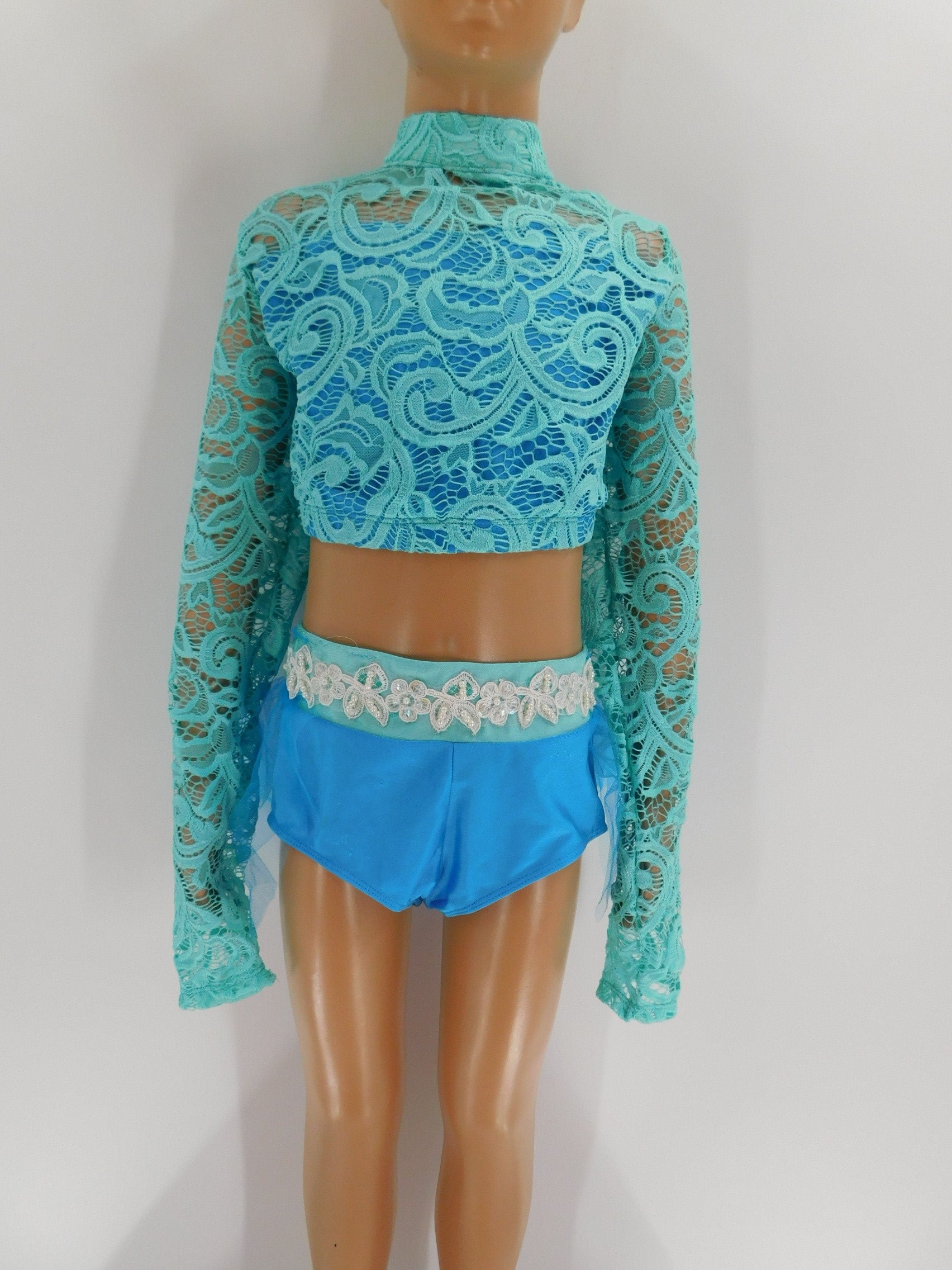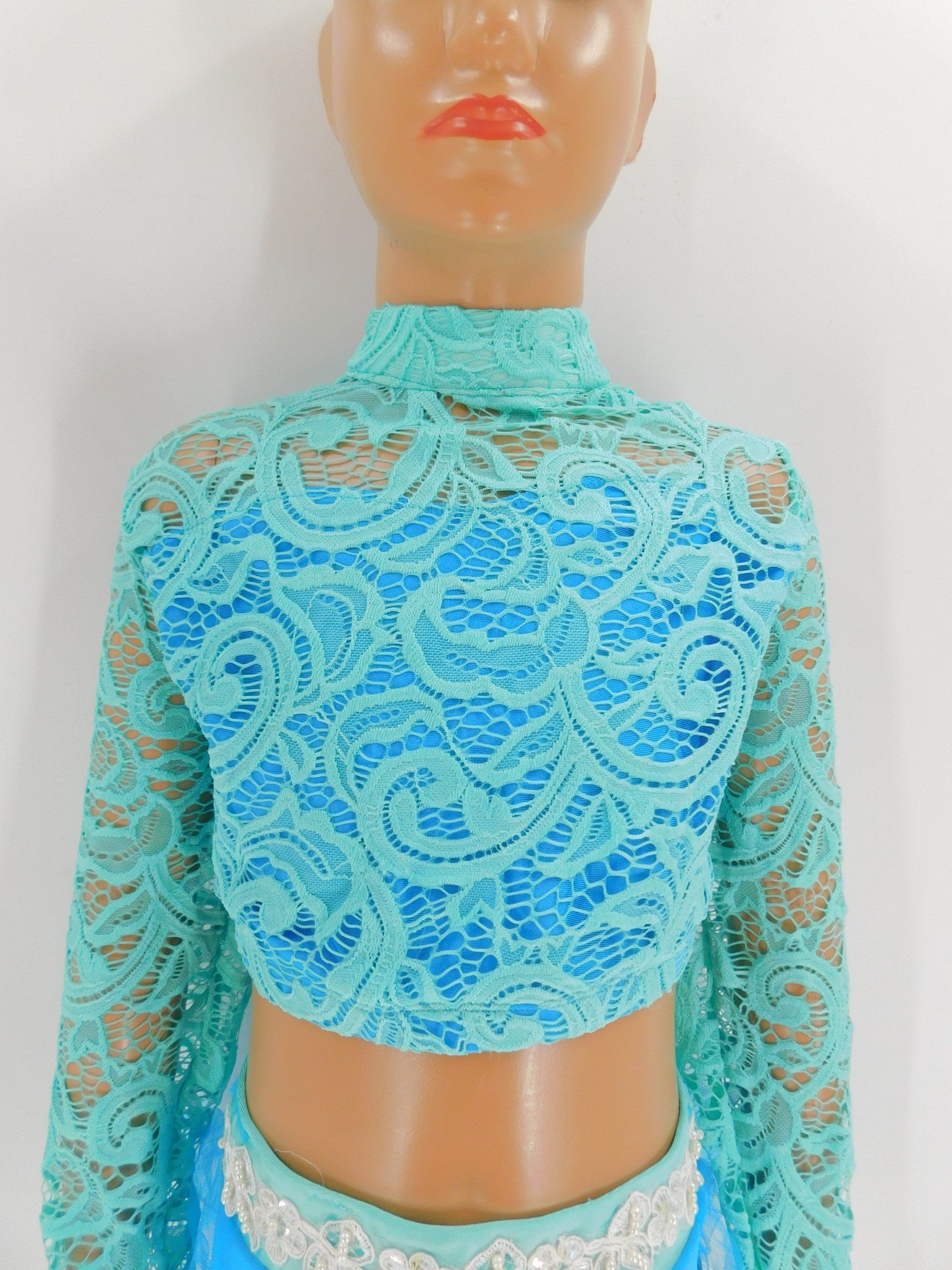 2 piece costume is teal long sleeve lace top with blue bra attached underneath. Bottoms are spandex with lace and pearl embellishment and tulle around the back.